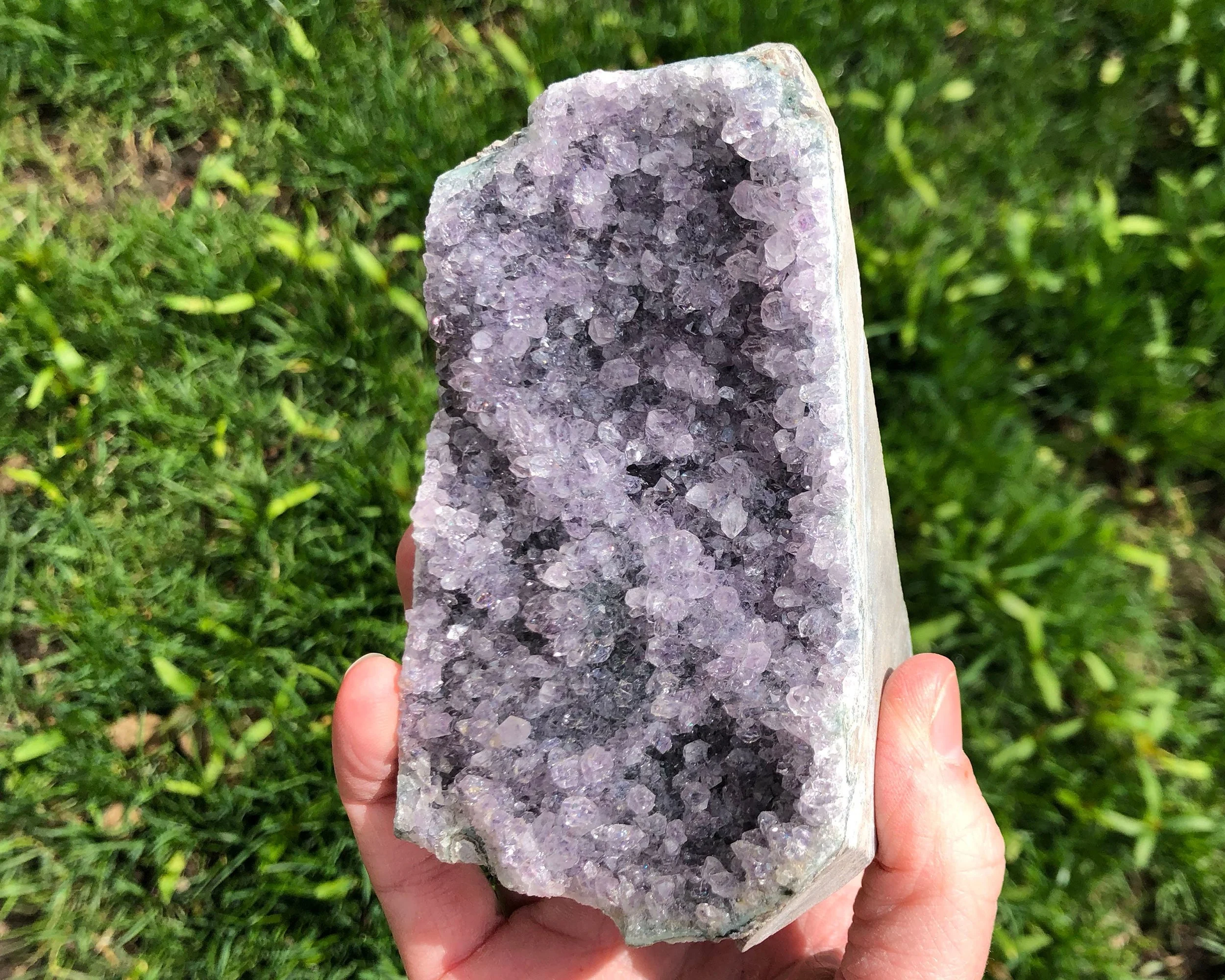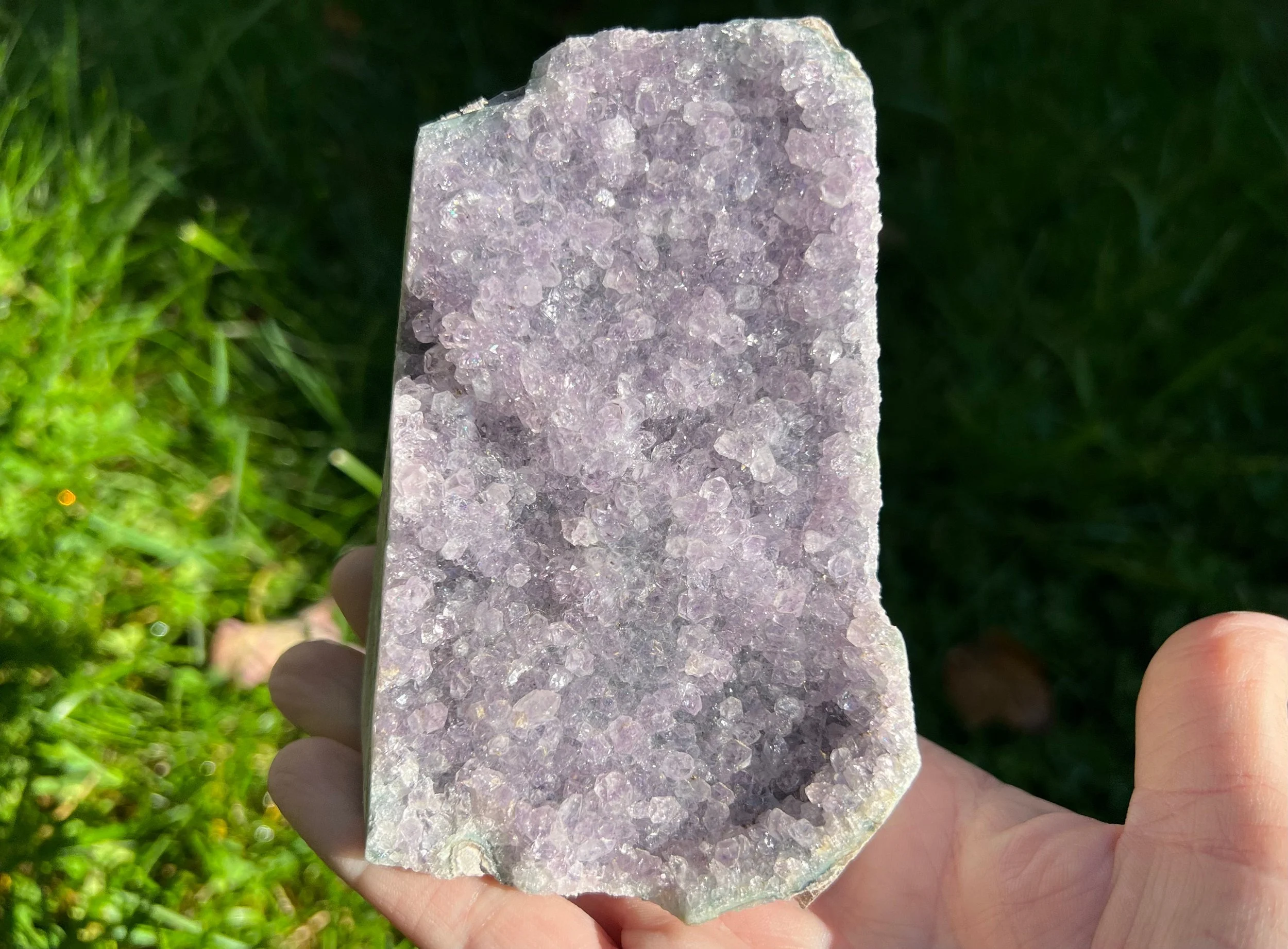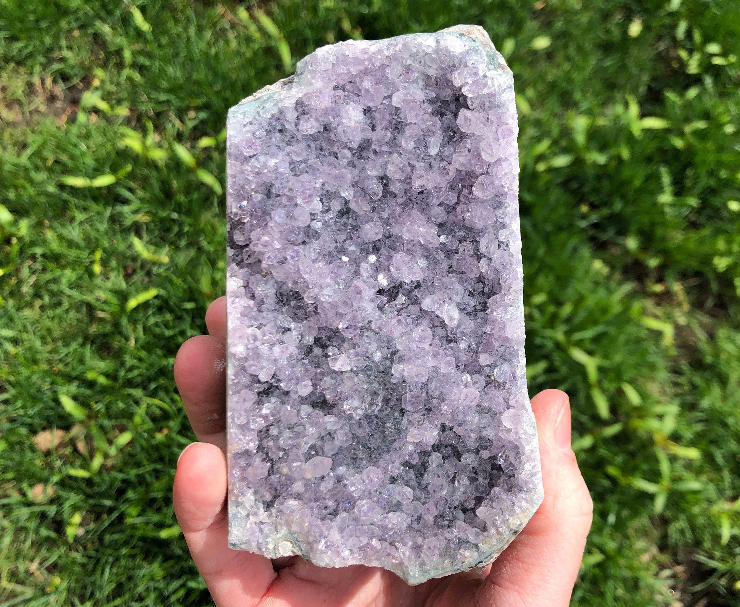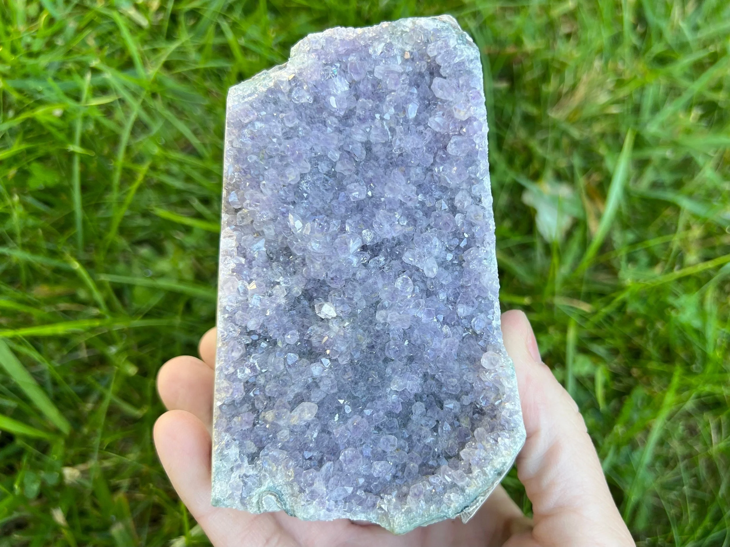 This is a very sparkly display piece of Amethyst druzy cut on the bottom so that it stands upright, It has both deep purple and clearer crystals making it look 'frosty' as well. A beautiful and fantastic piece! <3