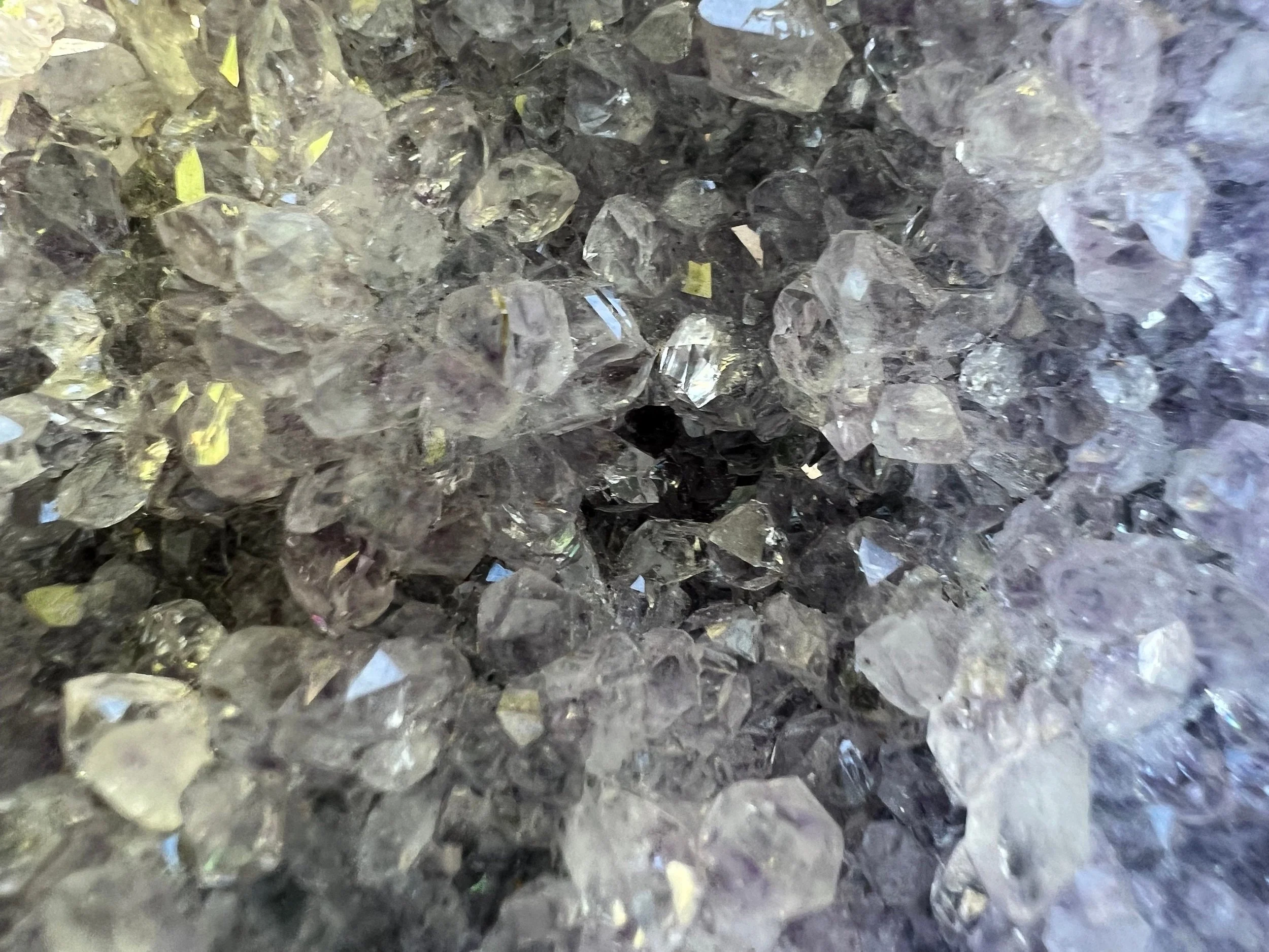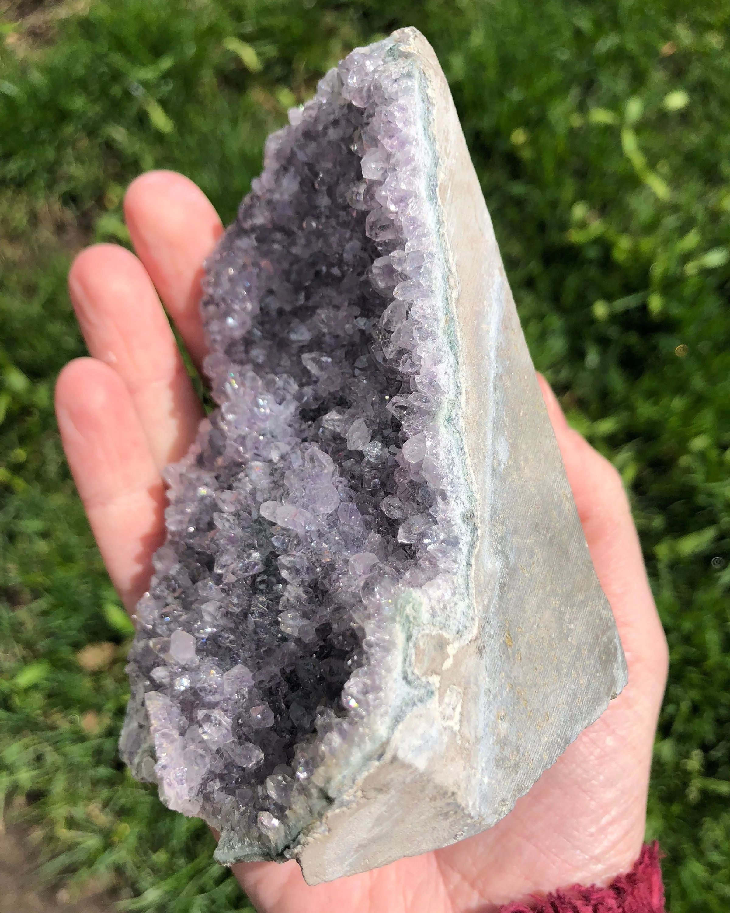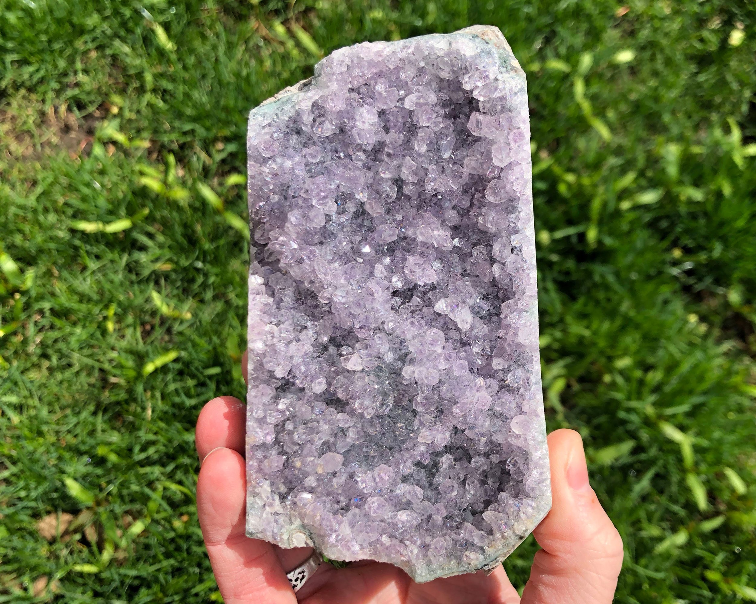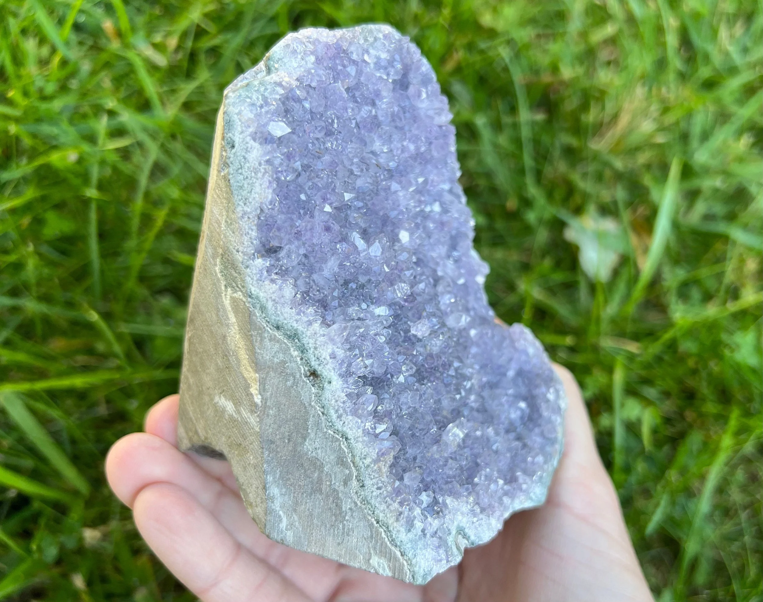This is a very sparkly display piece of Amethyst druzy cut on the bottom so that it stands upright, It has both deep purple and clearer crystals making it look 'frosty' as well. A beautiful and fantastic piece! <3