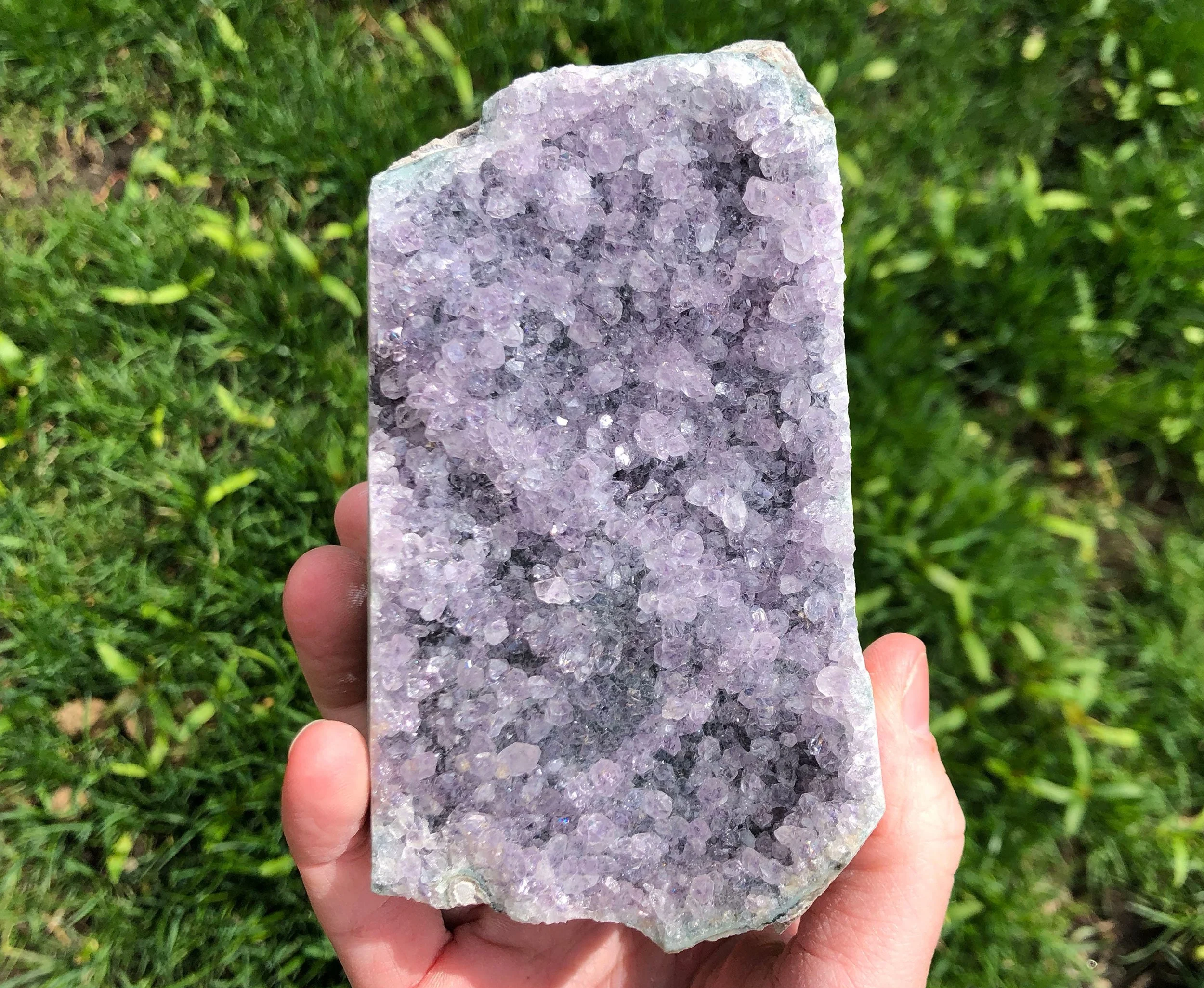 This is a very sparkly display piece of Amethyst druzy cut on the bottom so that it stands upright, It has both deep purple and clearer crystals making it look 'frosty' as well. A beautiful and fantastic piece! <3