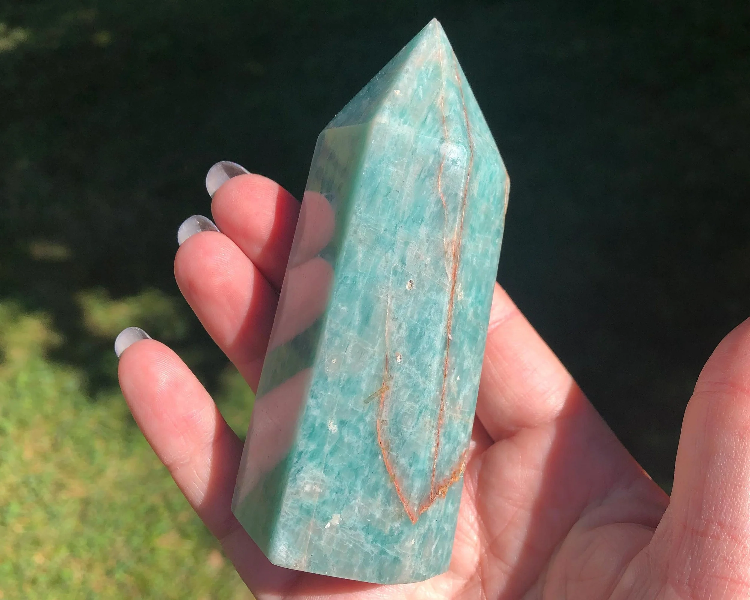 This is a beautiful and vibrant tower of vibrant Amazonite. It has a shimmer that moves with the light in it :) The color on this piece is just exquisite!