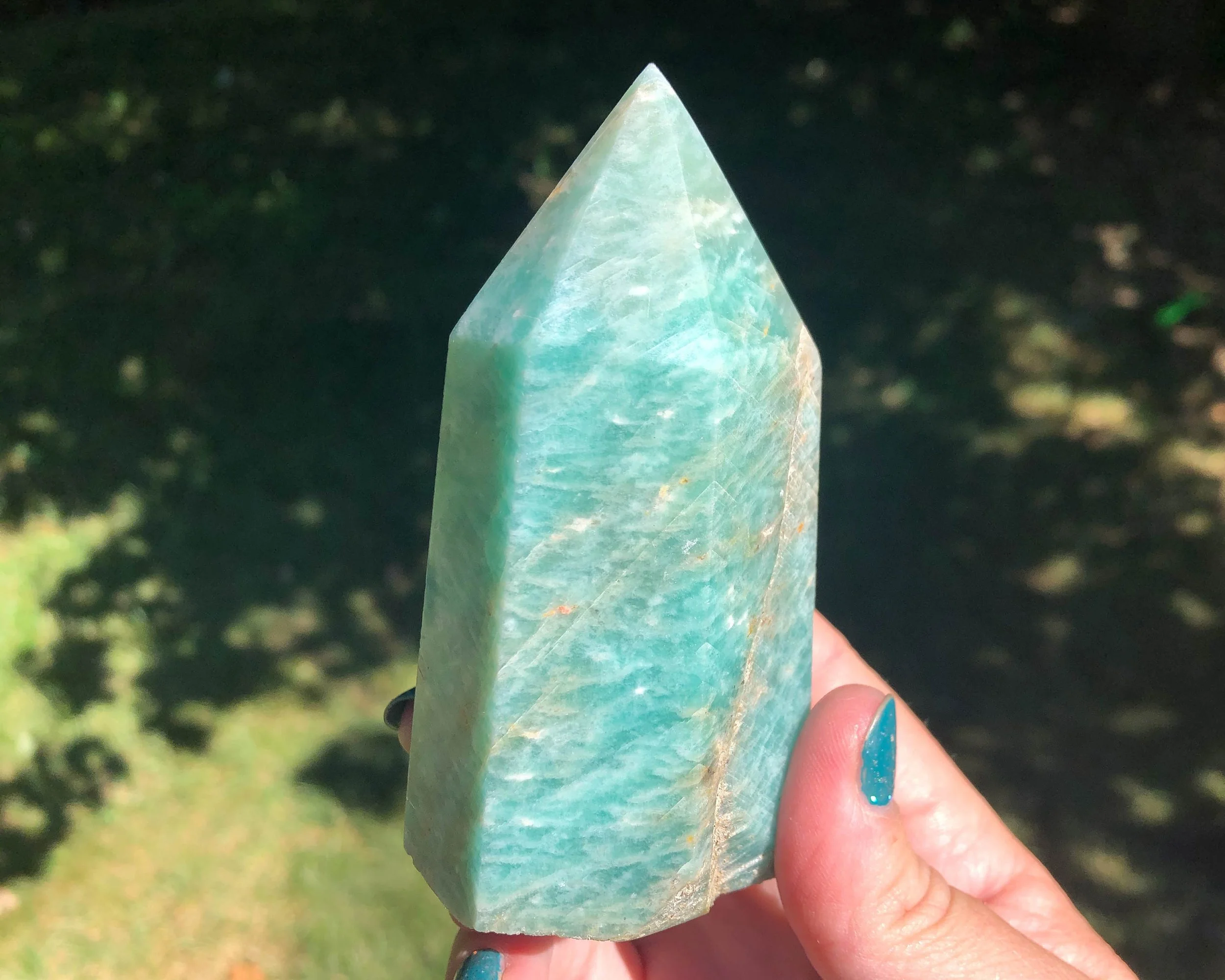 4" Amazonite Tower #2 Polished Crystal Point, Vibrant Shimmery Aqua Blue Green Feldspar, Home Decor, Witchy Gift for Her, Birthday Present