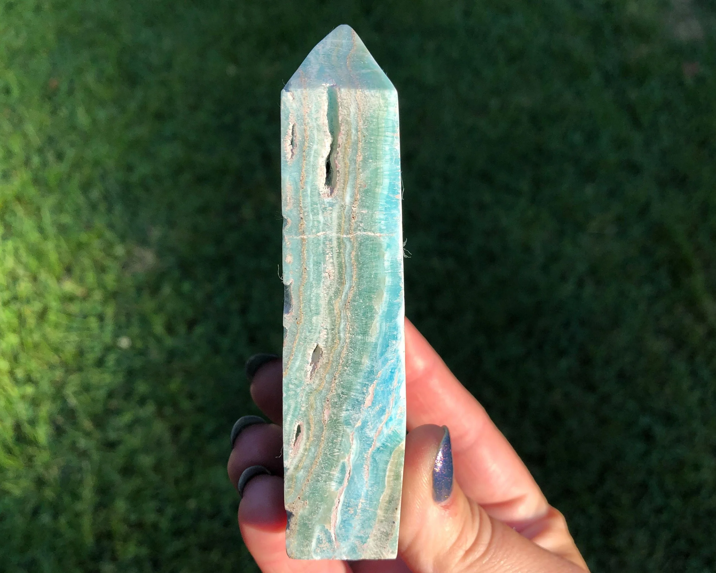 4" Blue Aragonite Crystal Tower #11 Polished Point, Aqua Blue Banded Caribbean Calcite, Gemstone Decor, Birthday Gift, Witchy Gift for Her