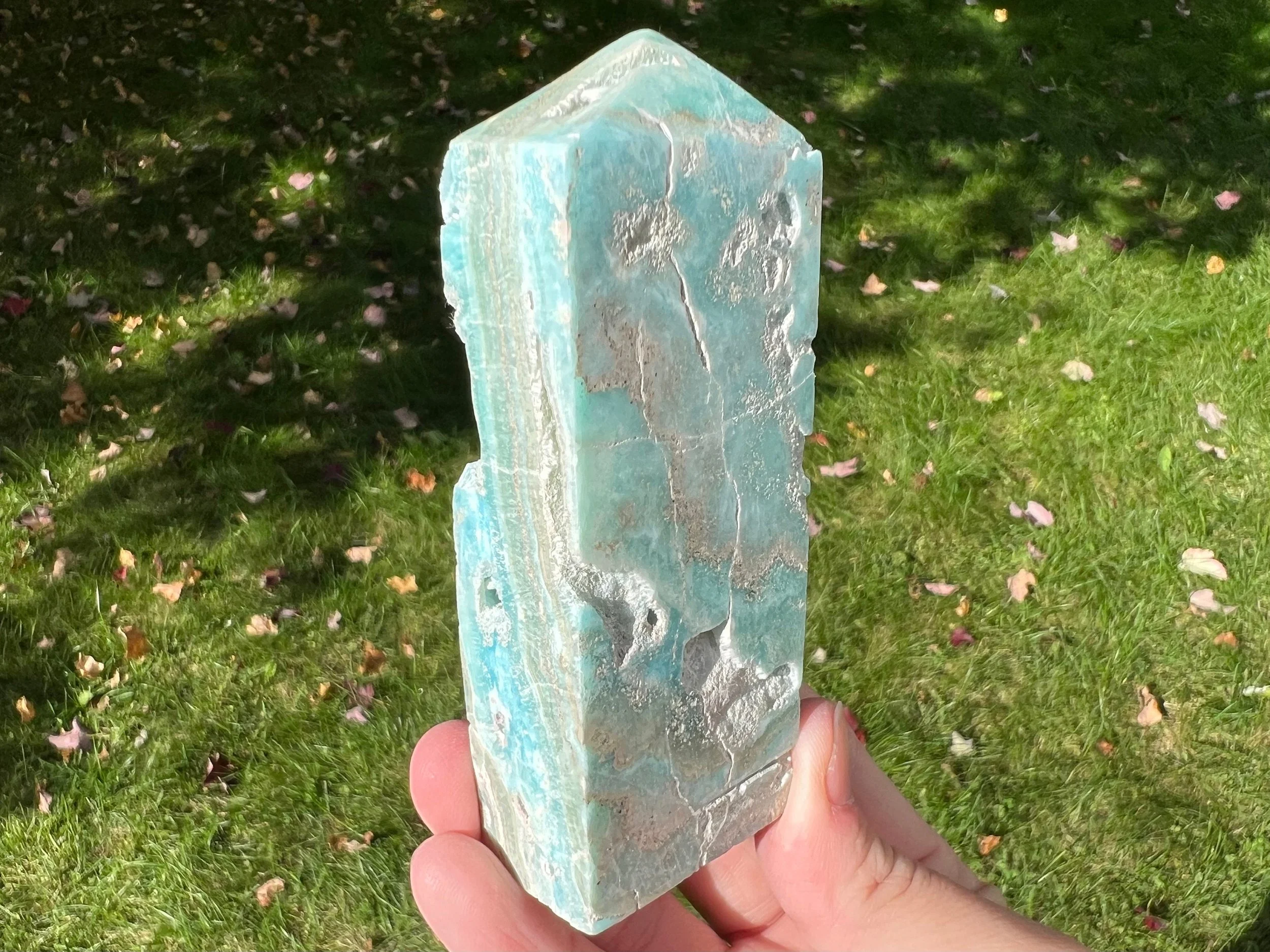 This is a tower carved from beautiful blue Aragonite or calcite - it is much debated and I don't know for sure. But it has gorgeous color banding and patterns!