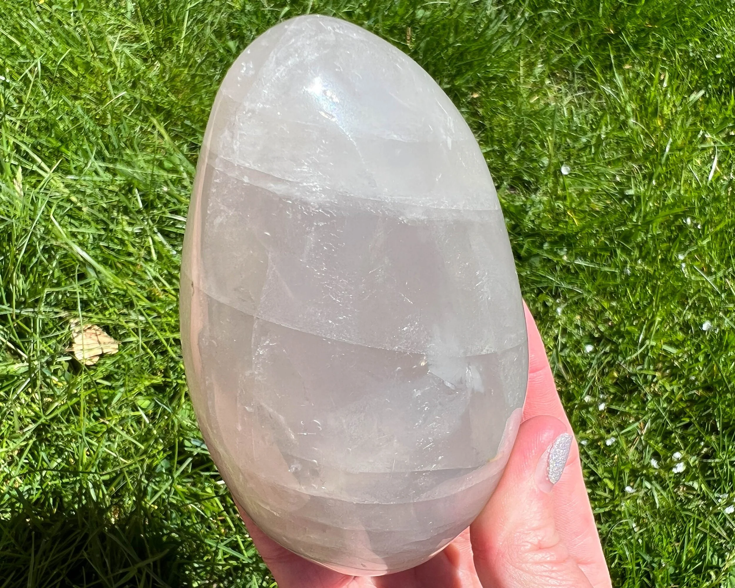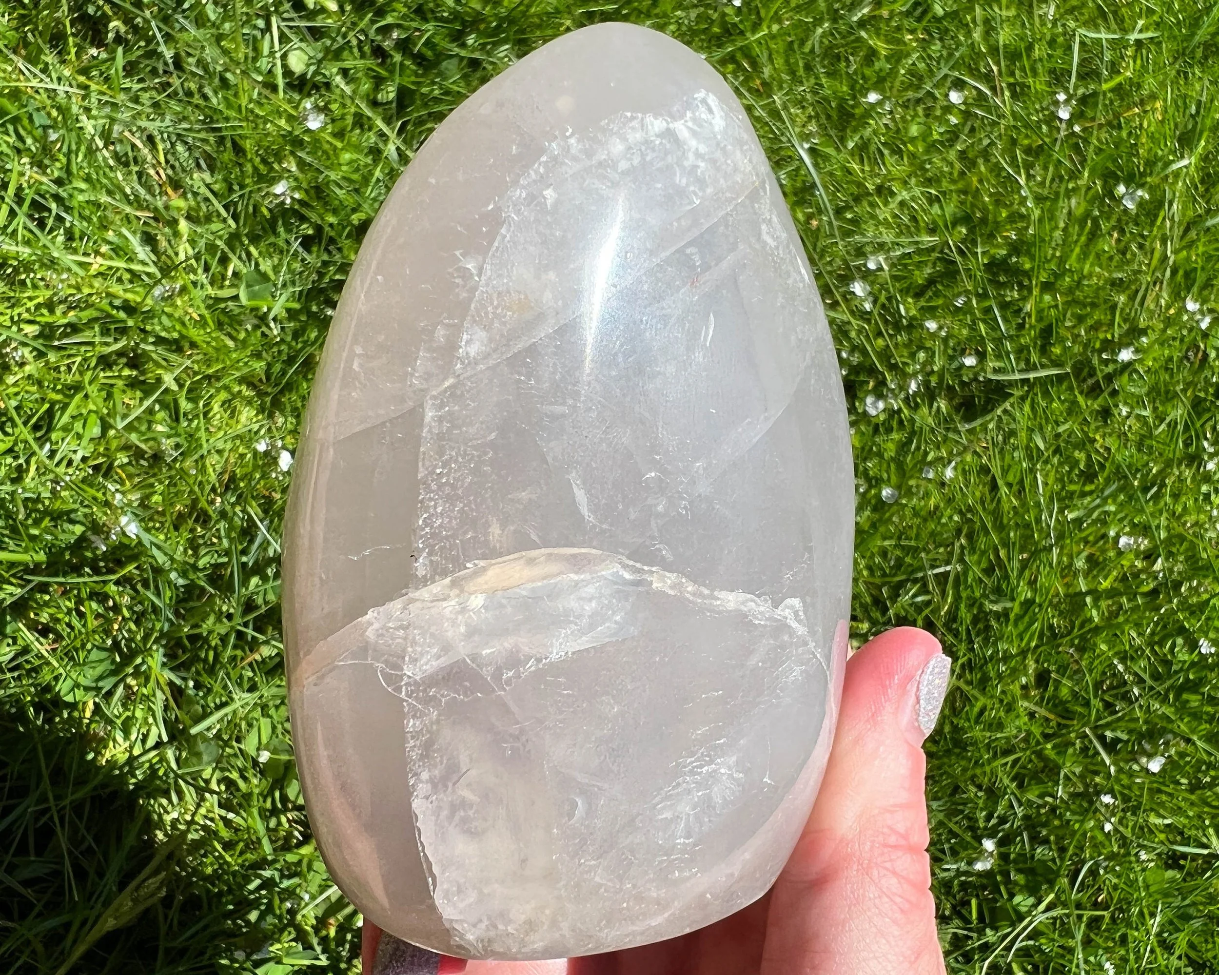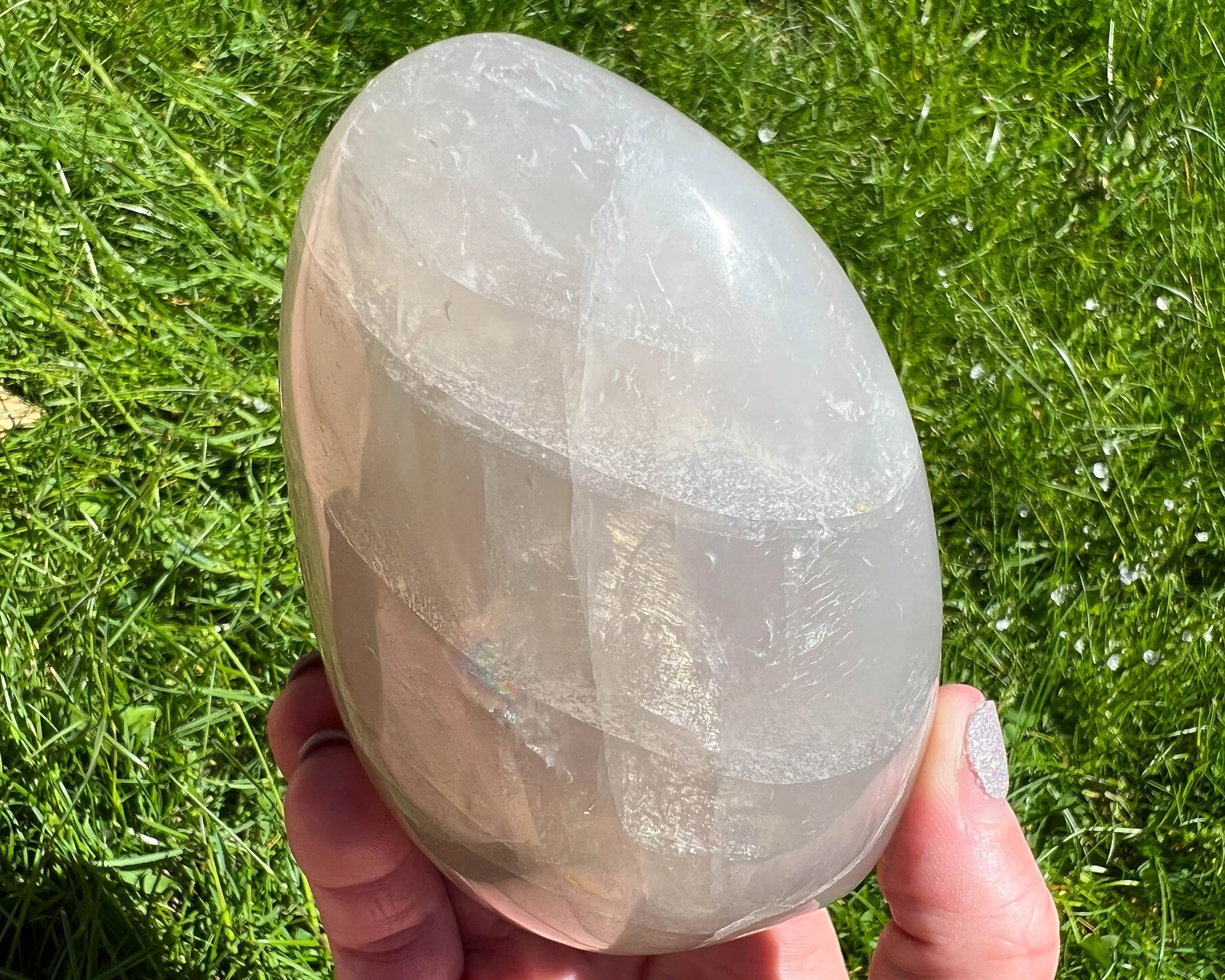 This is a large lovely crystal freeform of natural Star Blue Rose Quartz, which is a Rose Quartz that has a blue glow to it, especially in the light. It is also Star Rose Quartz, or Rose Quartz with Asterism, meaning in the light lines move through it - when round, the lines meet in an asterisk or star shape. It is full of rainbows, sheen and light. It is polished and self standing. :)