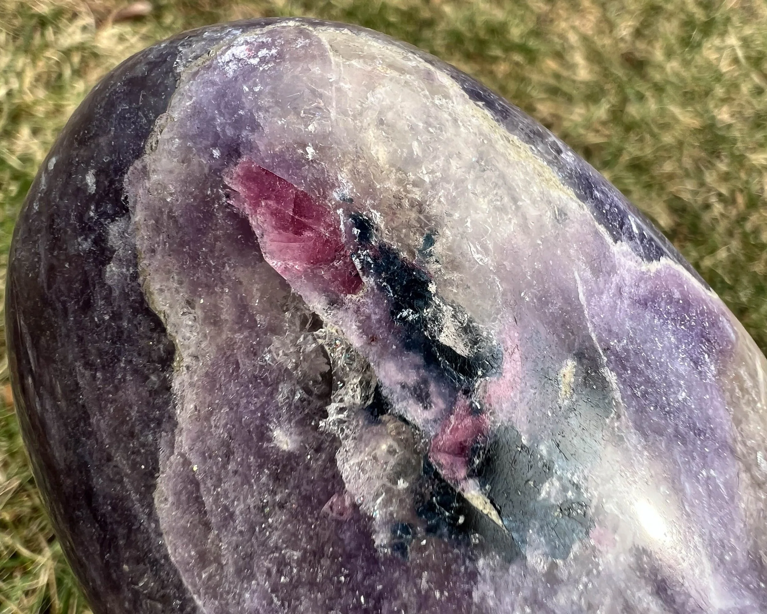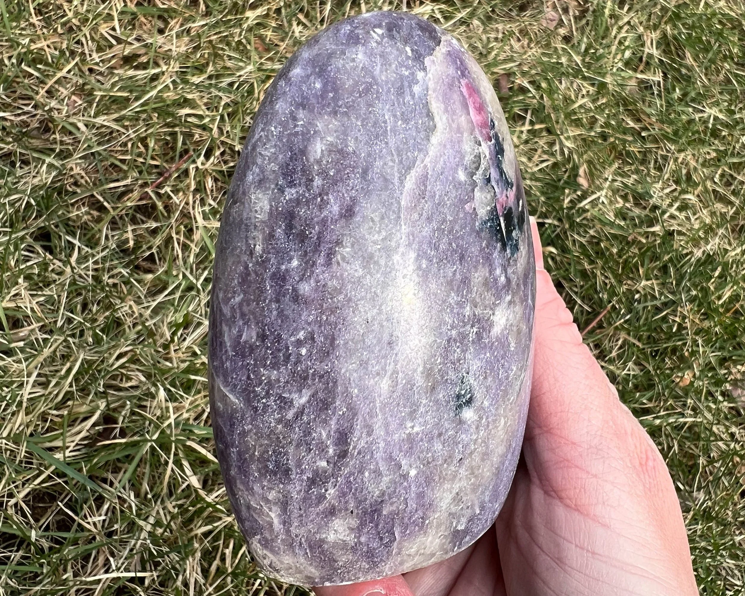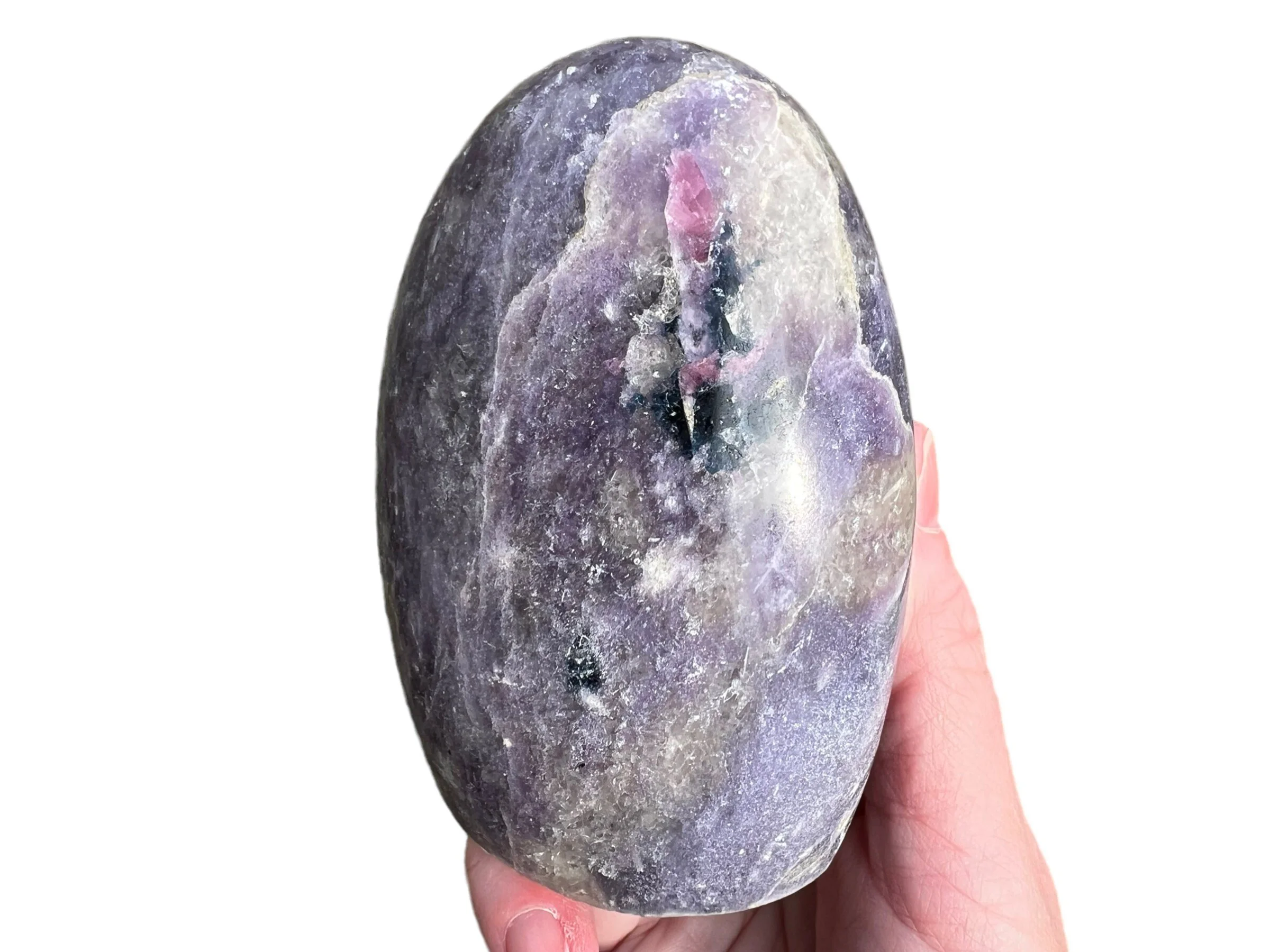 This is a lovely self standing polished crystal freeform of Lepidolite with pink and blue Tourmaline, Smoky Quartz and Cleavelandite, a combination that is also called Unicorn Stone. This one has a good amount of the deep blue Tourmaline which makes it extra special.