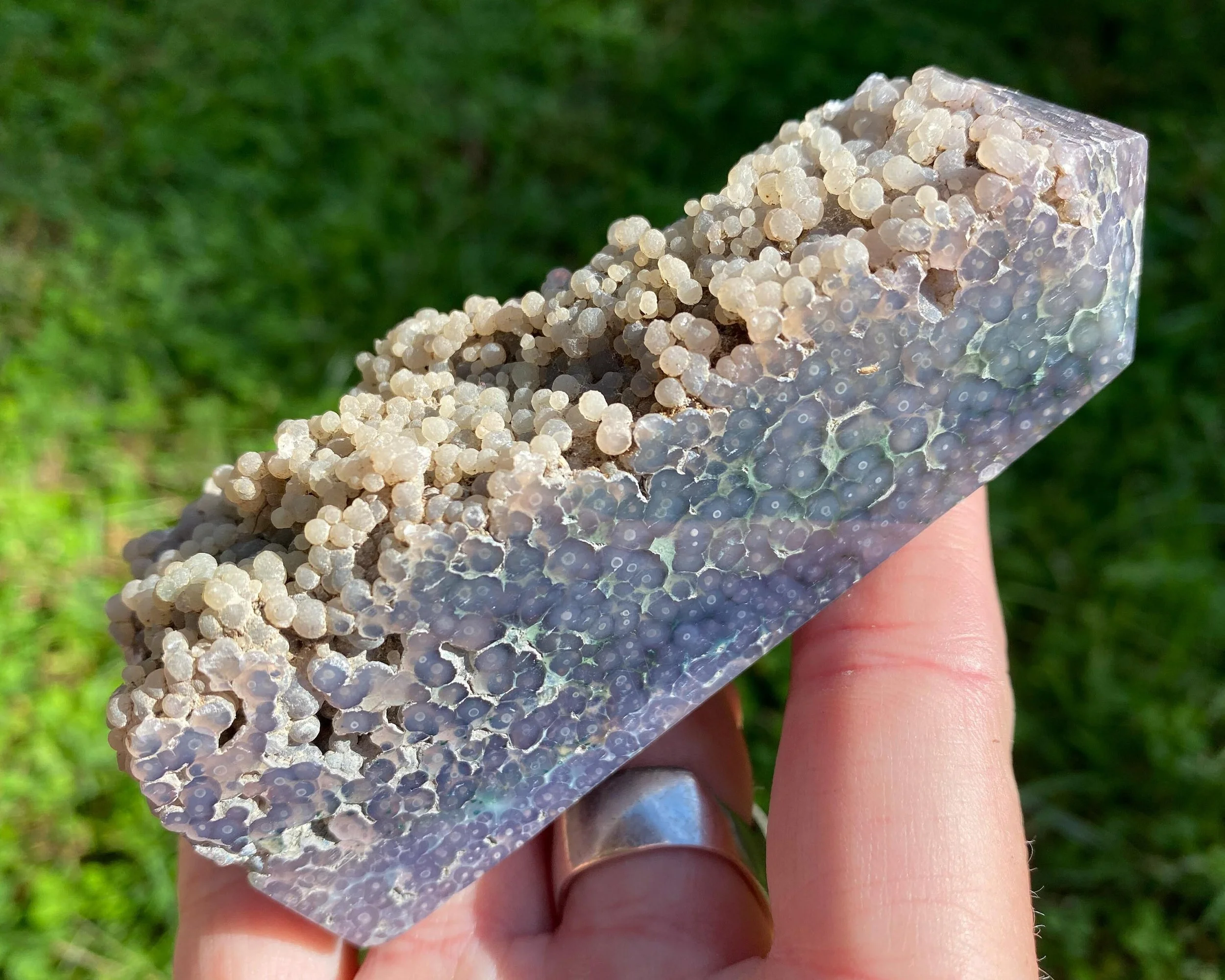 This is a beautiful semi-polished sparkly Grape Agate tower, also known as purple and green Botryoidal Chalcedony with Druzy Quartz. It comes from Indonesia and is not enhanced or dyed. The druzy can be very sparkly, and some has a shiny, velvety look to it. The polished area has very cool patterns with beautiful colors. Gorgeous all around!