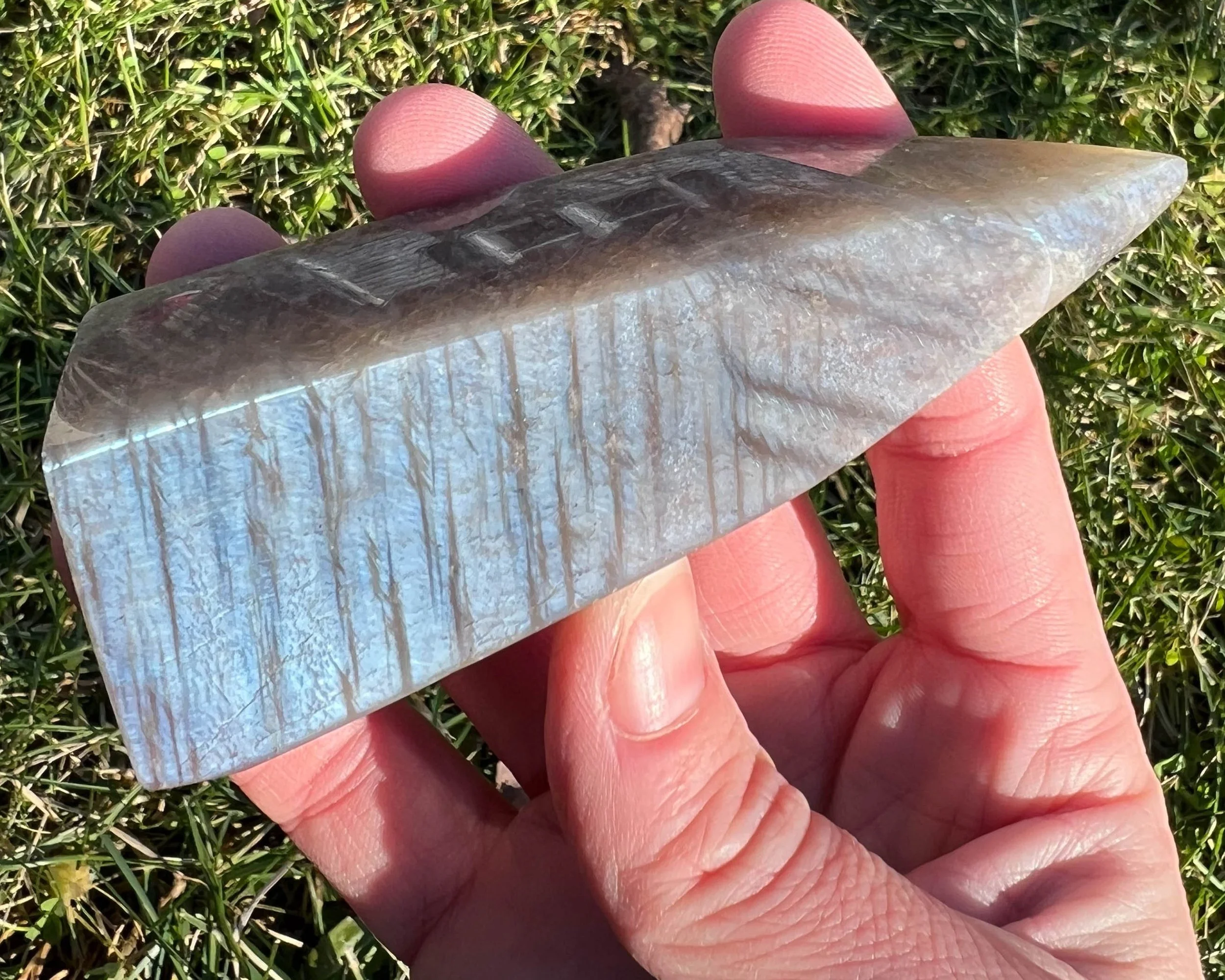 This is a beautiful combination of Moonstone with bright blue flash called adularescence and Sunstone with sparkly rainbow and orange "confetti" schiller also called aventurescence, which is tiny plates of Hematite inside the stone. In some places it is more orange, and in some it is more rainbow / multicolored. It is also called Belomorite. This material is from Russia. Carved and polished into a beautiful flashy freeform that can lay or stand on one of the multiple flat sides. This is a gorgeous, high quality piece with flash and sparkle throughout almost the entire thing.