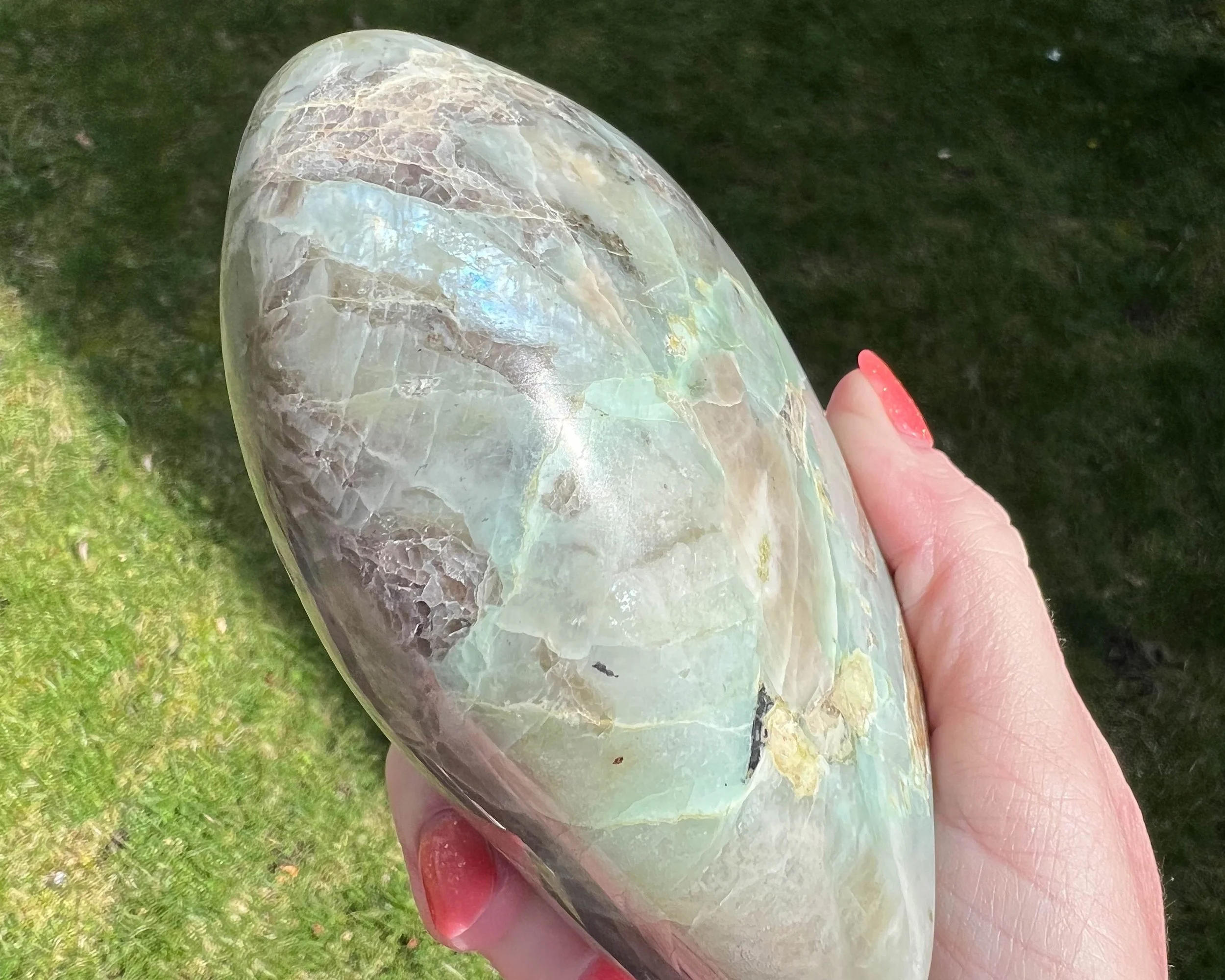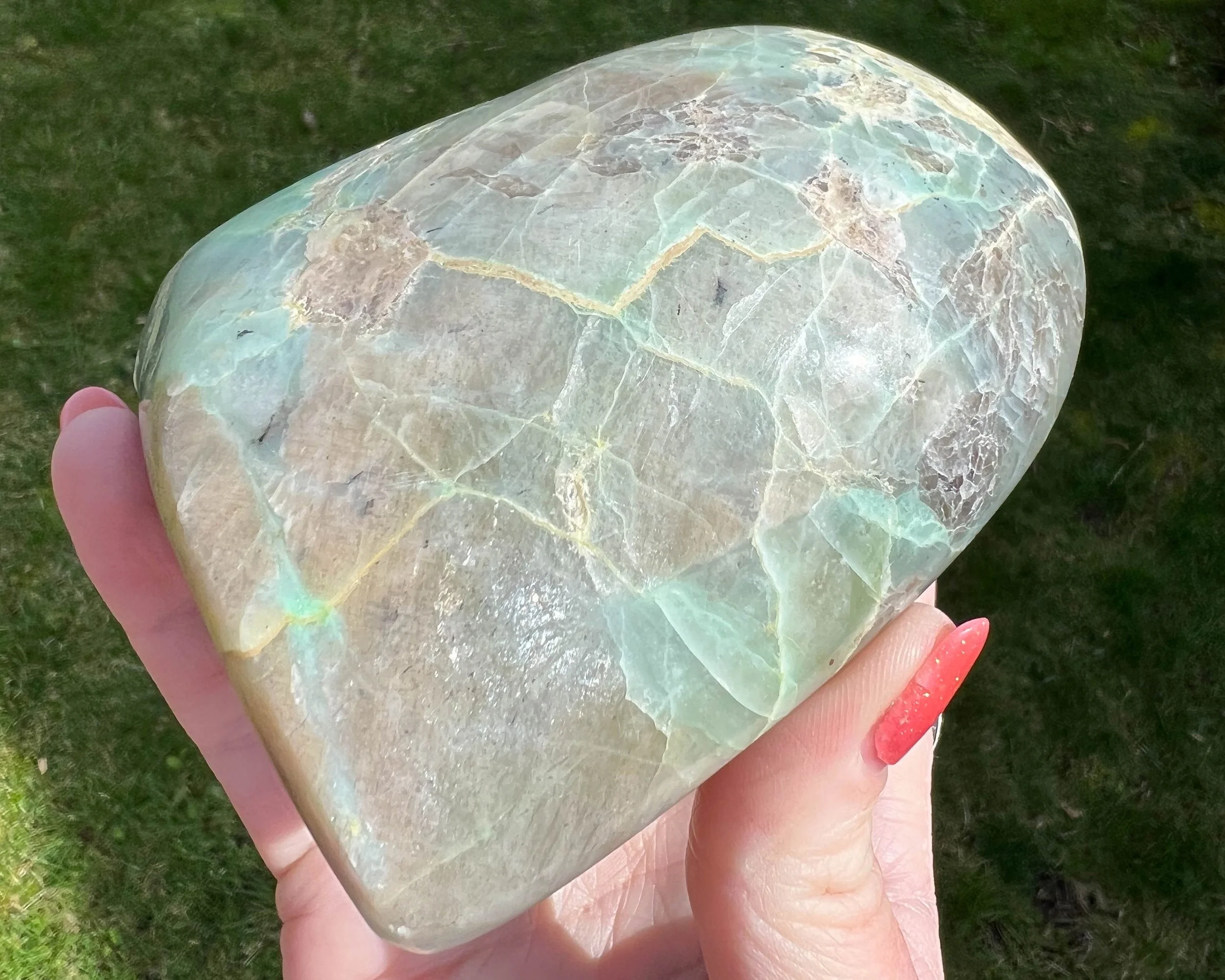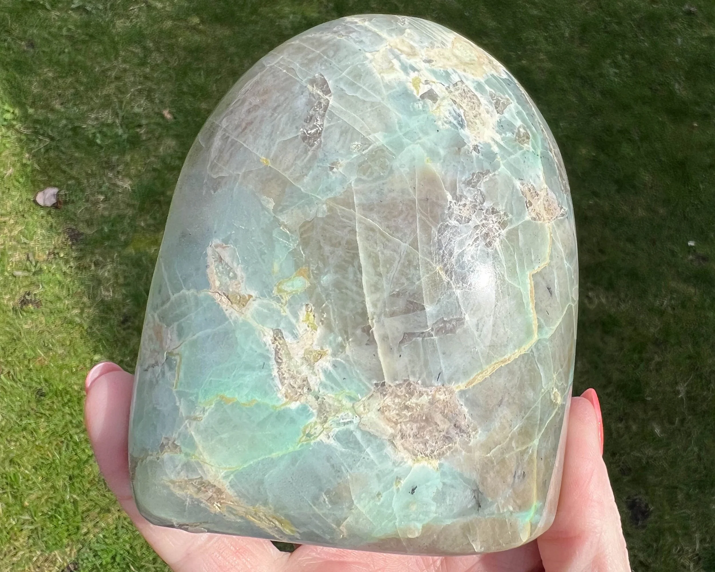 4.2" Garnierite Freeform with Blue Flash, Large Green Moonstone, Smoky Quartz, Polished Gemstone, Self Standing, Home Decor Gift for Her #2