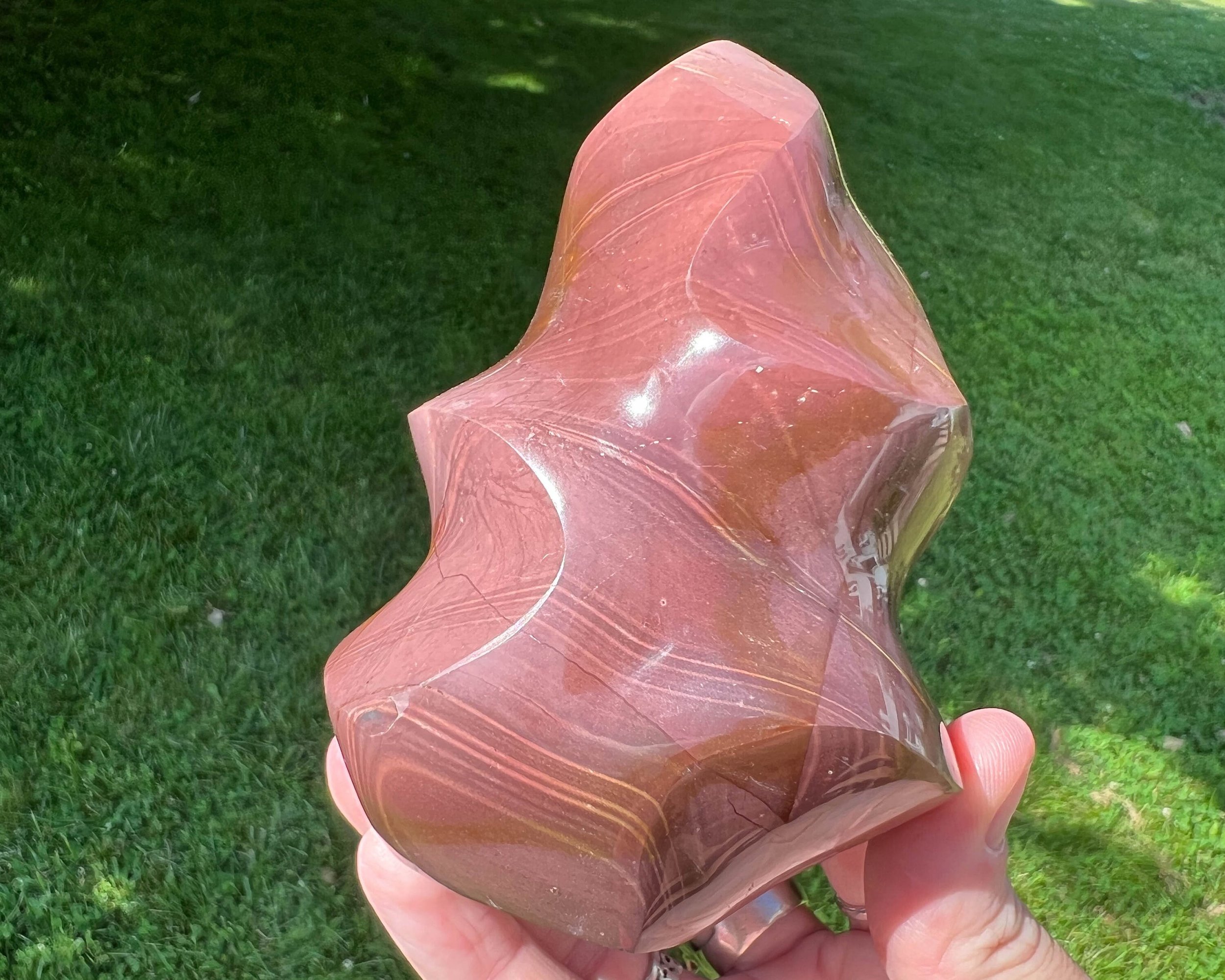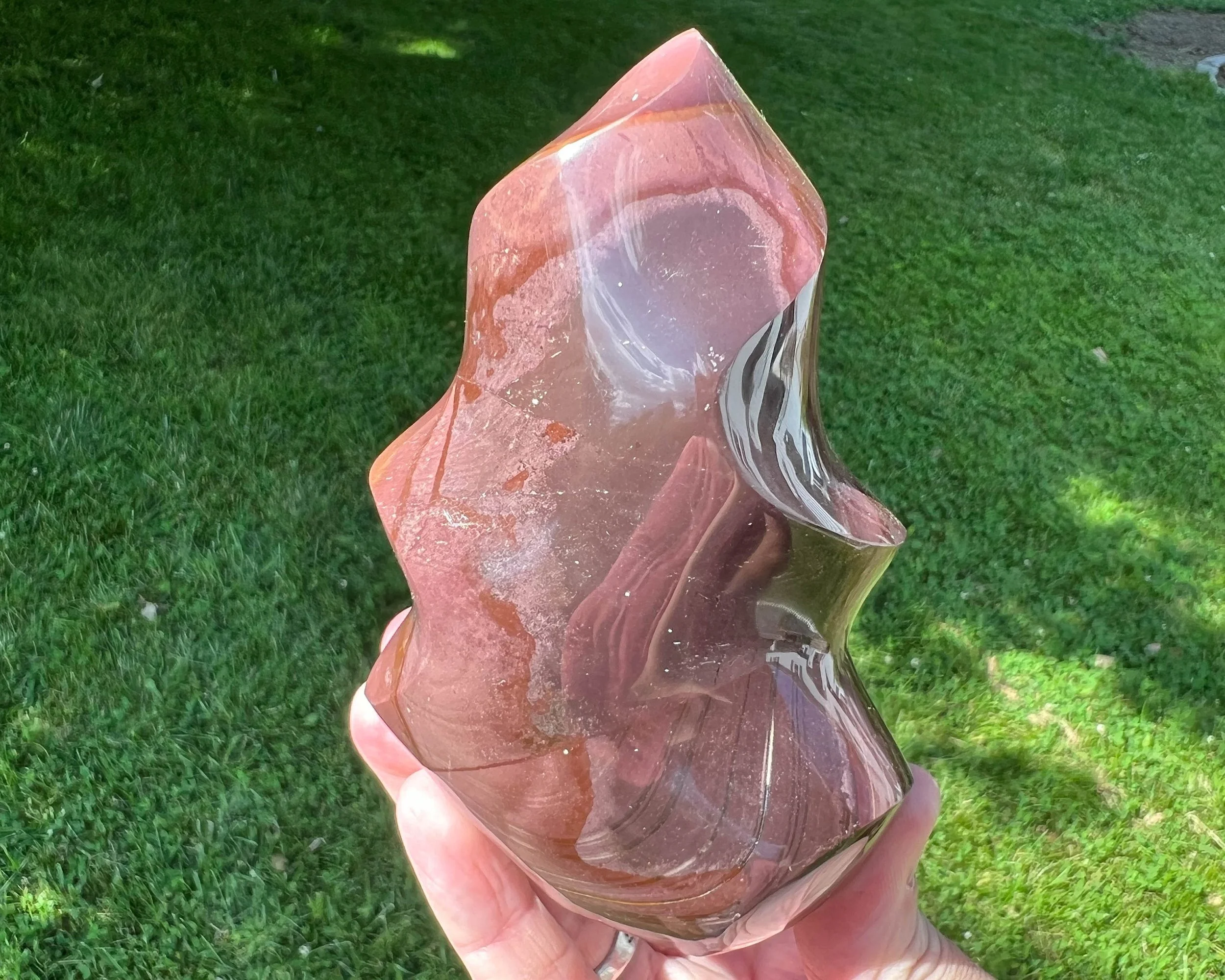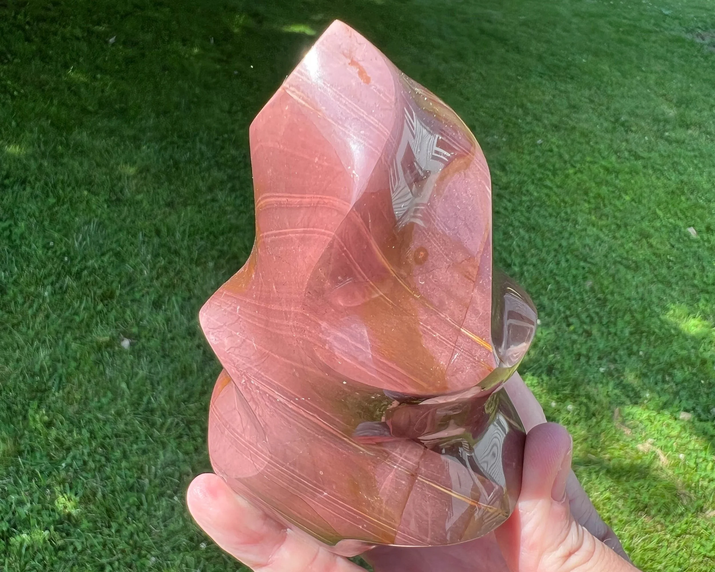 This is a beautiful and bold crystal flame carved from Polychrome Jasper. It I polished and self standing. It has lovely hues of pink and purple. A great piece of natural stone decor.