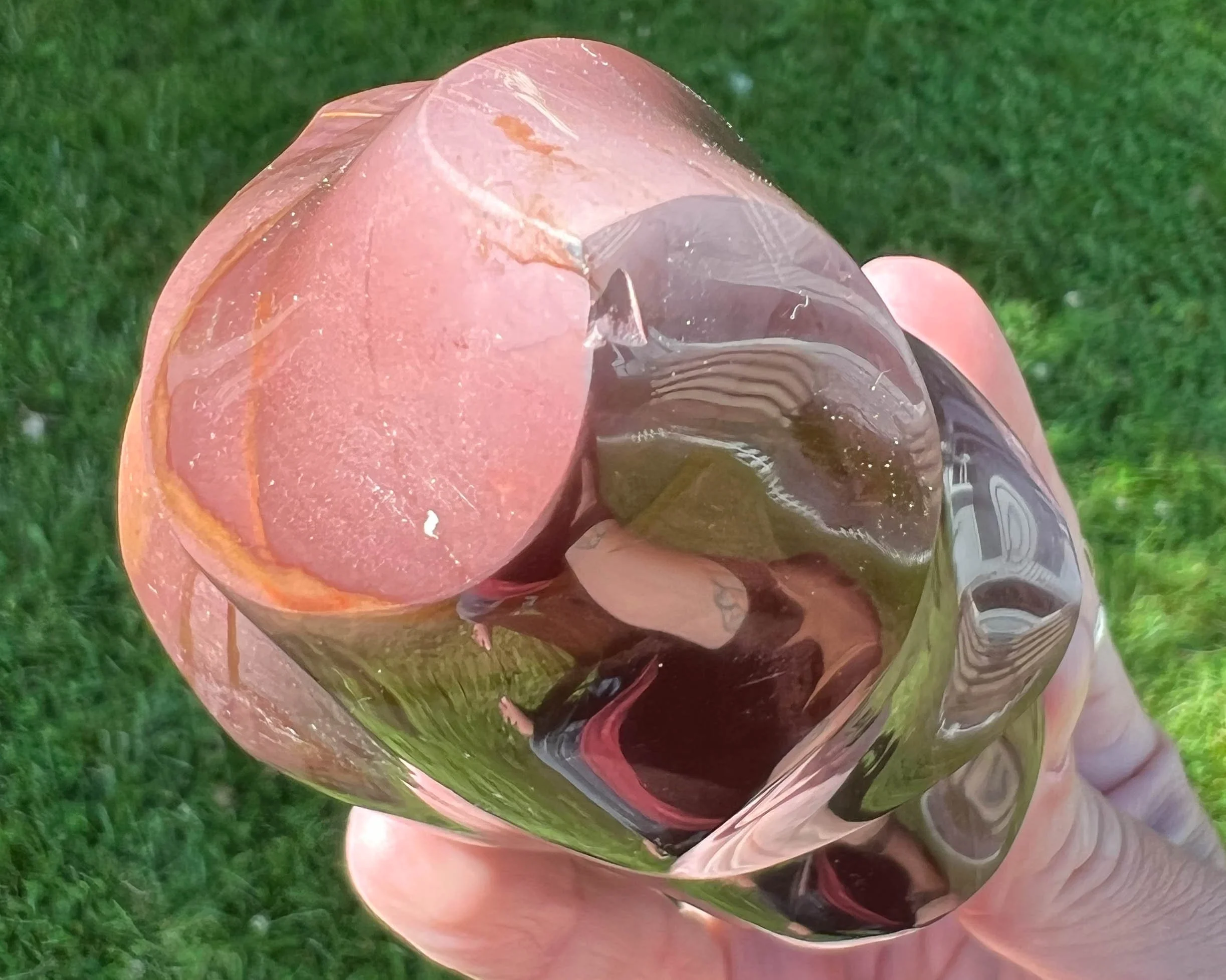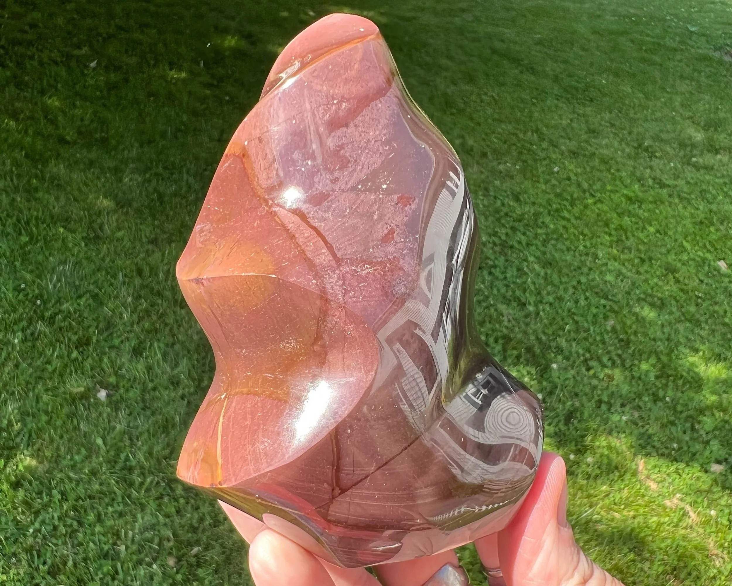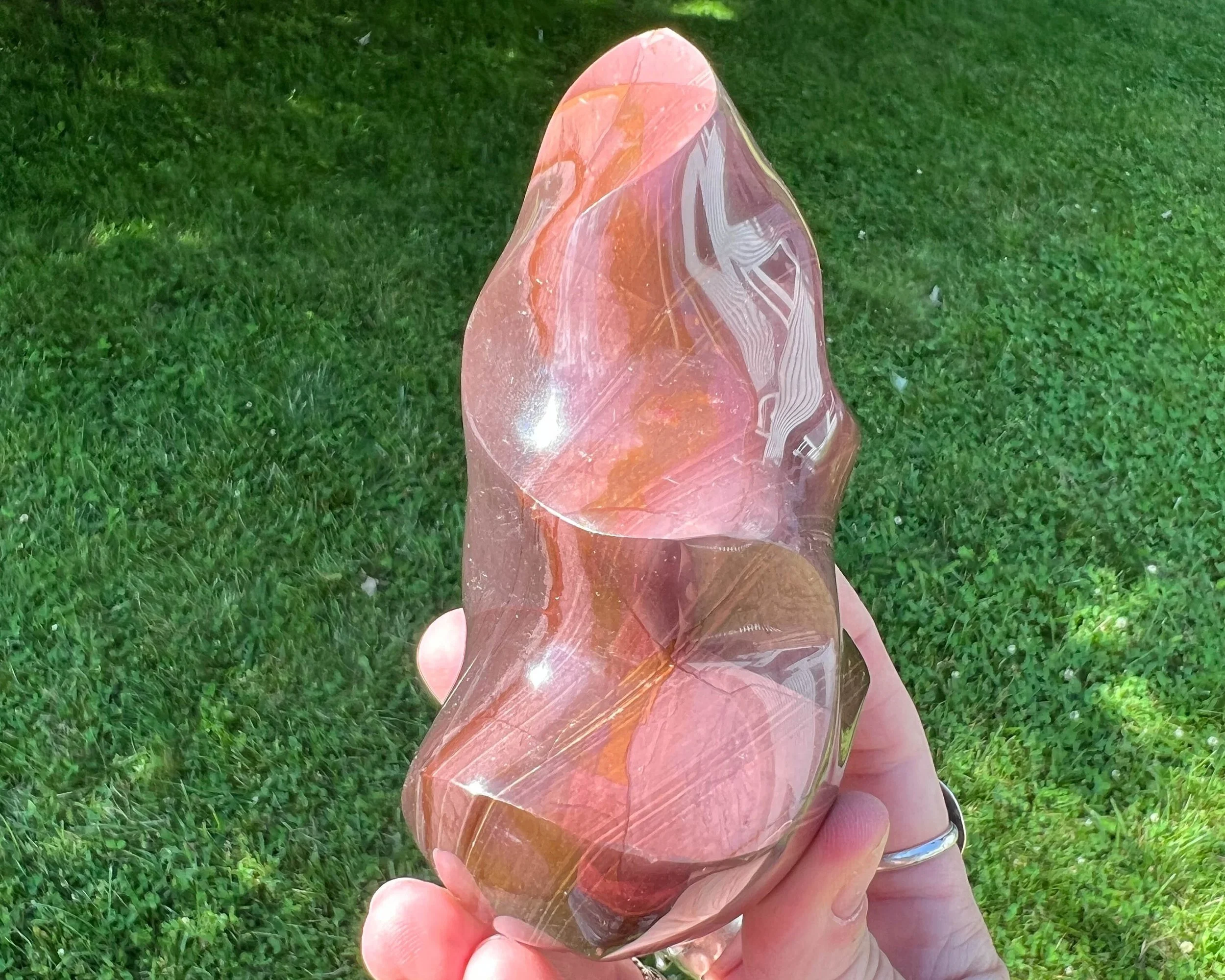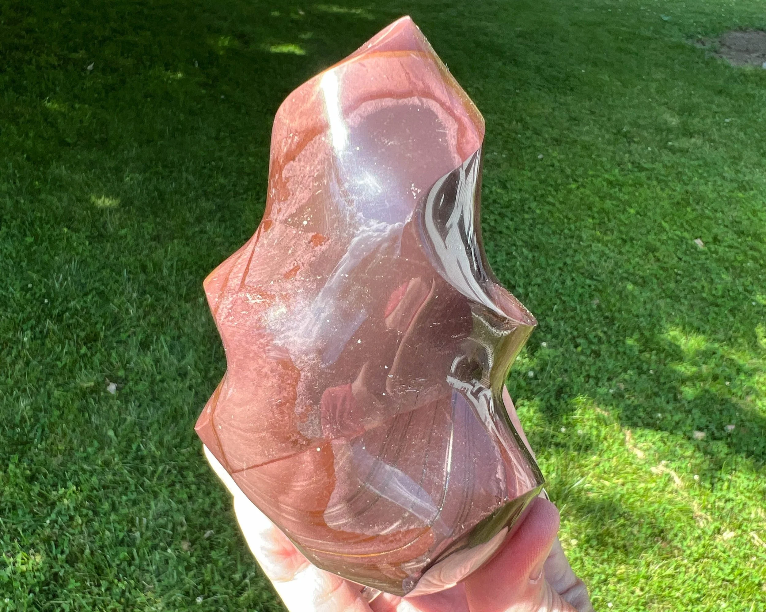 This is a beautiful and bold crystal flame carved from Polychrome Jasper. It I polished and self standing. It has lovely hues of pink and purple. A great piece of natural stone decor.