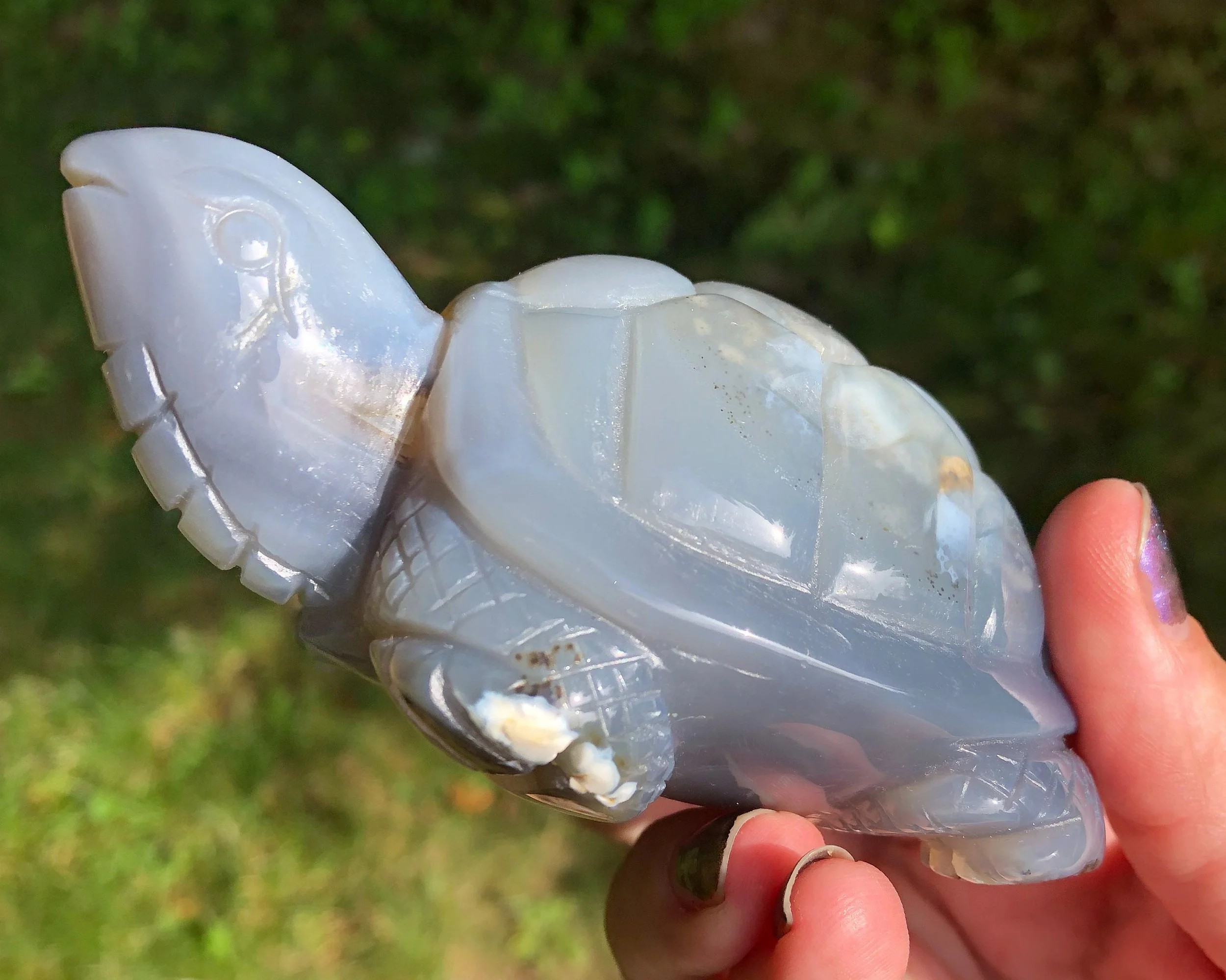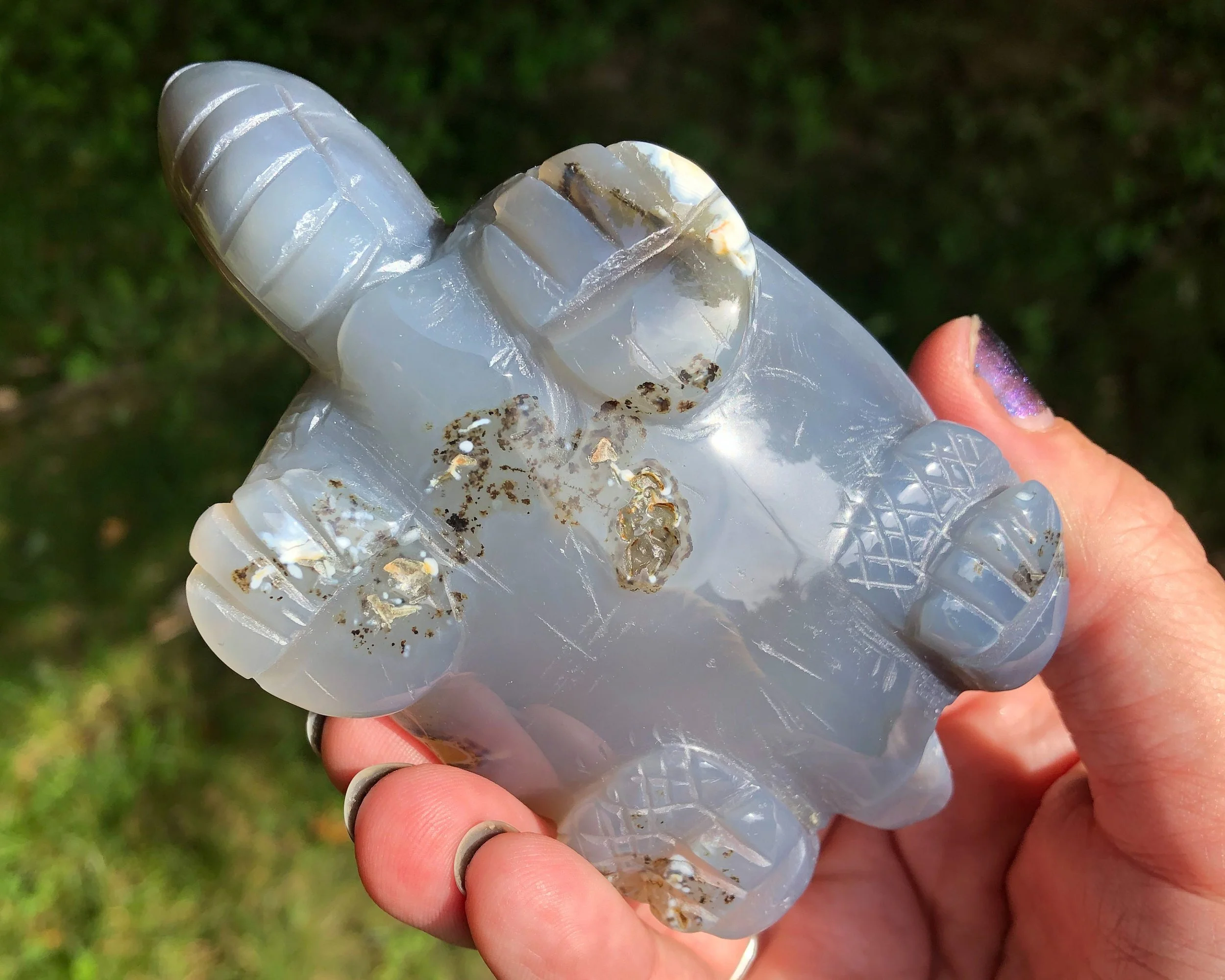 This is a lovely large Agate turtle carving with lots of detail top to bottom. He has a calm gray coloring with crystalline Quartz. There is some banding and some mossy inclusions as well.