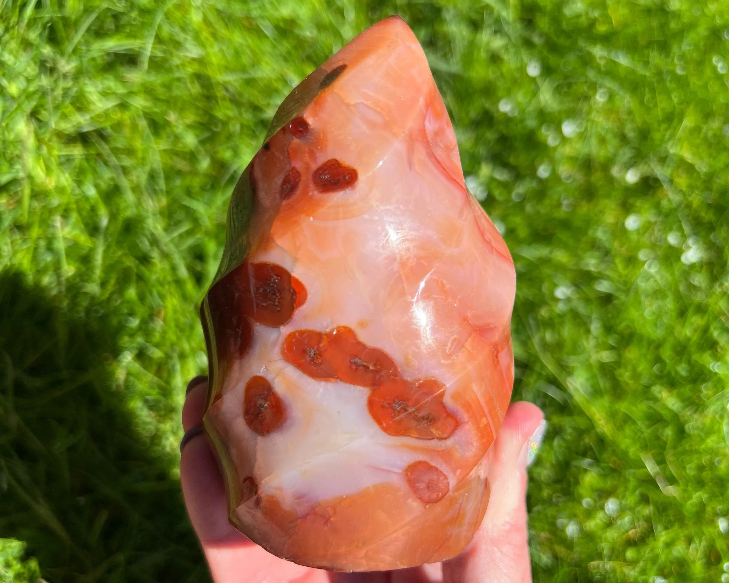 This is a Carnelian Agate Flame or spiral carving with vibrant coloring of reds, oranges, yellows and whites. It has beautiful patterns throughout. It has a pocket of tiny Quartz crystals surrounded by lots of pretty banding and on the opposite side deep red Agate 'eyes' against contrasting white and light orange. You get the best of both patterns in this beautiful Carnelian Agate crystal. It is polished and self standing.