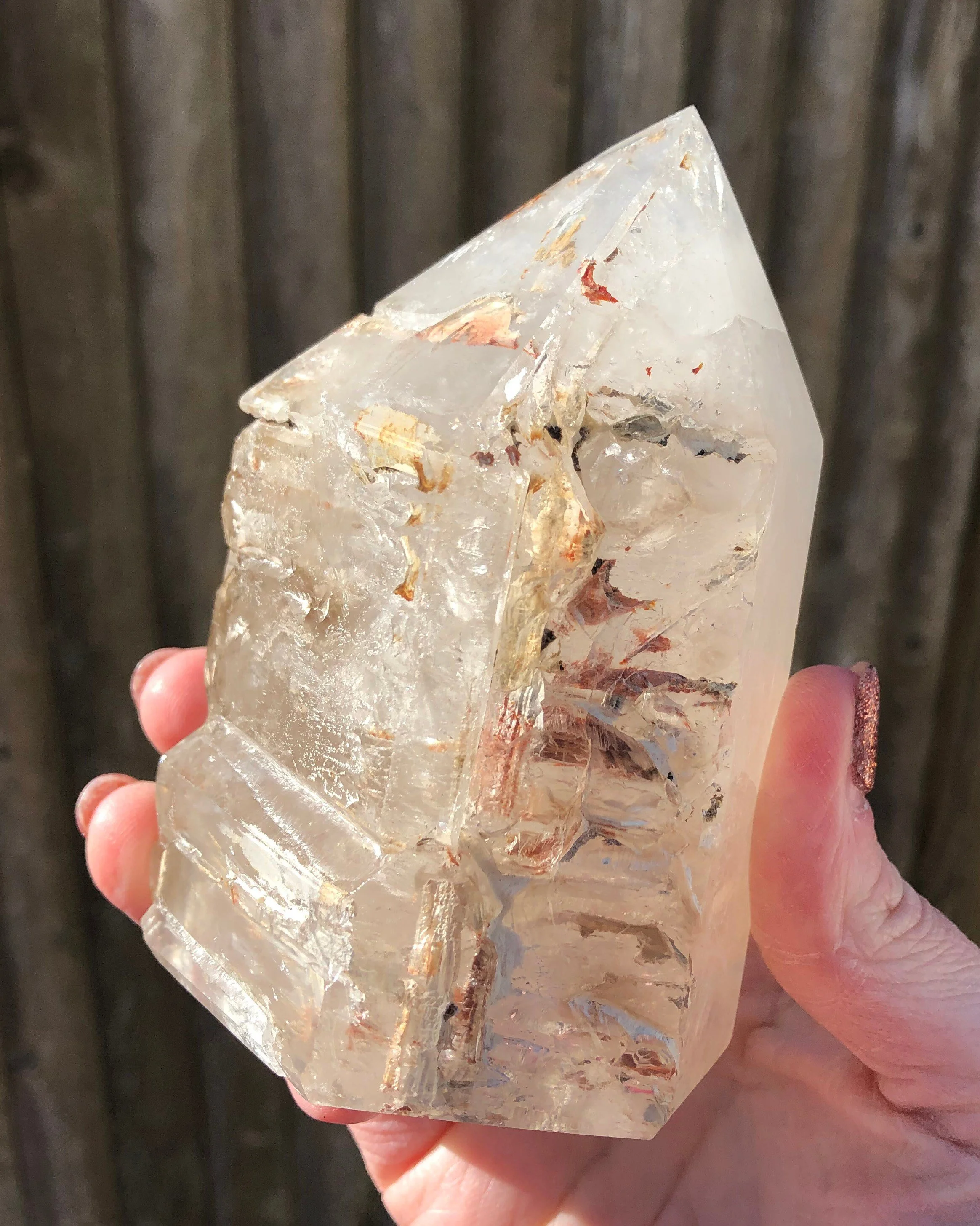 This is a semi polished, natural Elestial Quartz with lots of beautiful inclusions and Skeletal growth habit, and pretty smoky zoning. Lots of hollows and some pretty pink and white inclusions inside! This one is extra cool because on one side it looks like a smooth, polished, light Smoky Quartz crystal and on the other side is all the elestial / skeletal formations! From Brazil