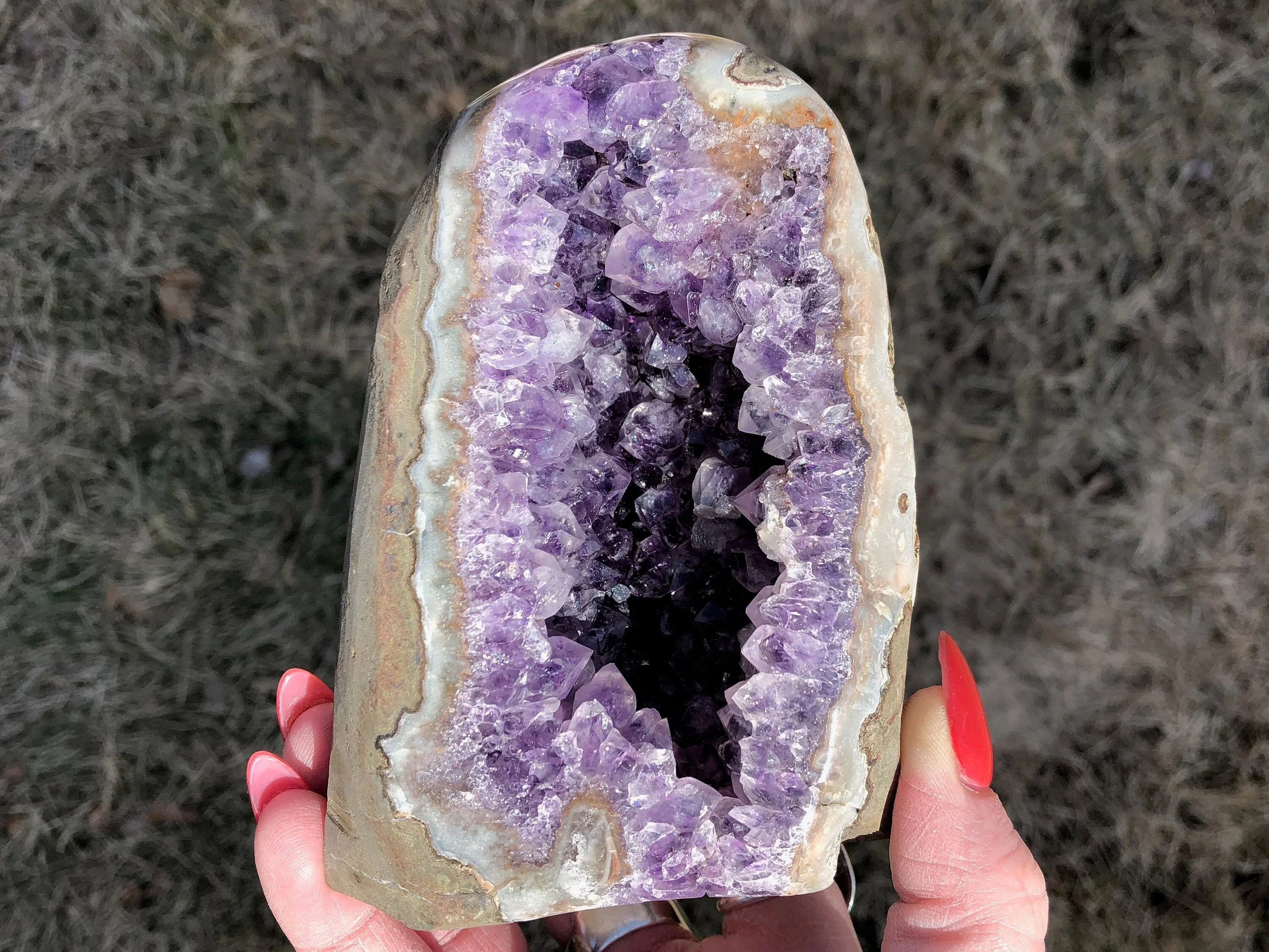This is a beautiful small Amethyst geode with a cut base so that it is self standing, Amethyst cathedral style but mini sized to fit on your desk, nightstand, shelf, just about anywhere. It has some calcite on some of the bright purple lustrous Amethyst crystals. There is some Agate around the edges. A great gift for any crystal lover.