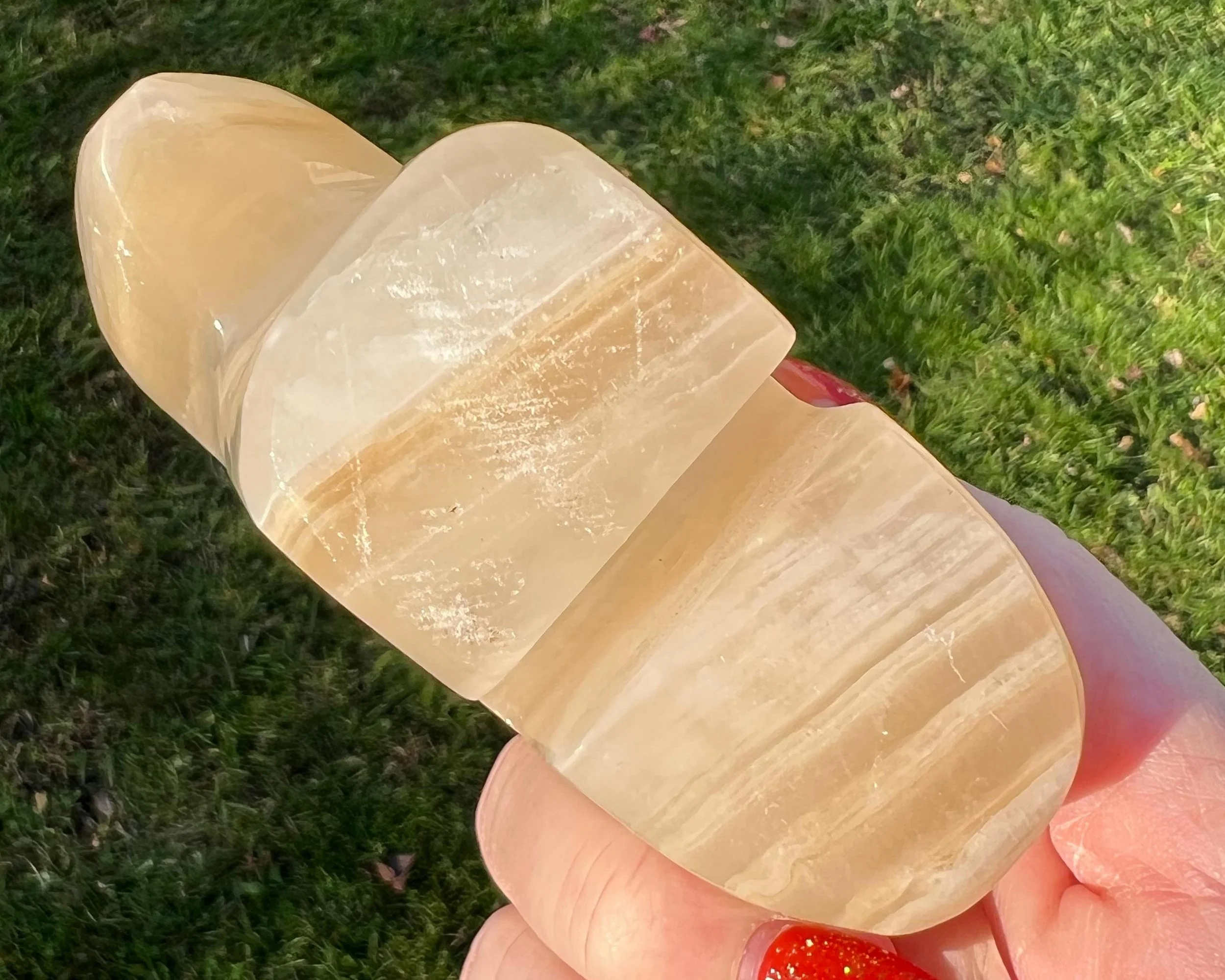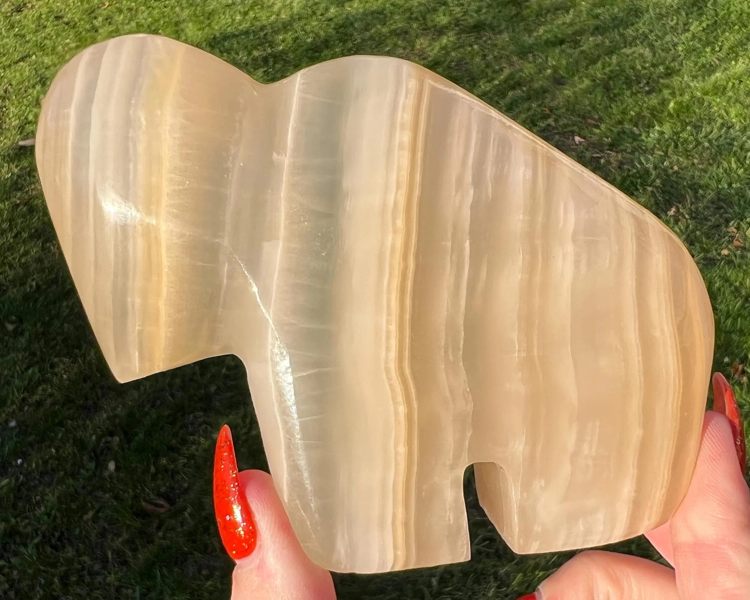 This is a Zuni style bison or buffalo carved from banded Calcite from Mexico also called Onyx. It has a gorgeous banding and stands upright and looks extra beautiful when light shines from behind it :)
