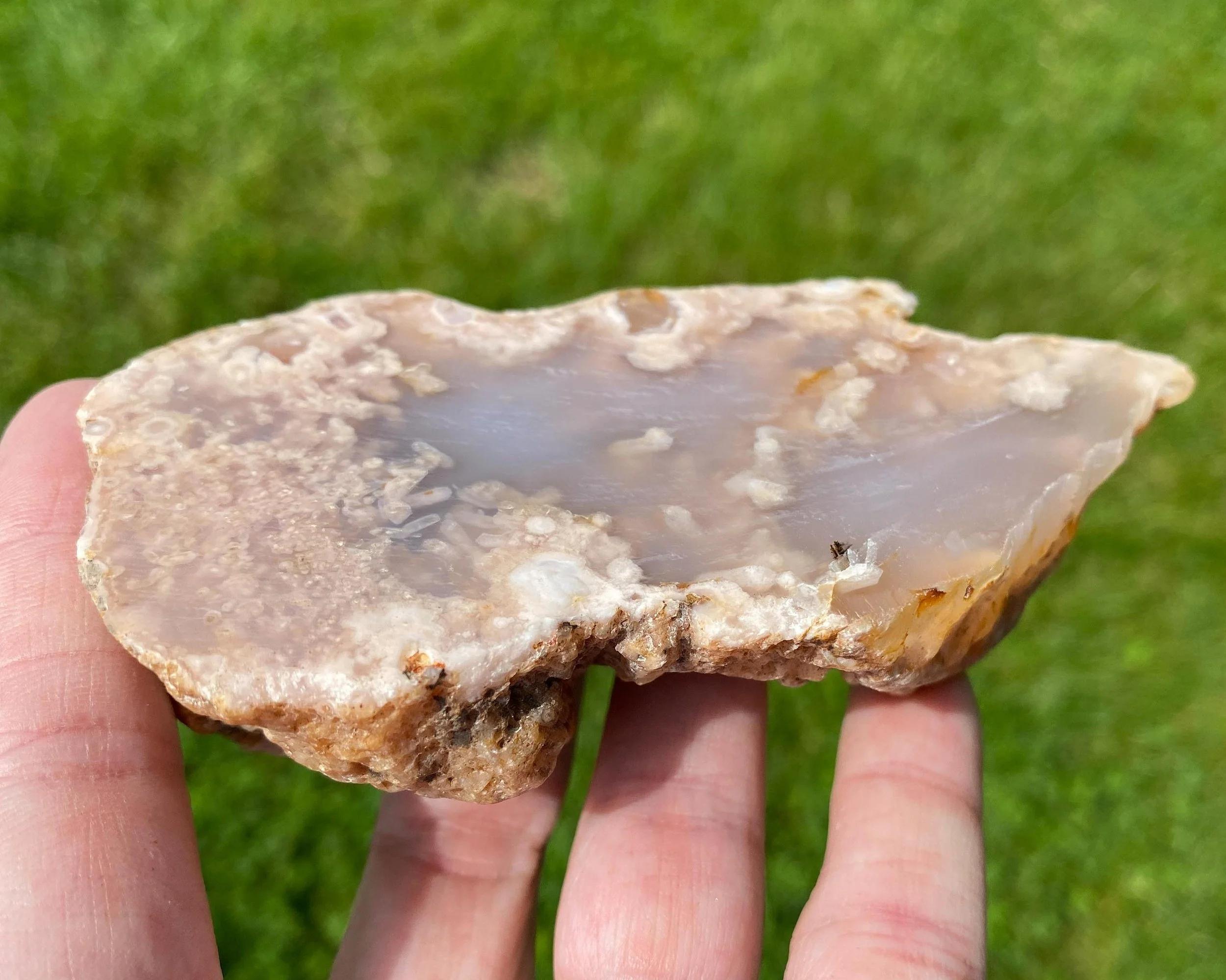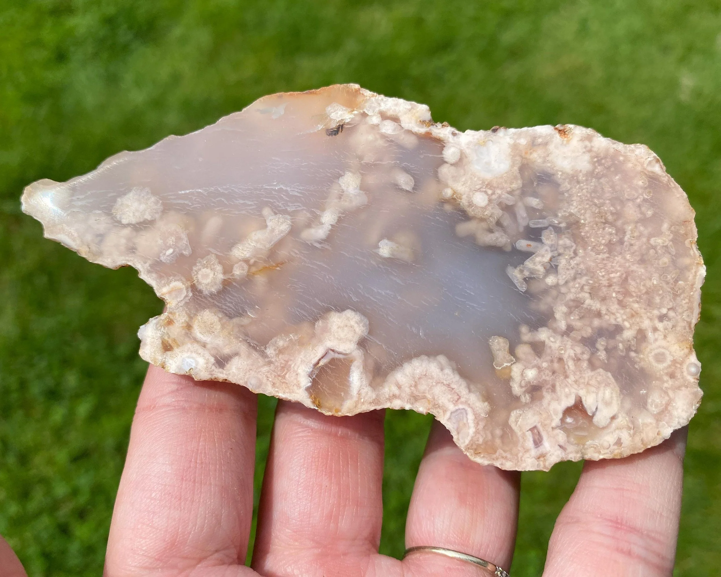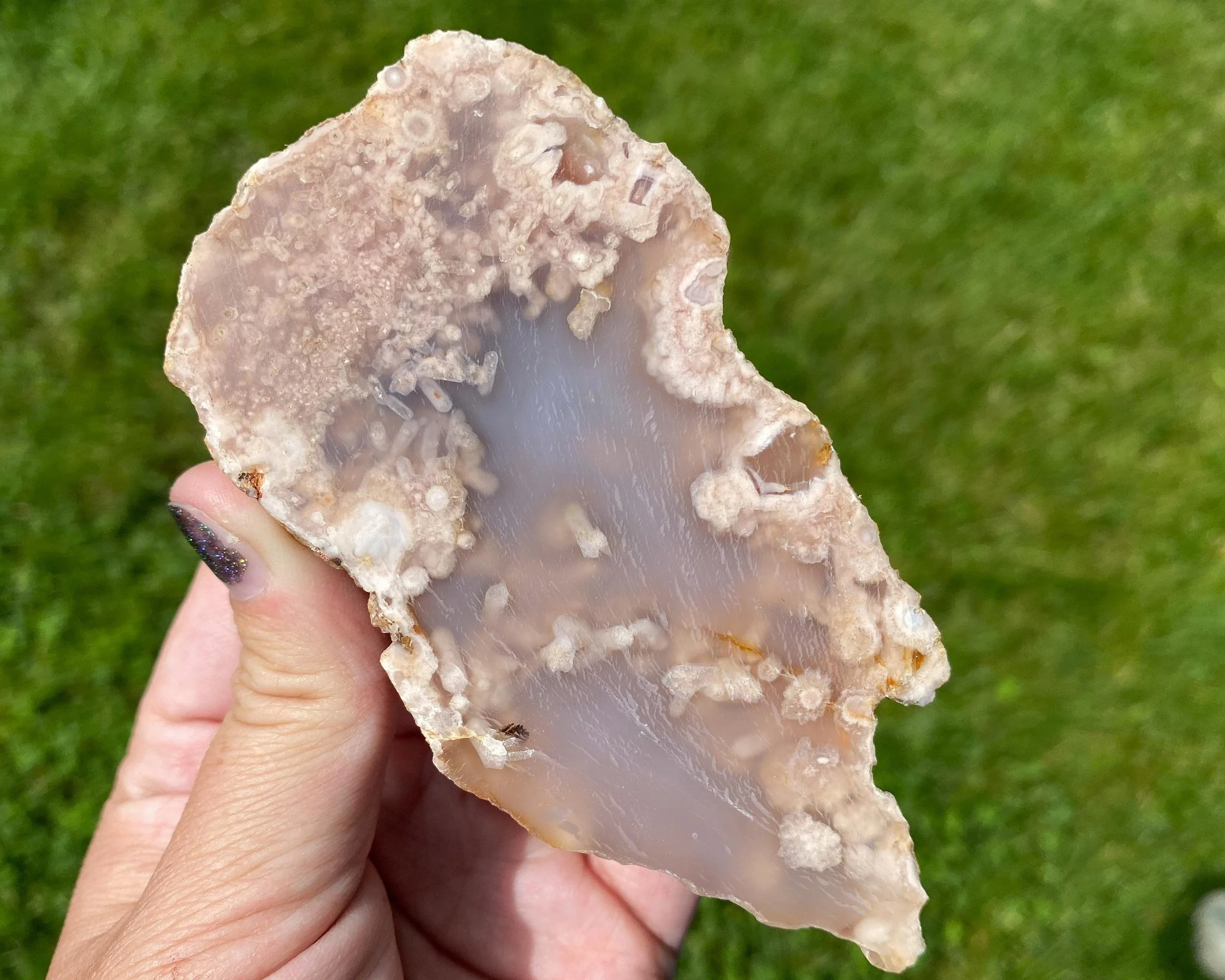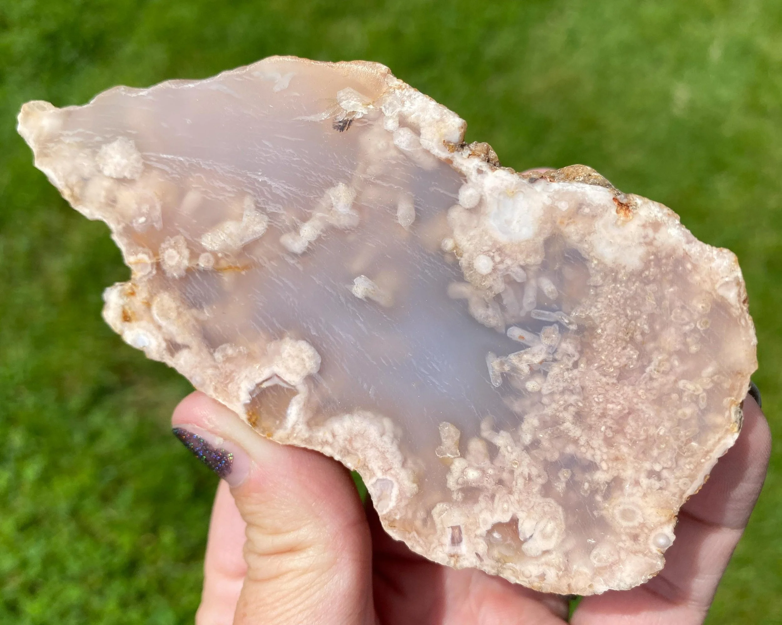 This is a lovely Flower Agate display piece, with lovely flower shapes and pretty plumes in the depths of the stone. It has nice coloring of light pink 'flowers' with a deep pink and gray background. There is some banding. It is polished on top and rough on the back. :) <3