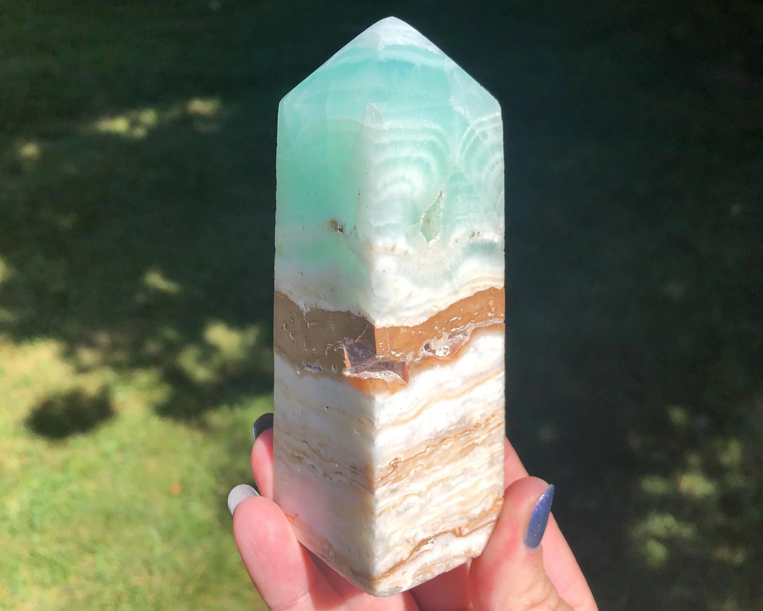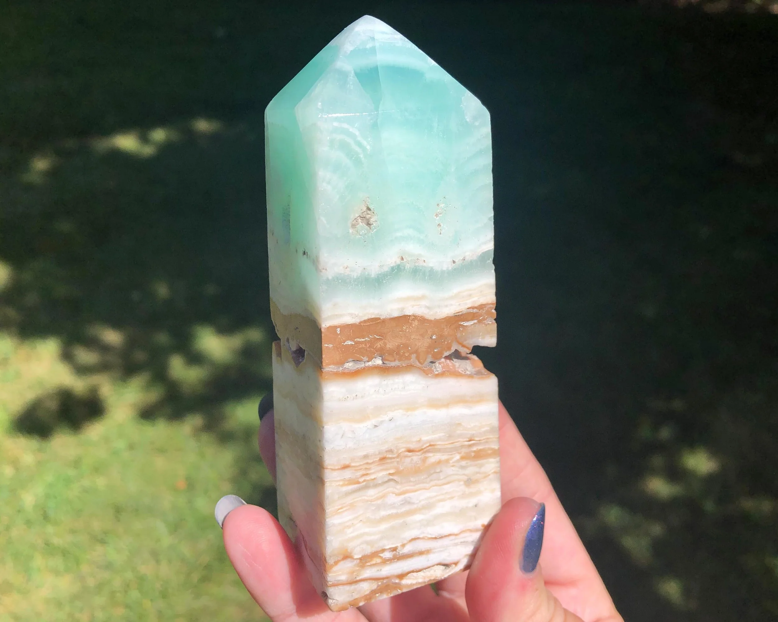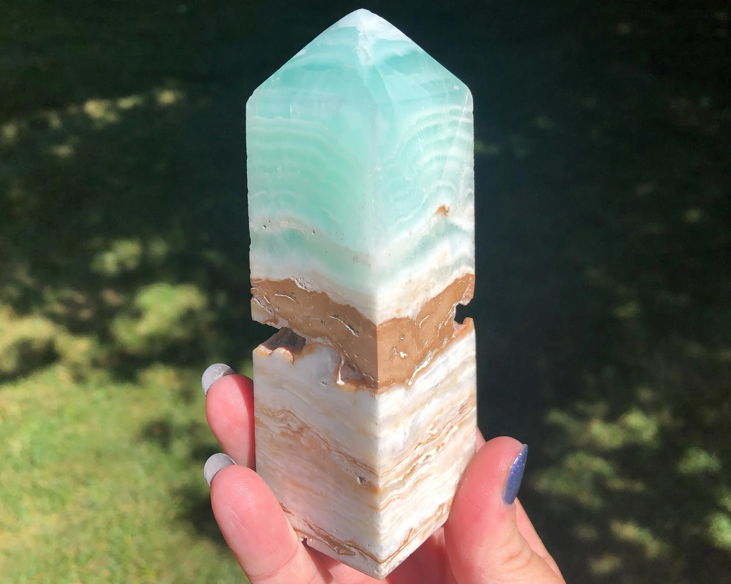 This is a tower carved from beautiful blue Caribbean Calcite. It has lovely banding of aqua blue, white and tan reminiscent of a tropical beach, polished into a lovely point. <3