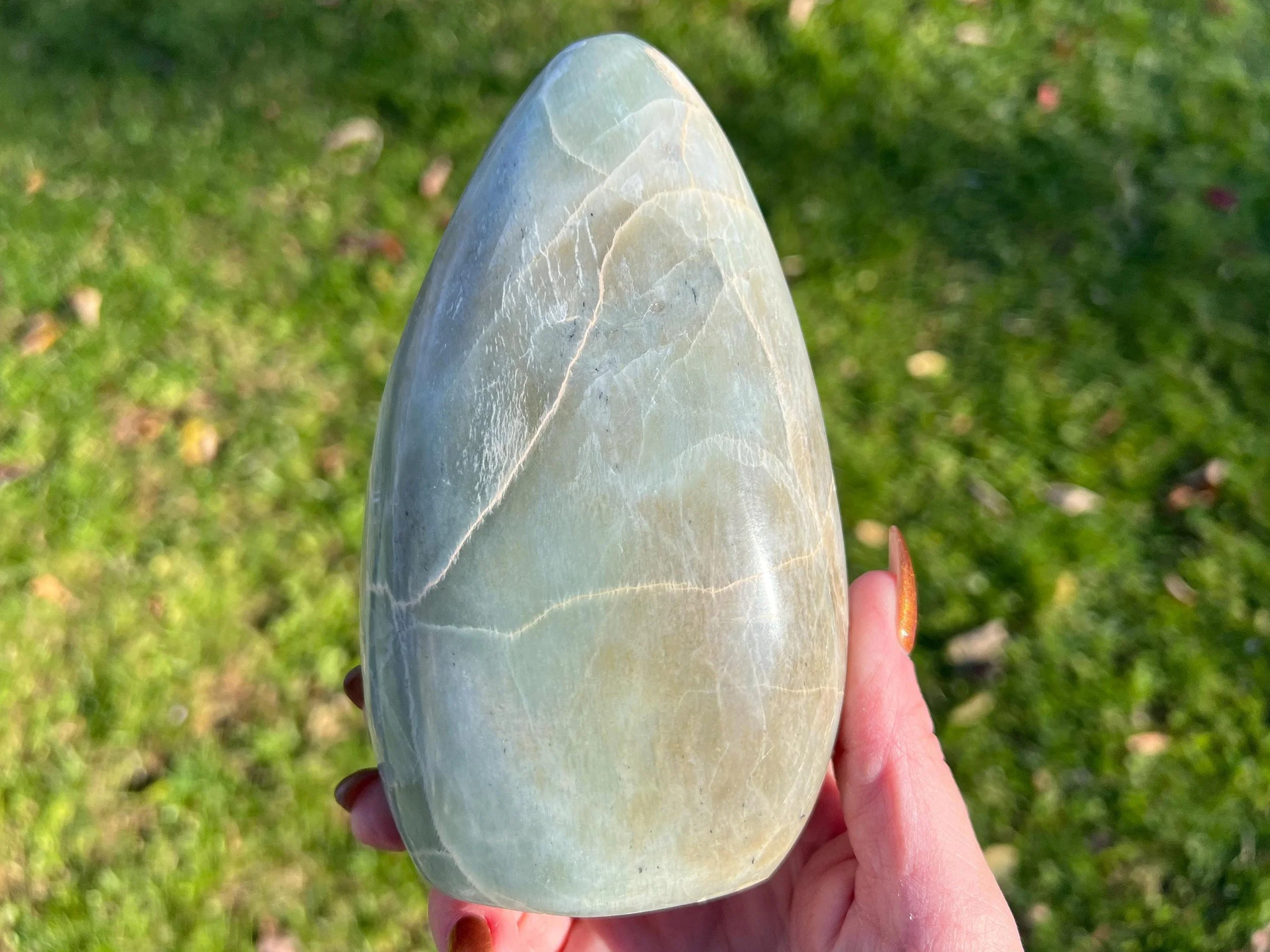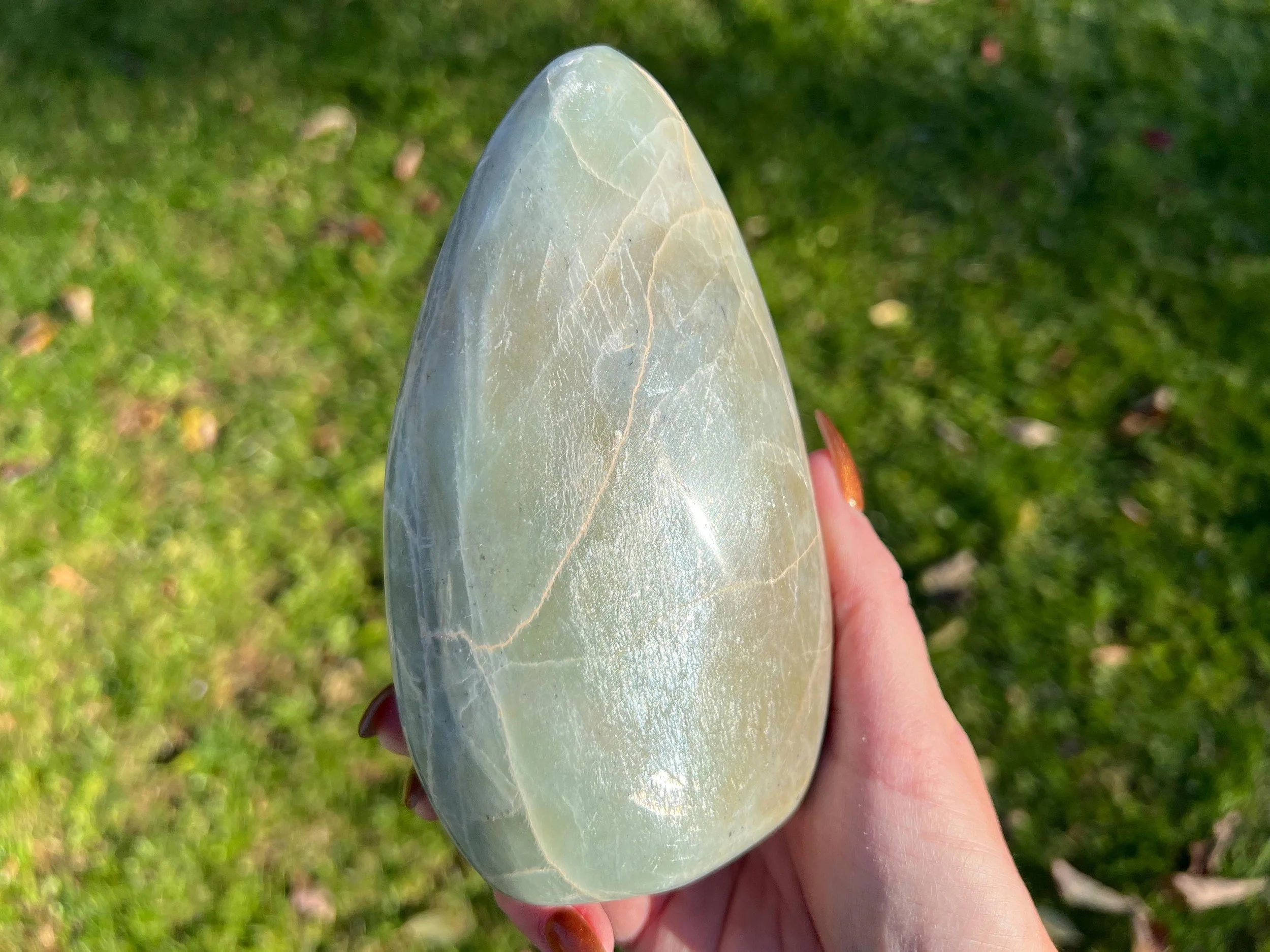 This is a lovely Garnierite display piece with some Smoky Quartz. It has beautiful blue and silver sheen that moves with the light. It is large and polished all around. It is a self standing beauty.