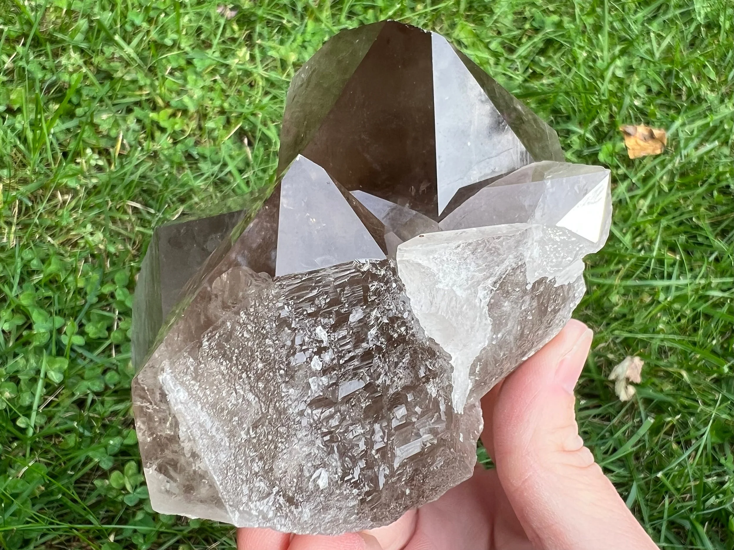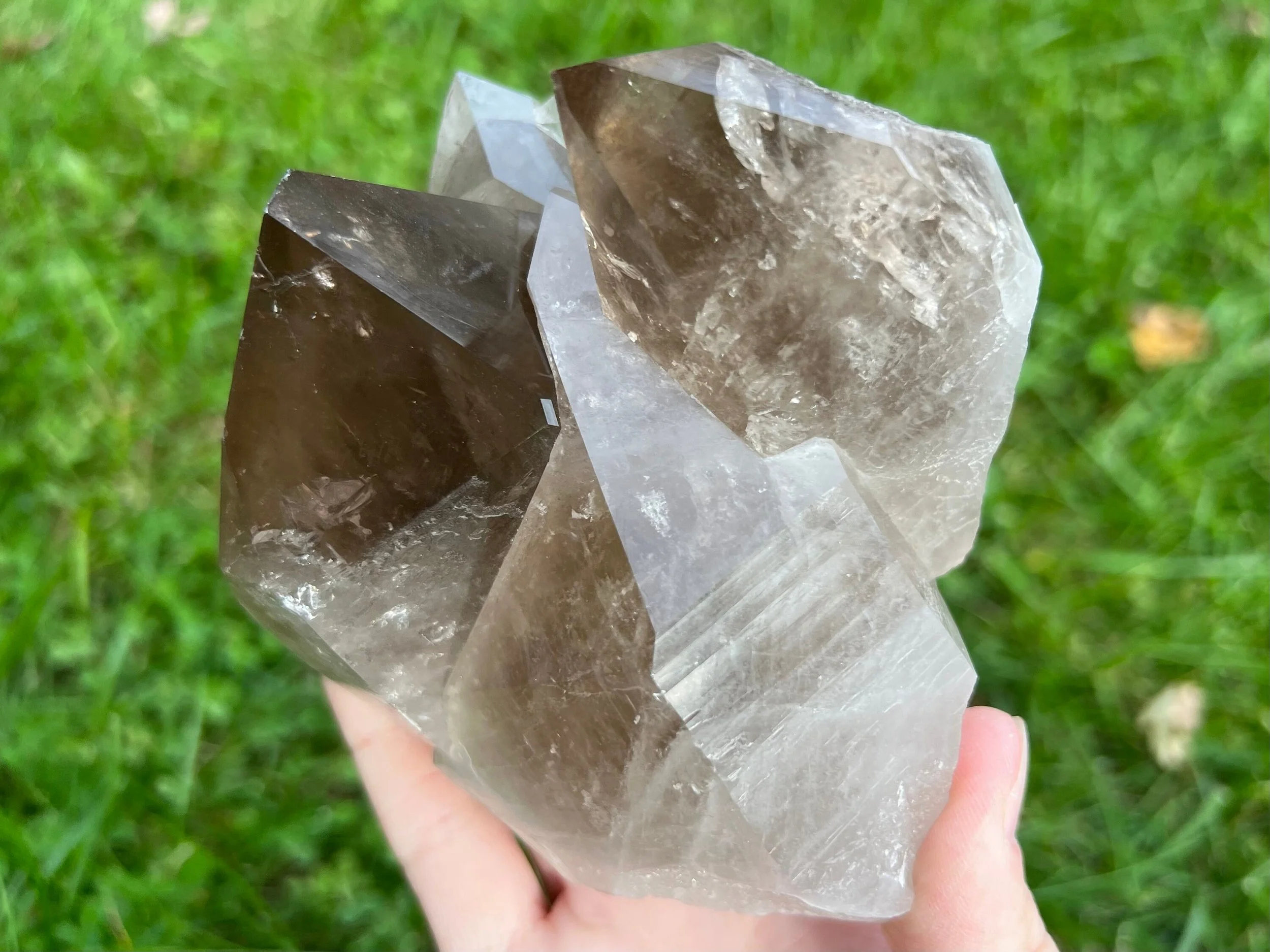 A lovely and large natural Smoky Quartz cluster with several transparent to translucent crystals that lean in together nicely. It can sit multiple ways and looks great from many angles. The entire bottom is partially self healed, with lots of elestial looking faces along the sides. An aesthetic piece with beautiful crystals that would be a nice addition to your collection or home decor, or be a lovely unique gift :)