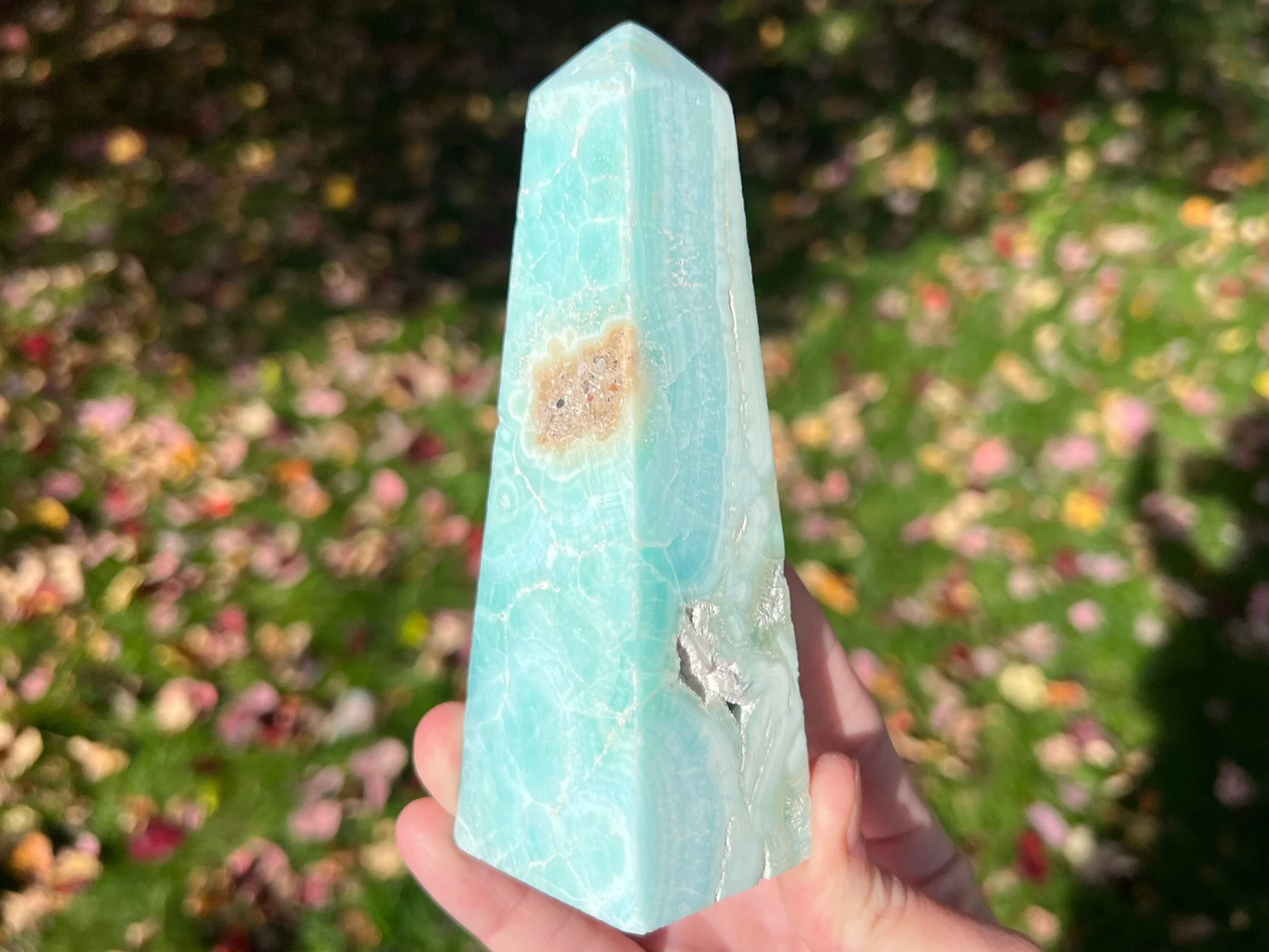 This is a crystal tower carved from beautiful blue Aragonite. It is a naturally bright banded aqua blue stone cut and polished into a self standing point.