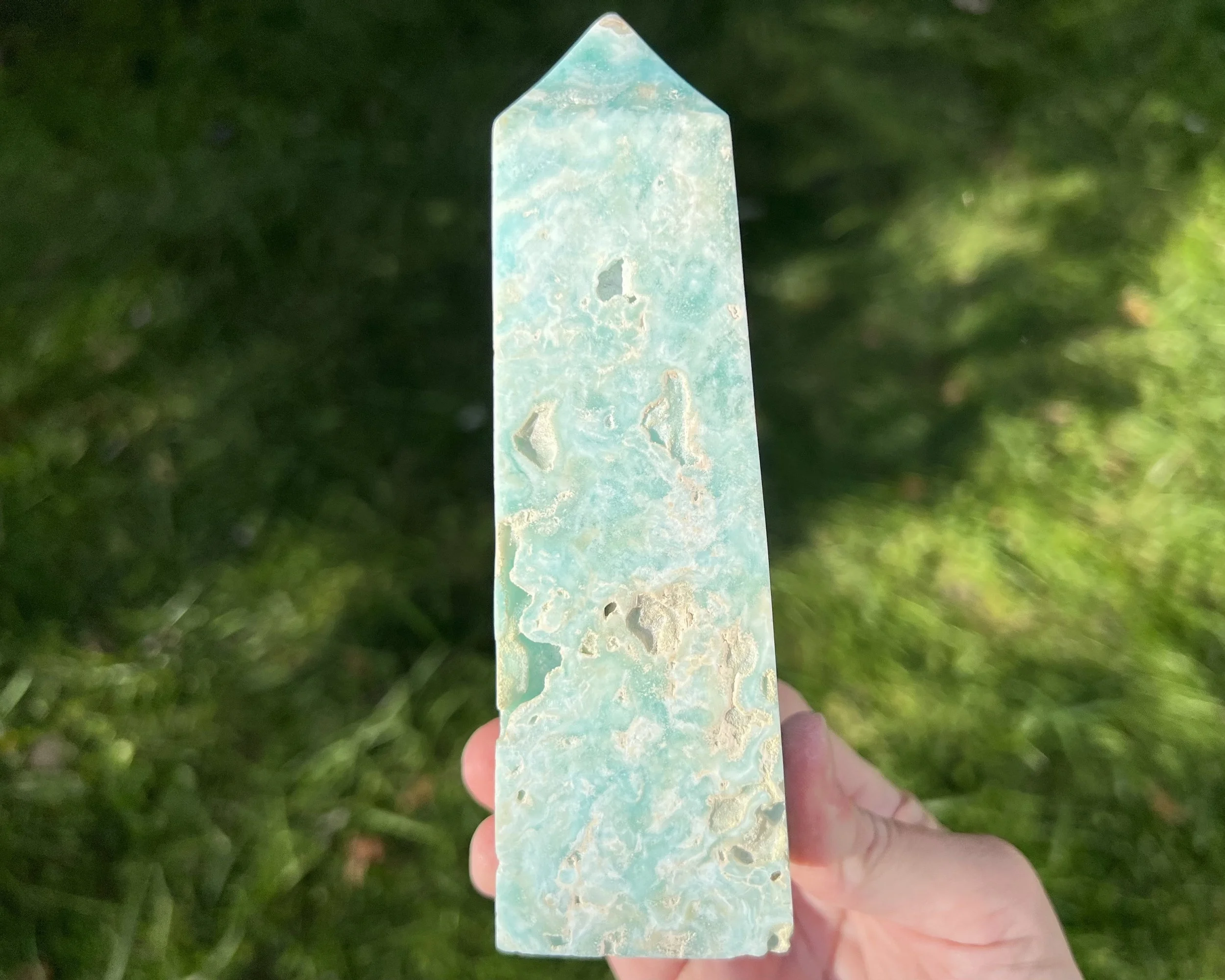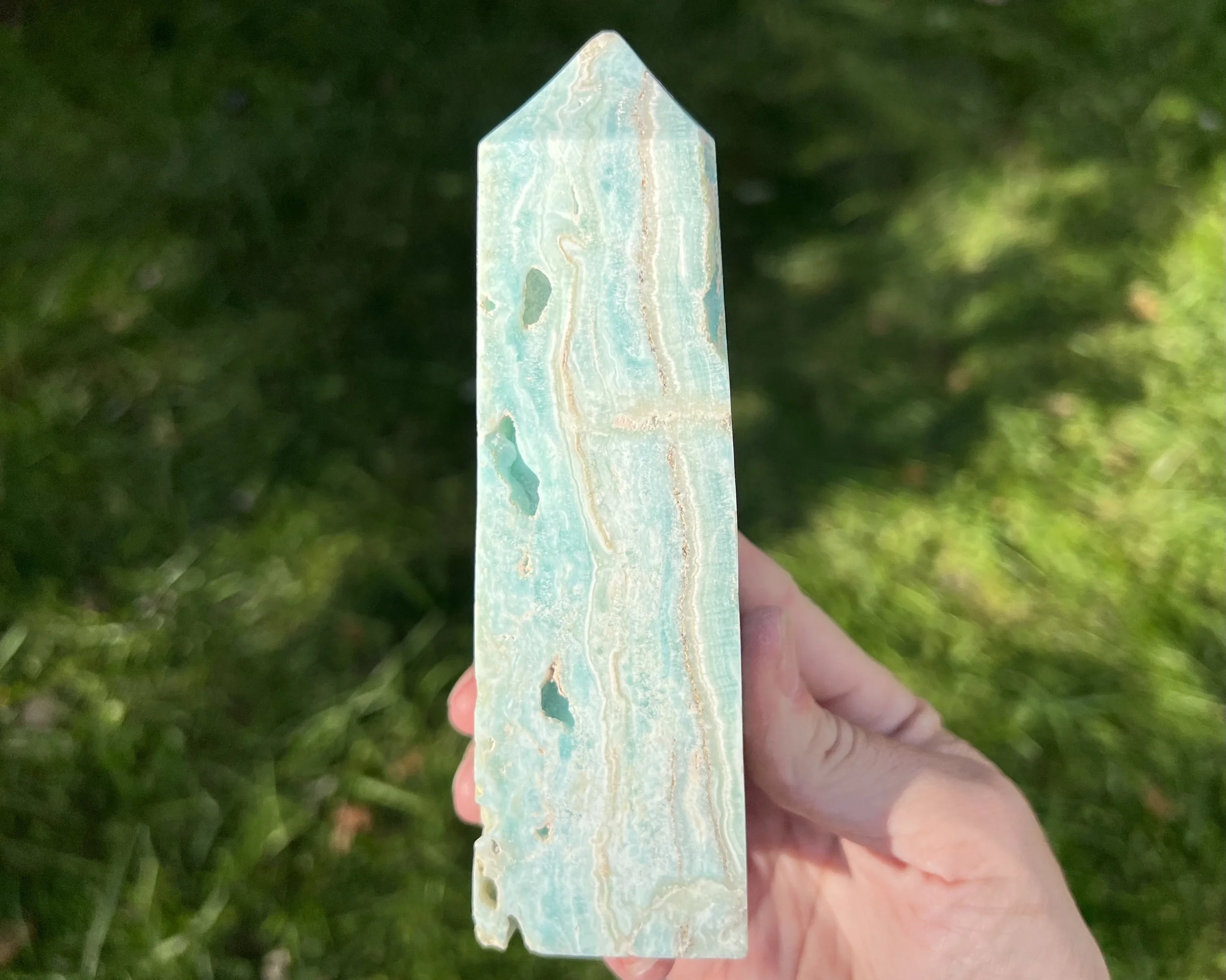 This is a large crystal tower carved from beautiful blue Aragonite. It is banded in pretty patterns and has druzy pockets too. It is a cut and polished point made from natural stone. It is self standing.