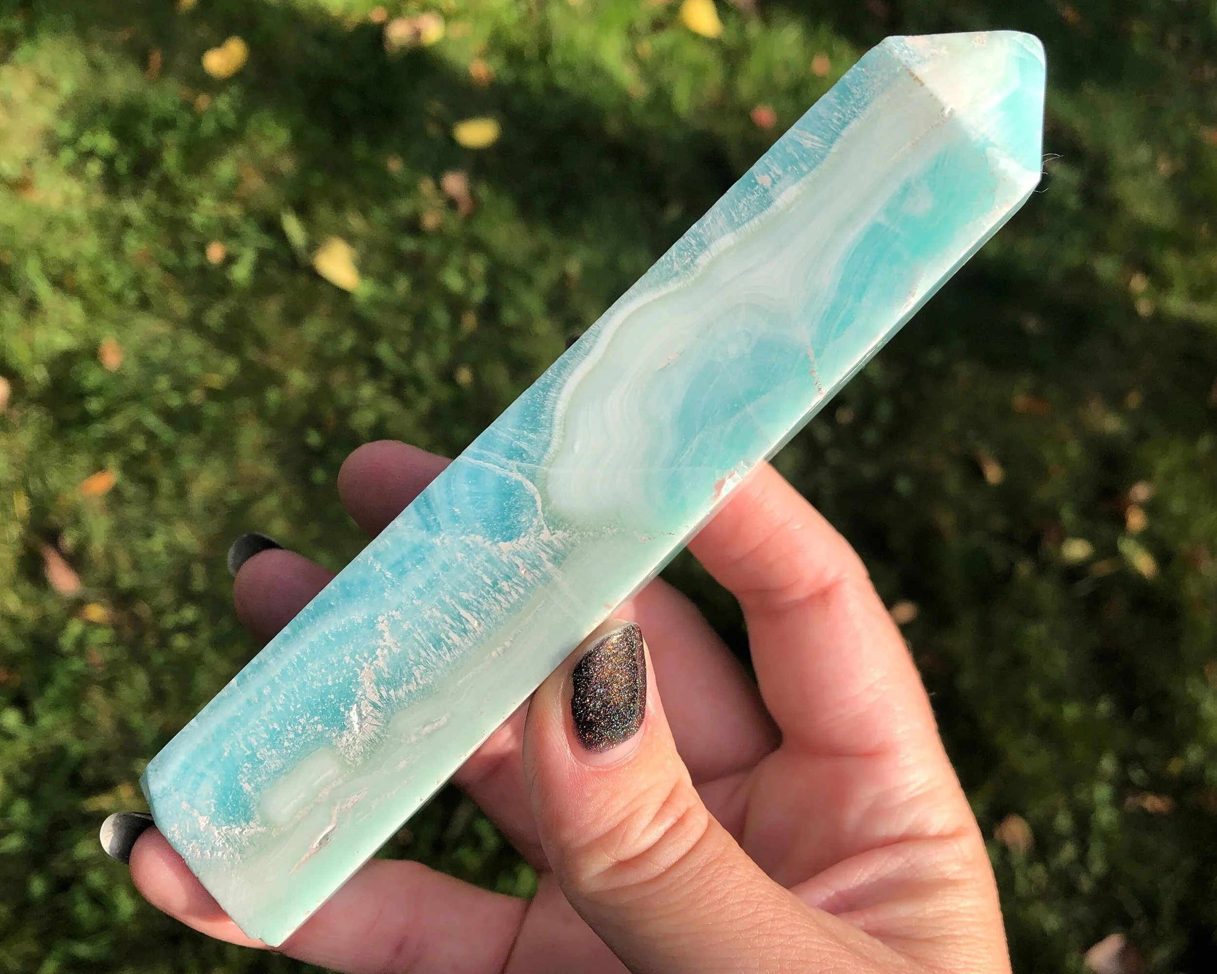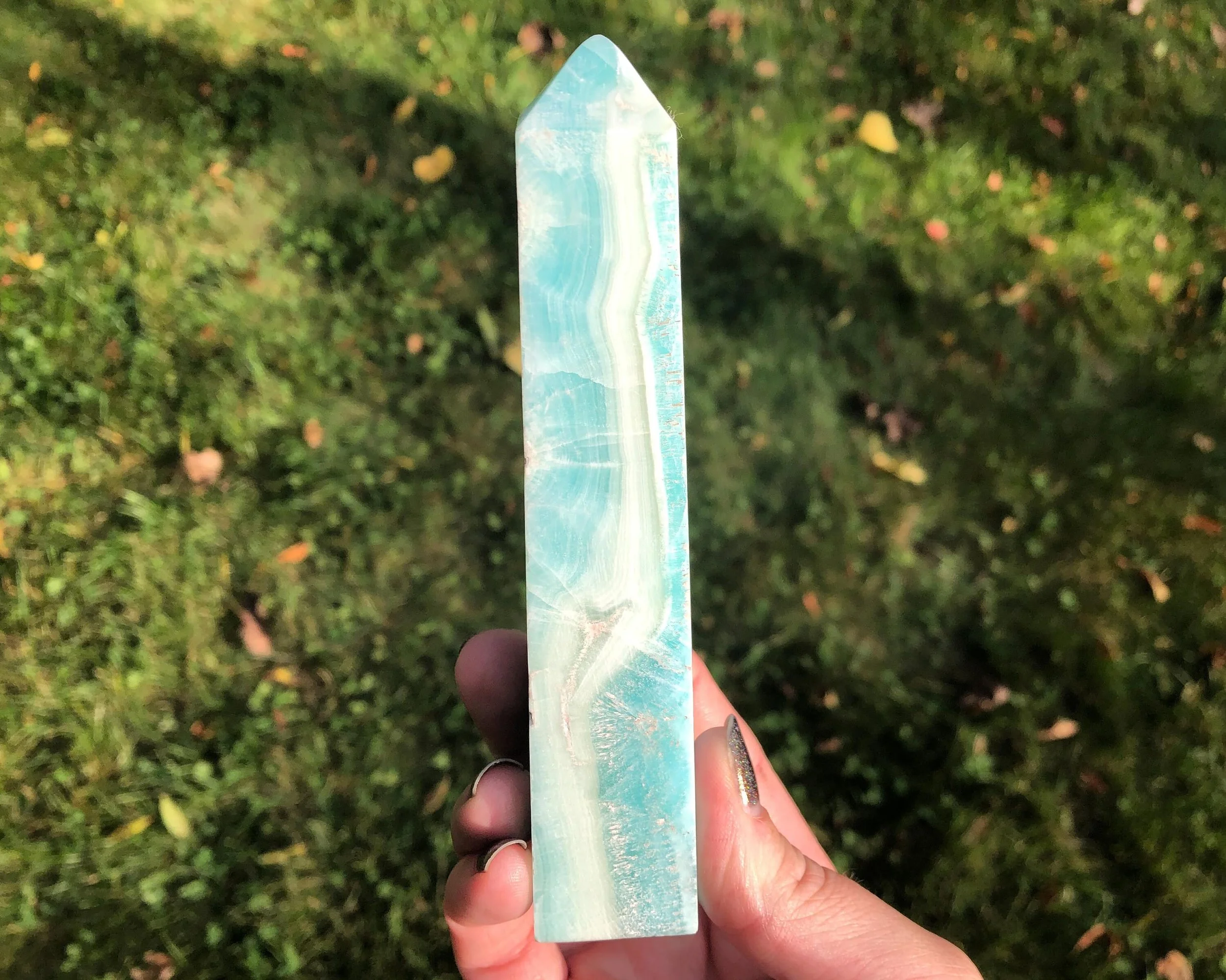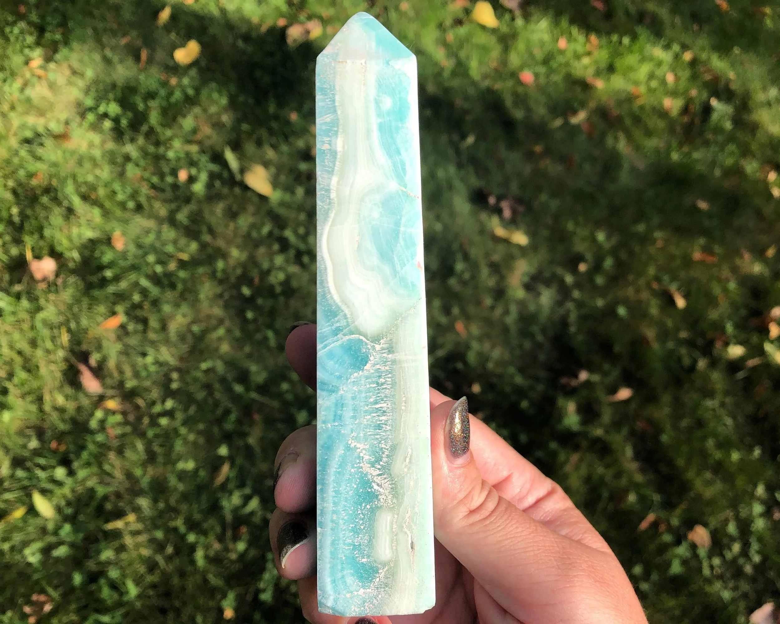 5.5" Blue Aragonite Crystal Tower #7 Large Polished Point, Home Decor, Caribbean Calcite Point, Bright Aqua Banded Gemstone Gift for Her Him