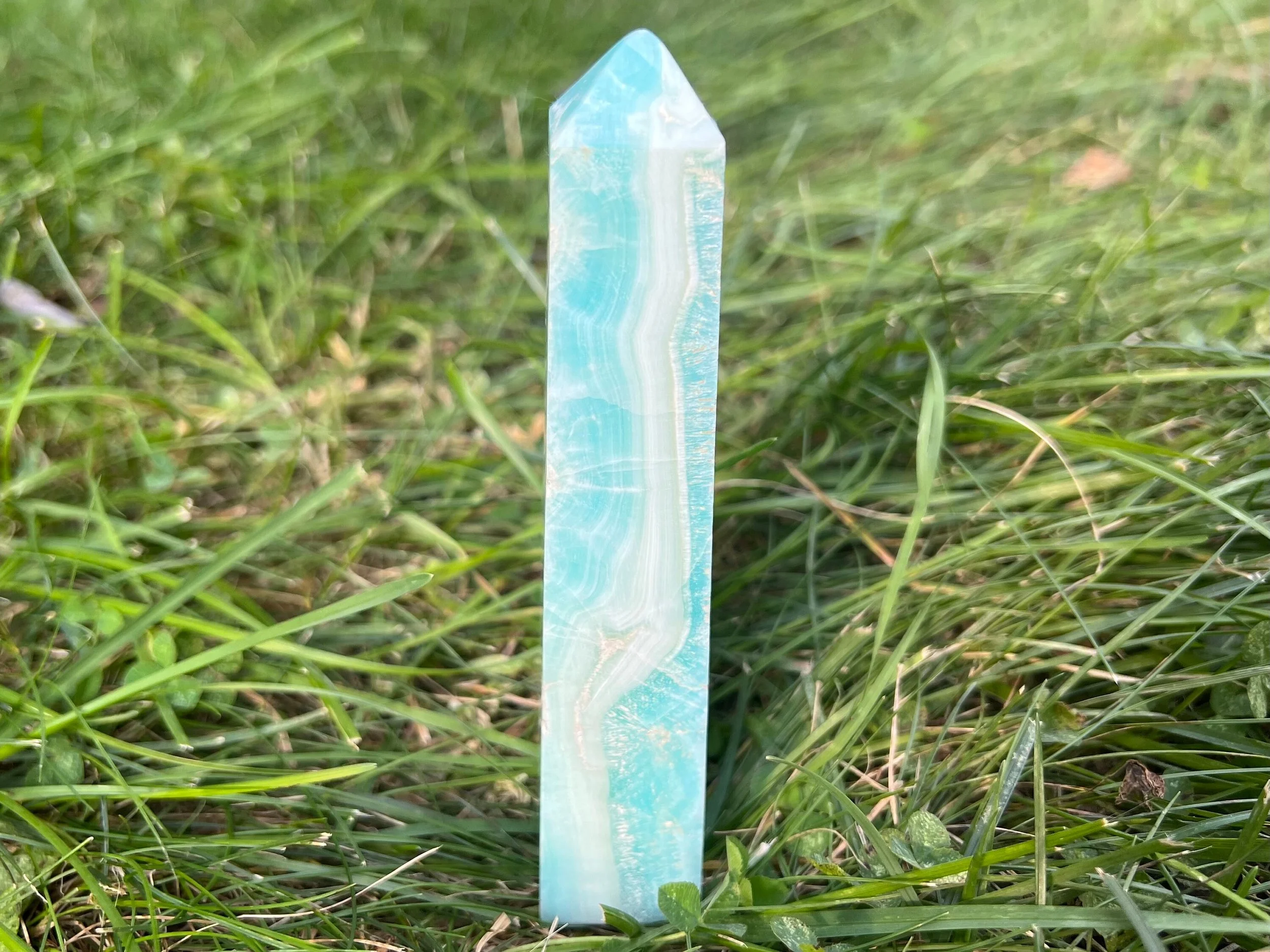 This is a crystal tower carved from beautiful aqua blue banded Aragonite. It has gorgeous color banding and patterns! It is polished and self standing. A great accent for anywhere in the home, and a great gift for any crystal lover.