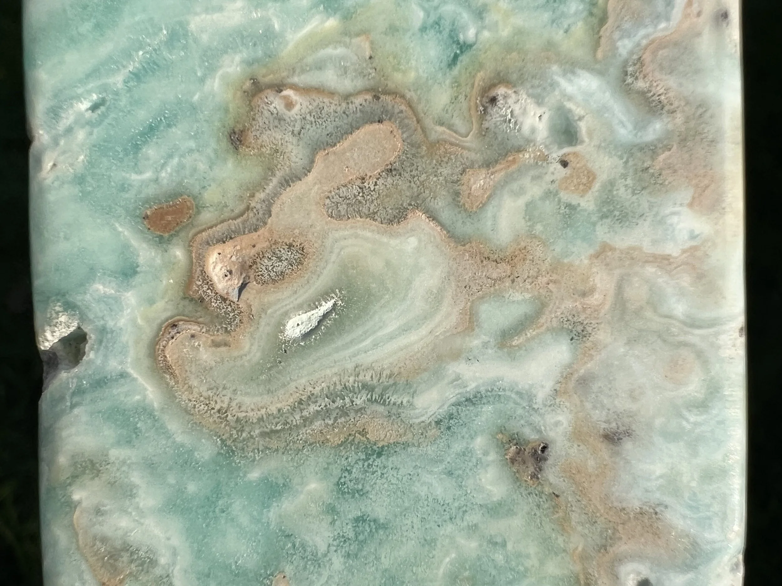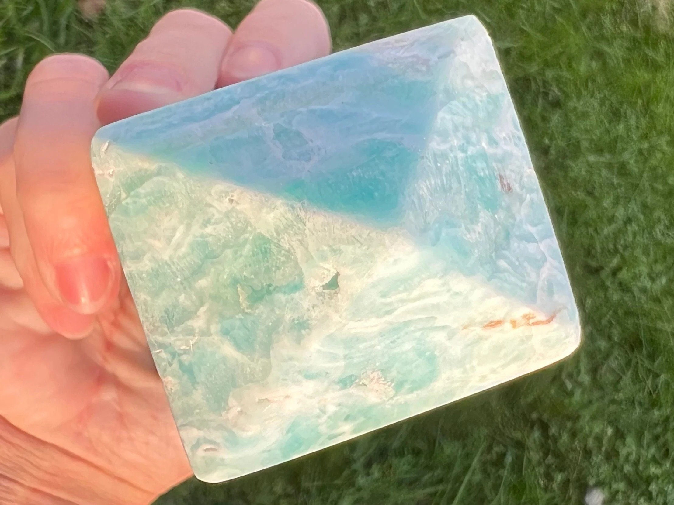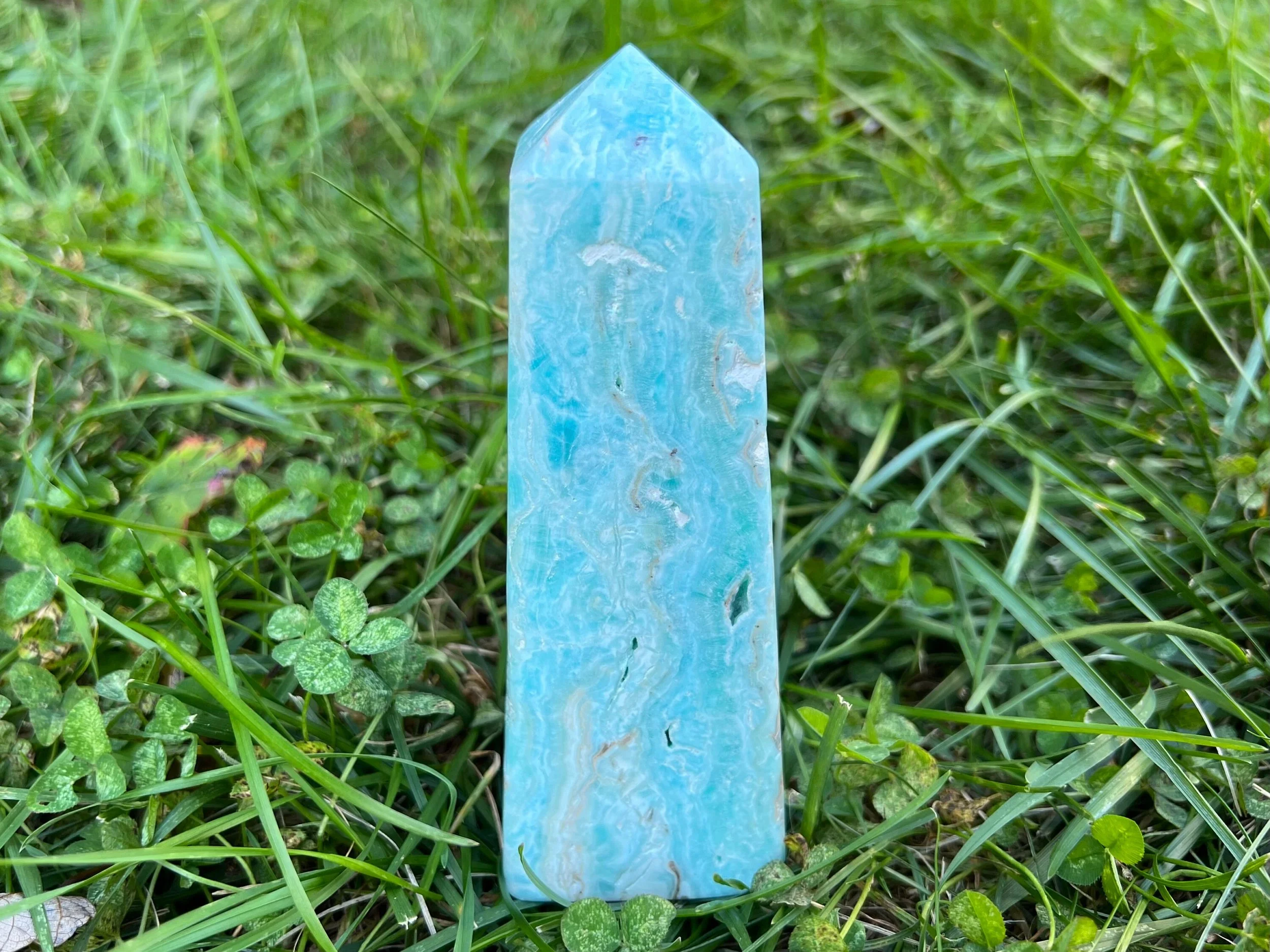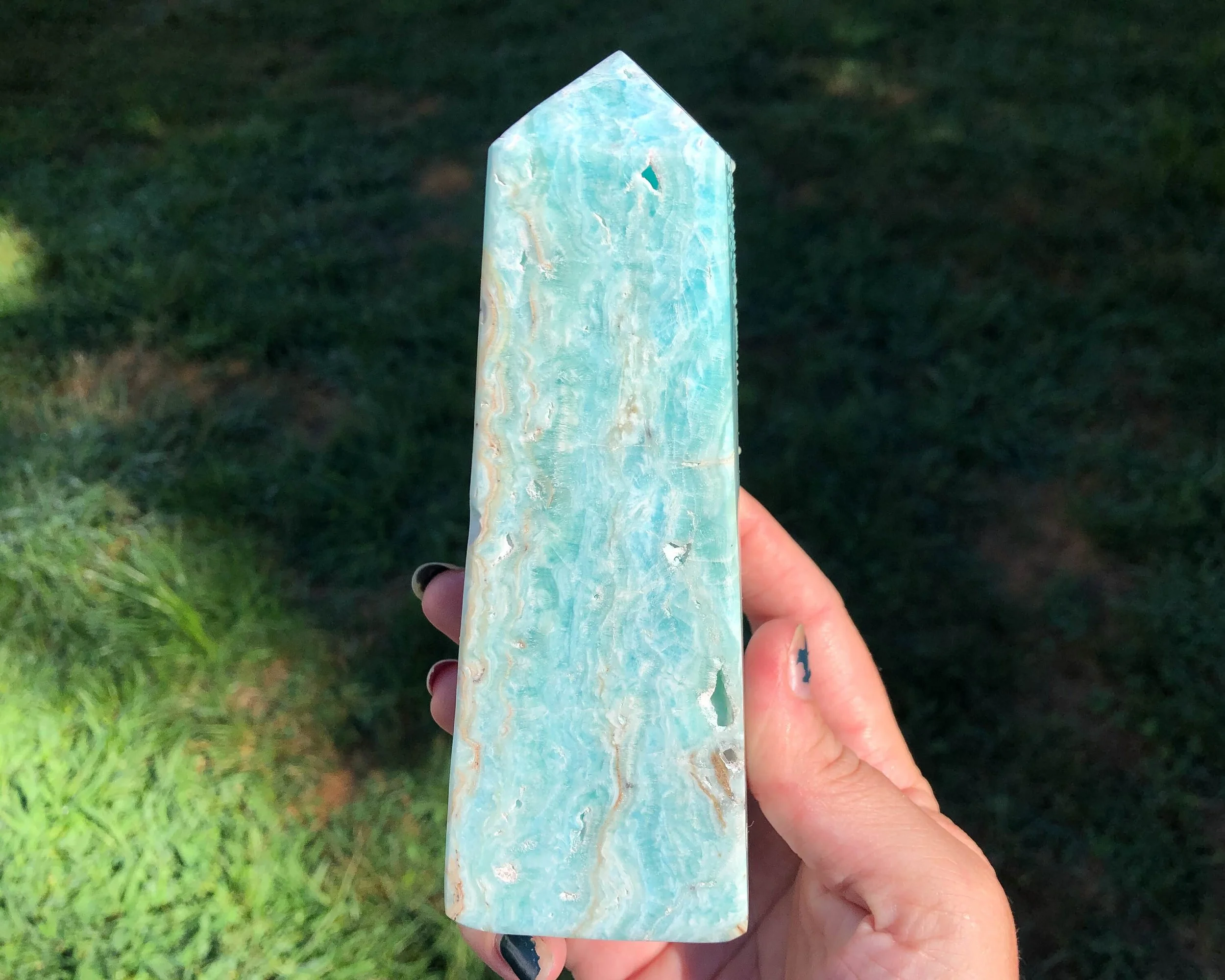This is a crystal tower carved from beautiful banded aqua Blue Aragonite. It has gorgeous color and patterns! It is a self standing crystal, carved and polished into a point. A large and vibrant stone perfect for beachy decor.
