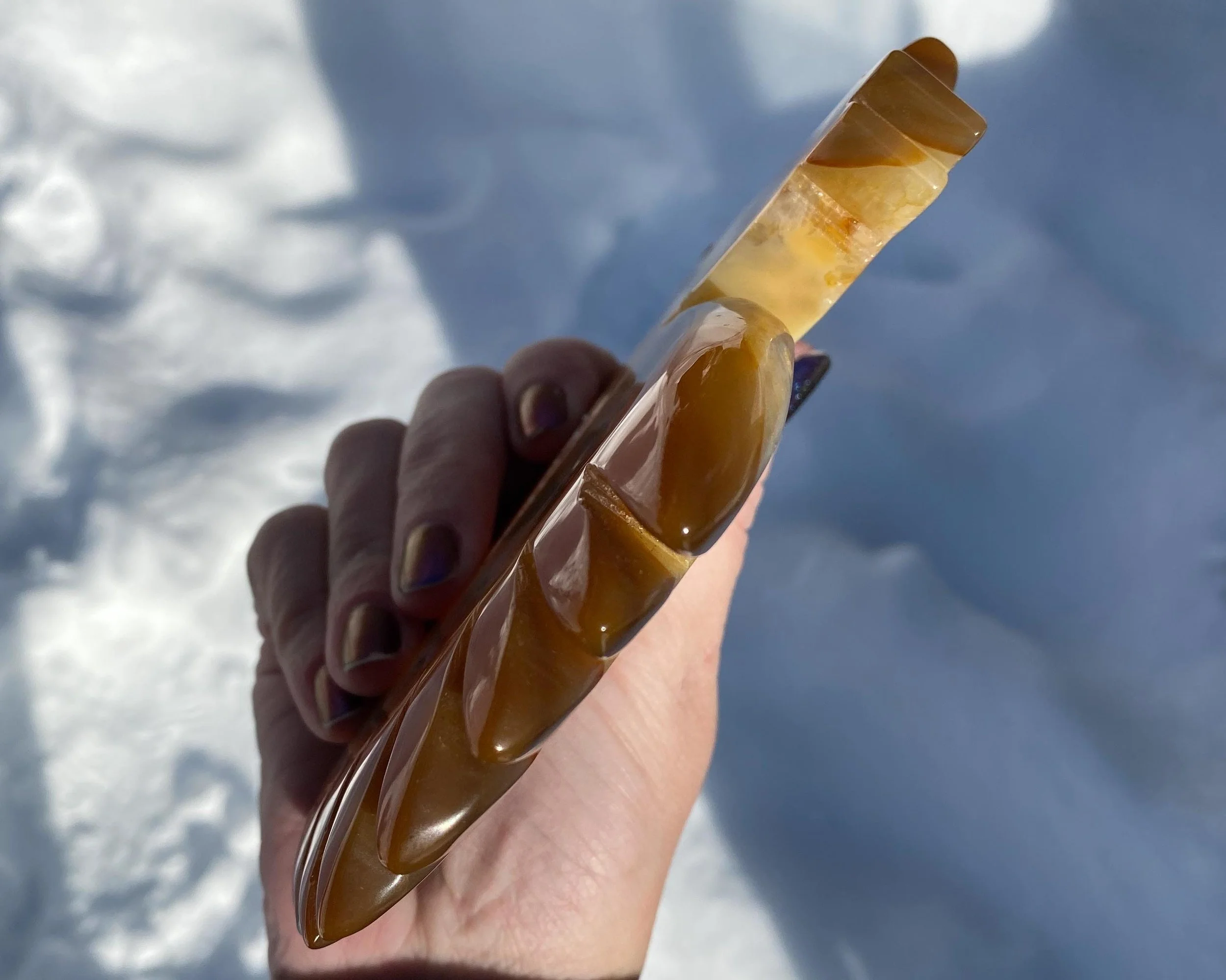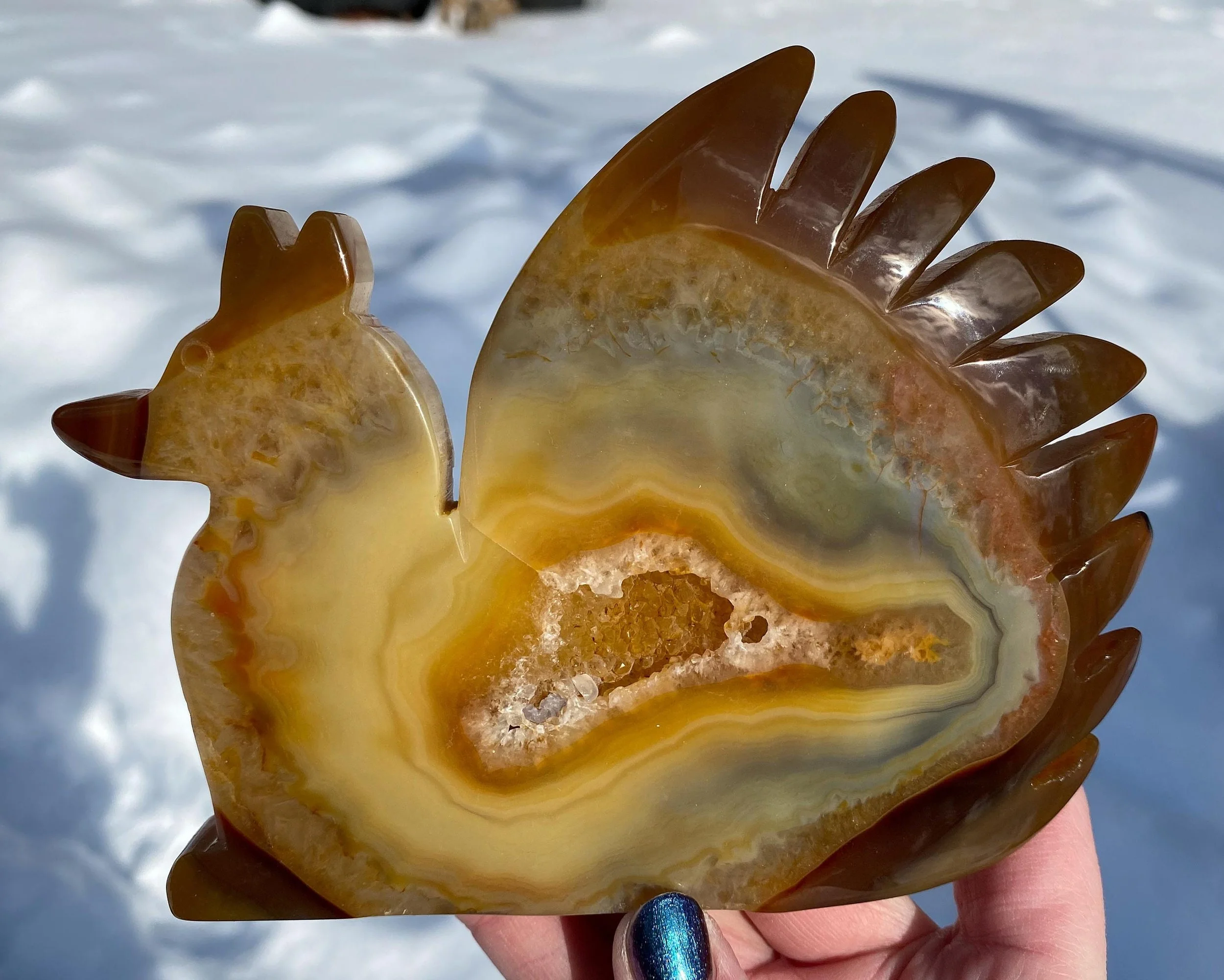 This is a lovely Agate Ninetails Fox with a druzy Quartz pocket with glittering sparkly druzy in a little cave. It has lovely coloring and banding and stands upright on a flat bottom. Also could be a fox with big wings.