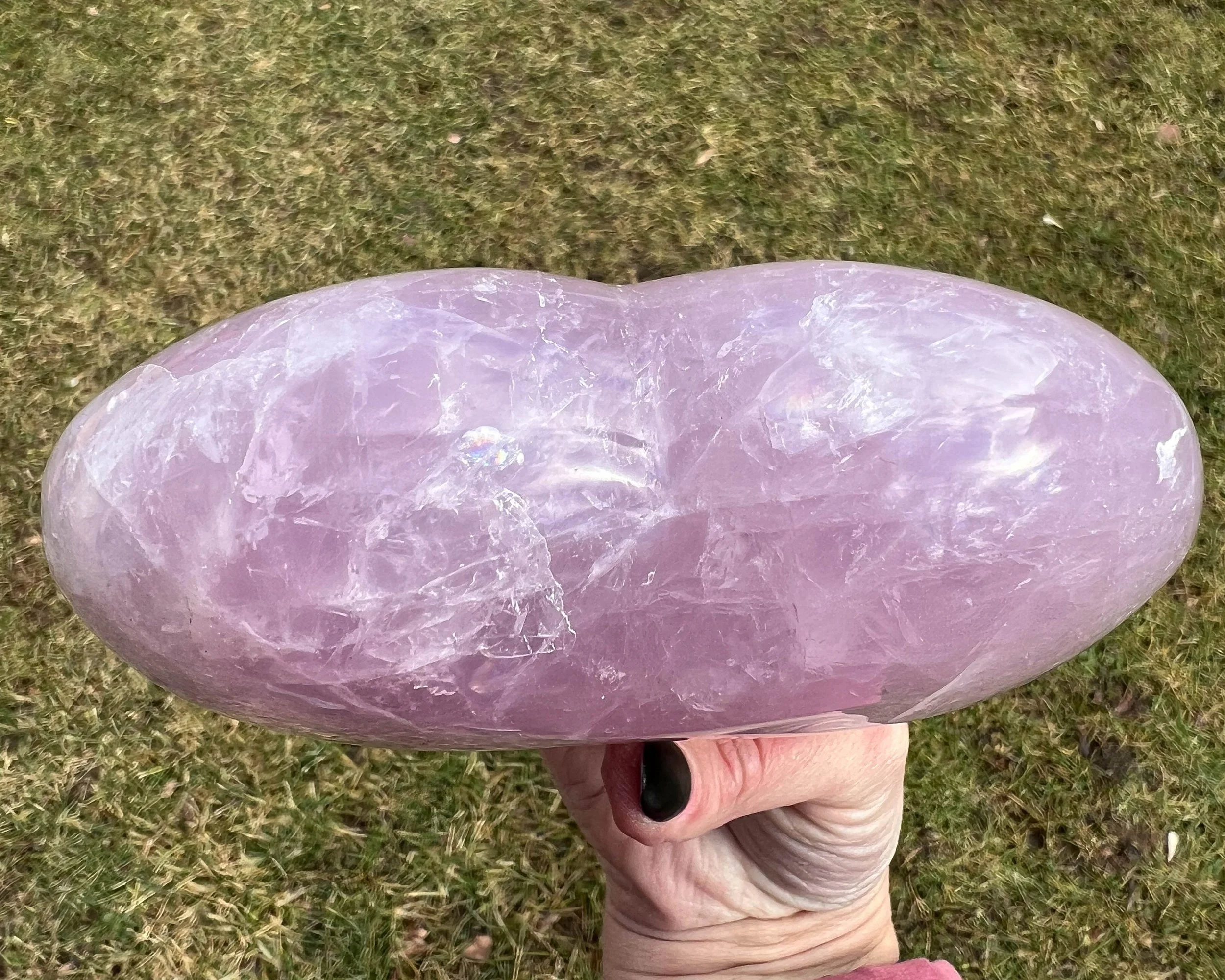 This is an extra large Star Rose Quartz heart. It has lots of rainbows, it does have a star (asterism) in it, lovely pink color, nice sheen, and is translucent. It looks nice backlit. It is huge and gorgeous. It is polished. It almost has a light lavender color. It is much prettier in person.