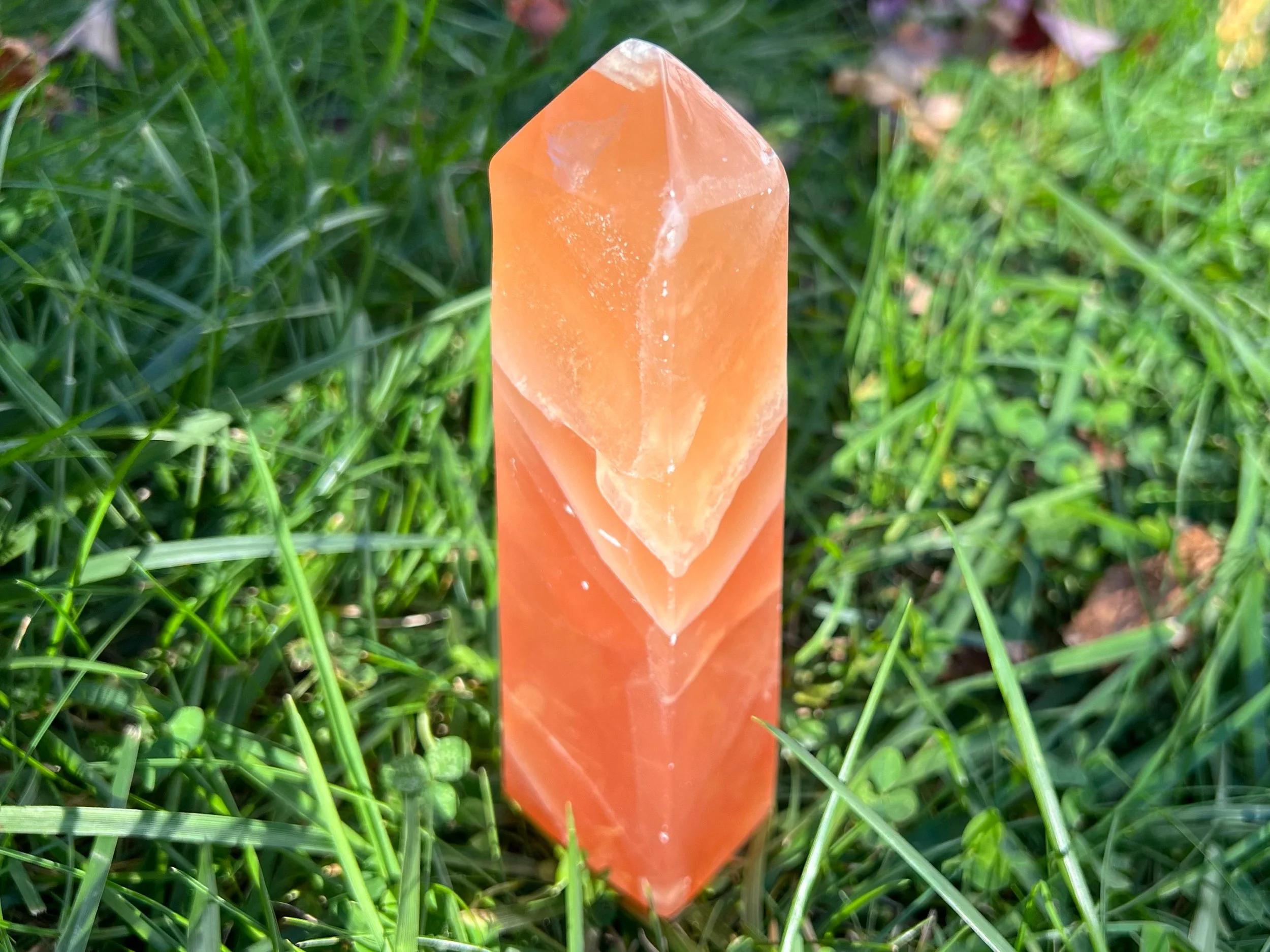 This is a beautiful tower made from glowing orange Honey Calcite. It has a dark to bright orange color that glows when there's light behind it. Some have banding or inclusions, but they are all gorgeous!