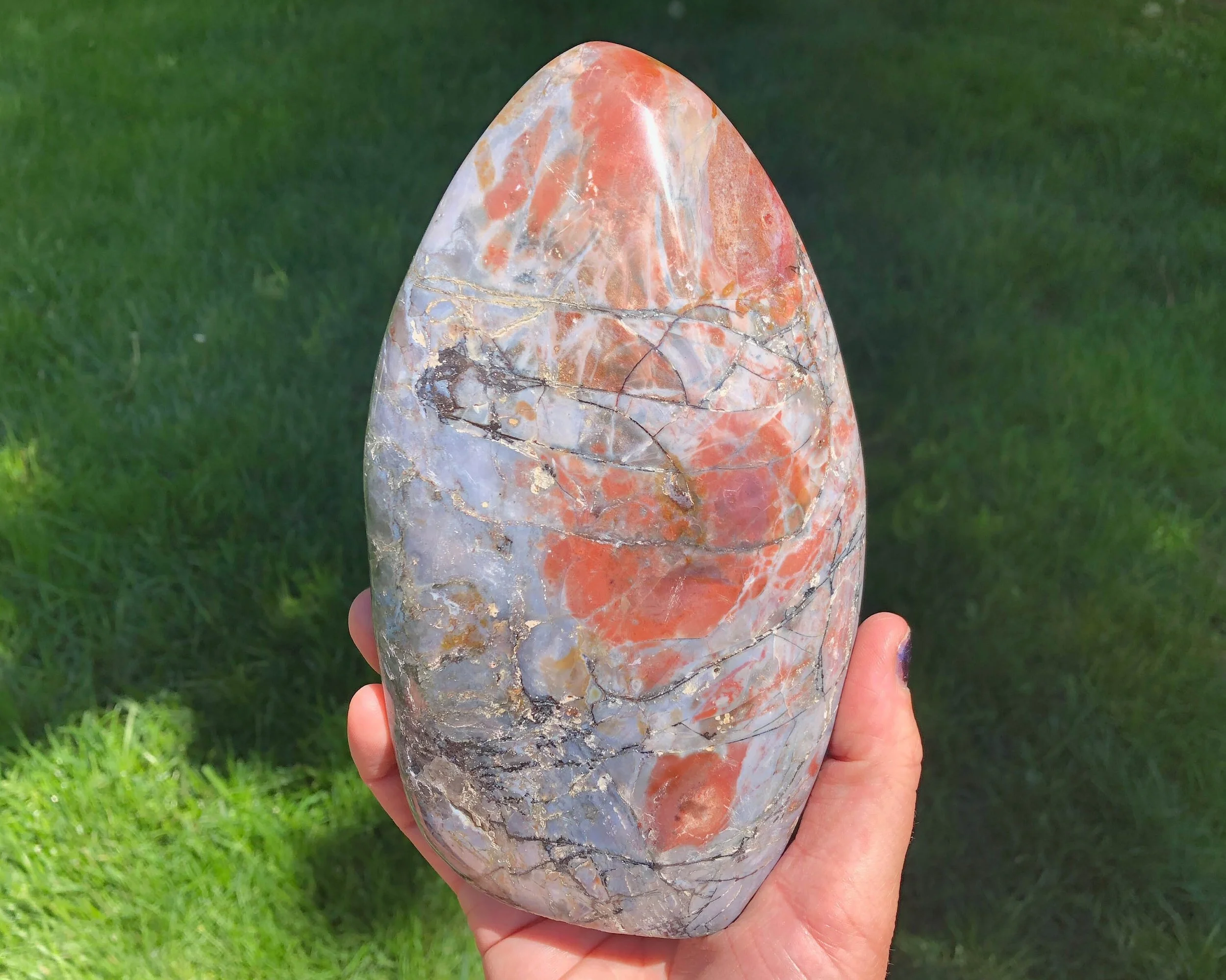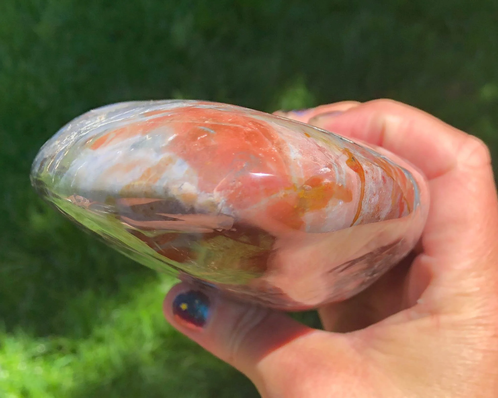 This is a beautiful and colorful Jasper display piece. It was sold as Ocean Jasper but it does not look like it to me. It has great color with light purple, pink and reds. It has little druzy Quartz pockets in Agate on one side. Very pretty but just might not be ocean jasper specifically. Definitely a Jasper though!