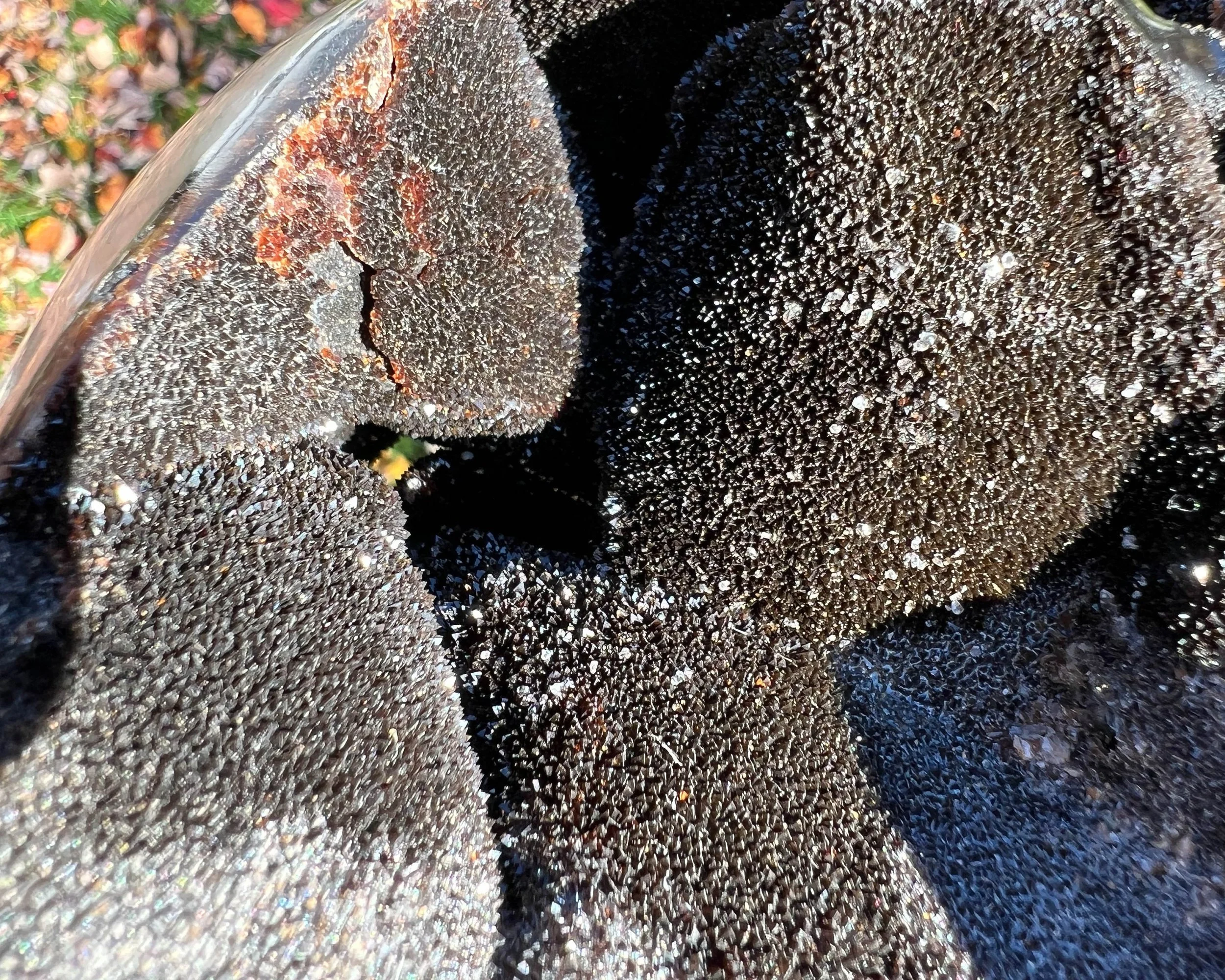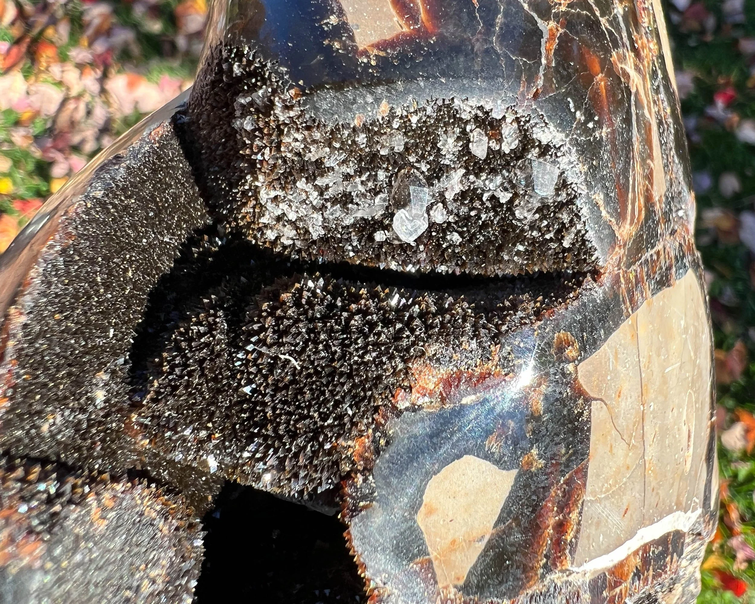 All around this beauty is pockets of sparkly druzy Aragonite crystals. The outer part is polished. Sturdy display piece. It would make a great gift or beautiful piece of home decor.