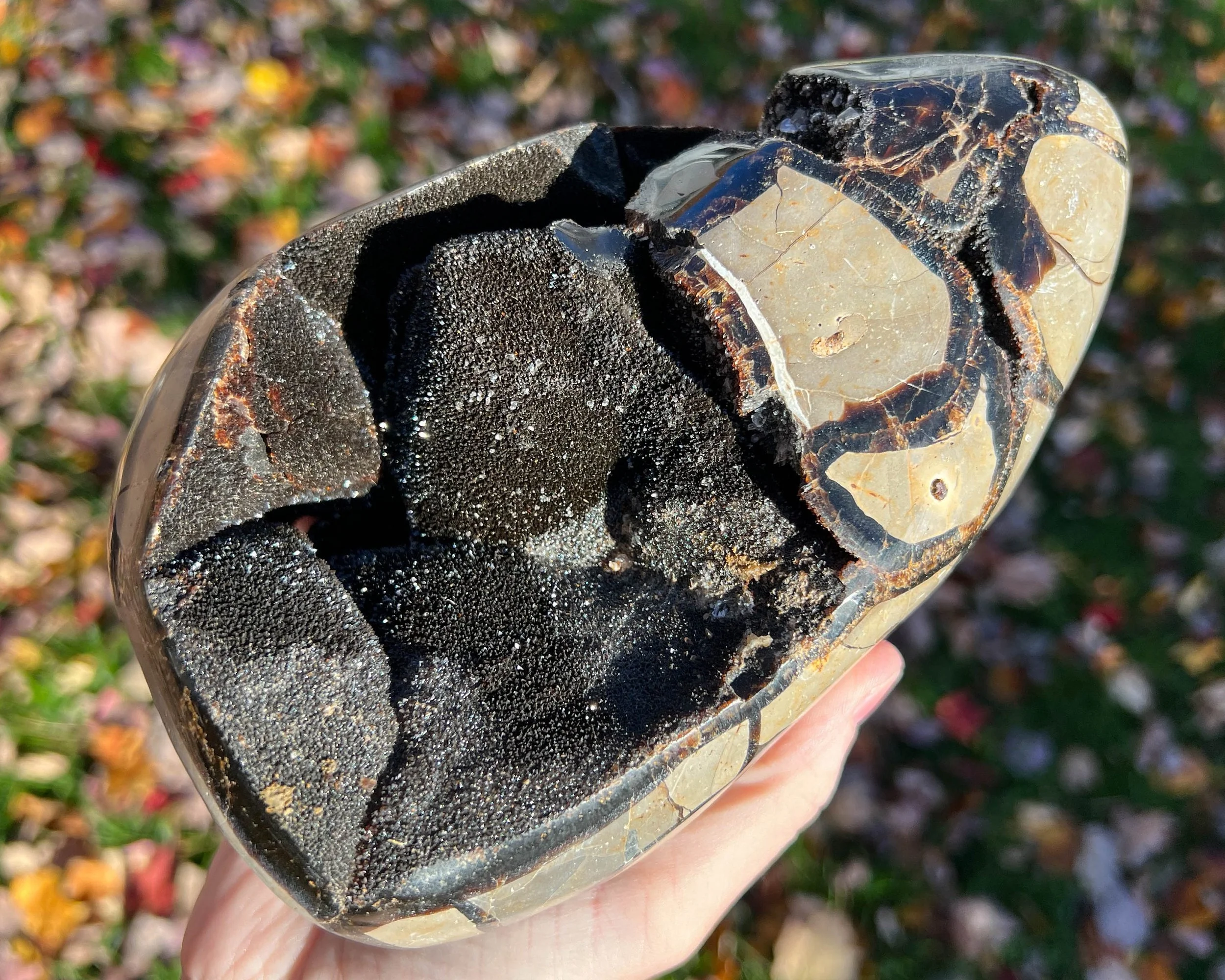 This is a beautiful "dragon's egg" or Septarian nodule stone geode coated in sparkling druzy Aragonite crystals :) This one is cut on the bottom so that it is self standing and great for displaying! Also called a Septarian egg, these are basically crystallized balls of mud which have been replaced by limestone, Calcite and Aragonite. This one also has some Barite crystals too.