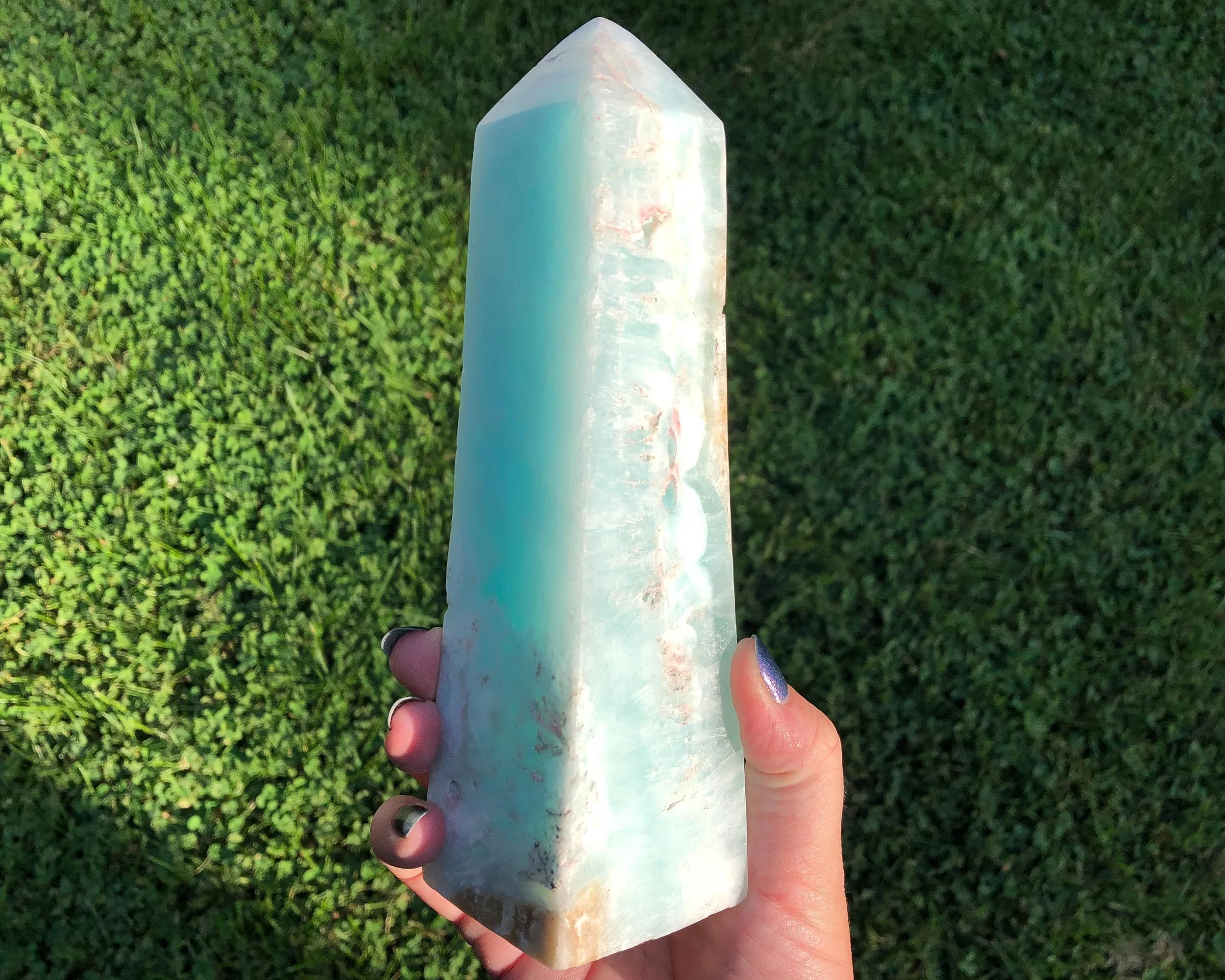 This is a crystal tower carved from beautiful blue Caribbean Calcite. It has a lovely blue coloring reminiscent of a tropical ocean, polished into a lovely self standing point. <3