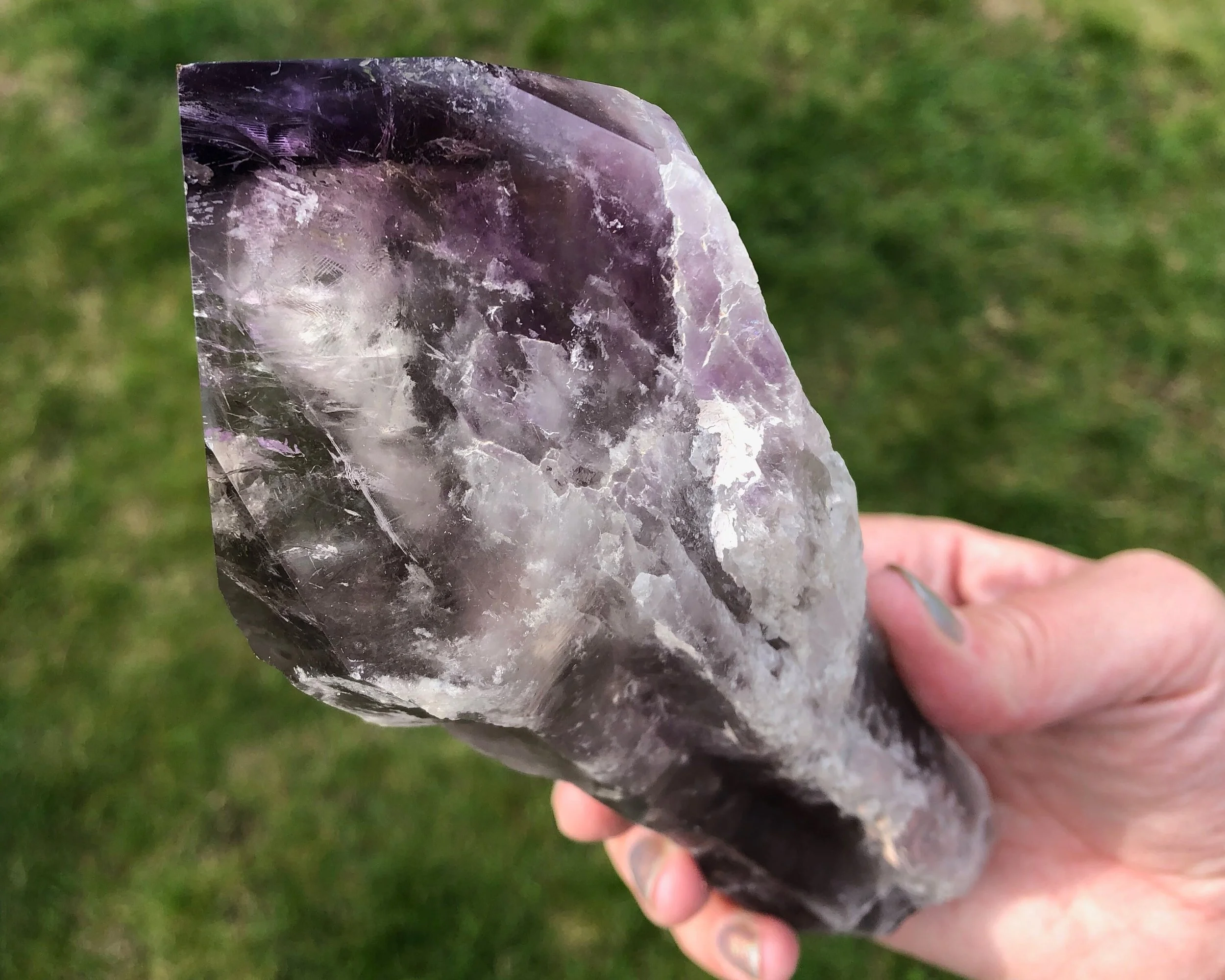 This is a high quality Bahia Amethyst point that is translucent with a phantom, smokiness and zoning of color. The variance in both make it all the more pretty and interesting to look into :) The termination is polished and the rest is left natural.