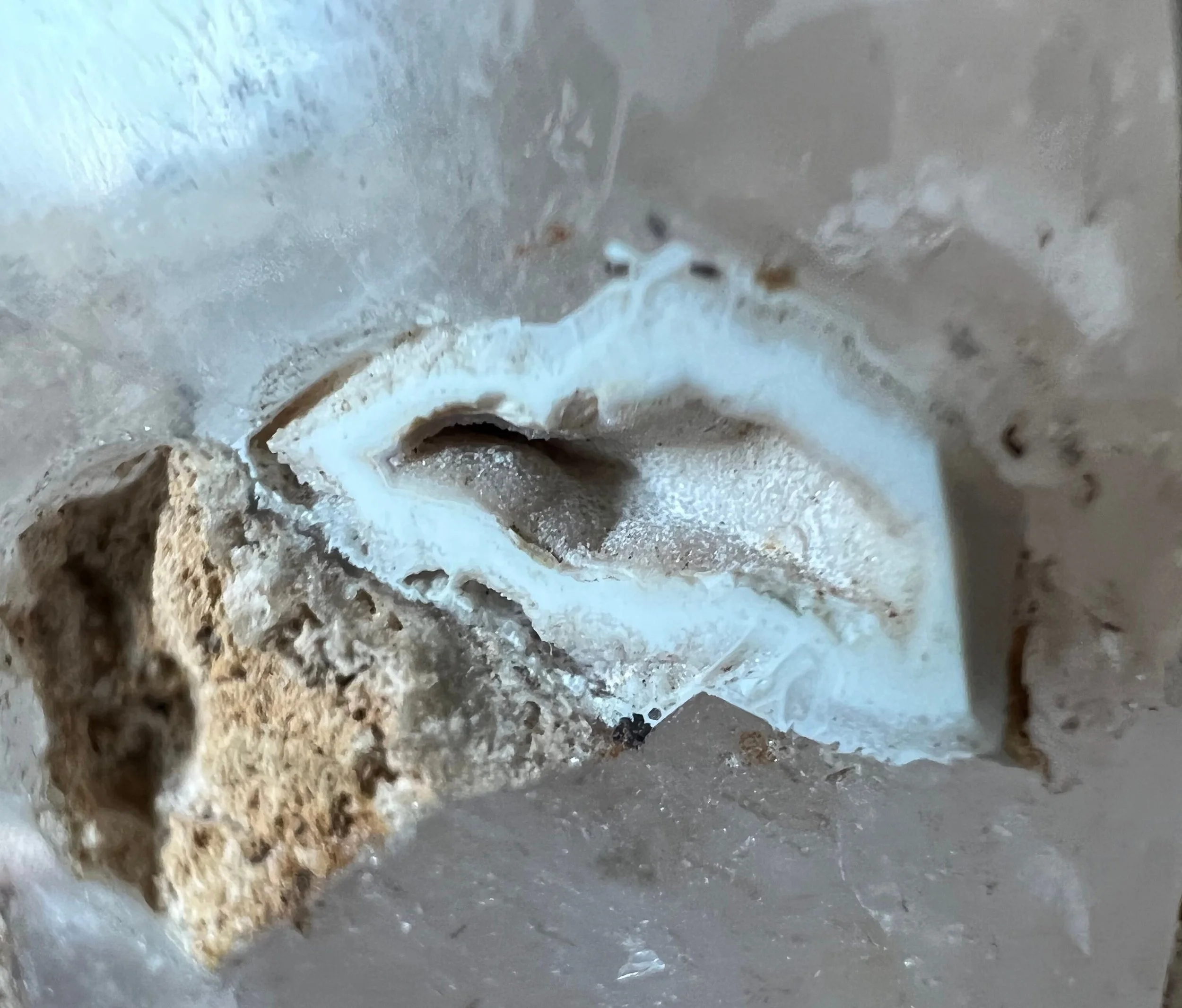This is a lovely large clear Quartz crystal tower. It is a polished, self standing point. It has natural pretty rainbows all over, a lot more than it appears in the photos. It has on one side near the bottom a little open pocket lined with Chalcedony and druzy Quartz, and on the bottom has more pockets lined with Chalcedony and banded Agate with druzy Quartz. It has some Hematite inclusions too, though mostly it is clear. It glows beautifully when backlit. A large and sturdy crystal that makes a great statement piece for home decor.