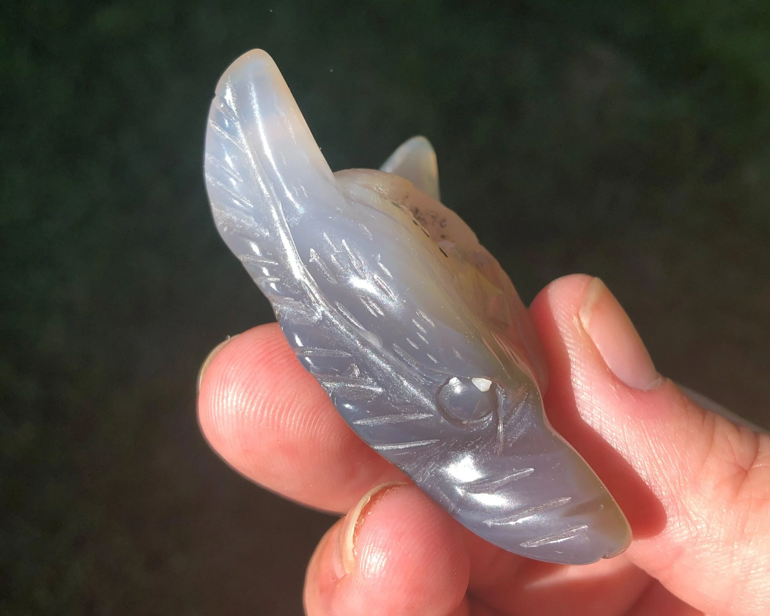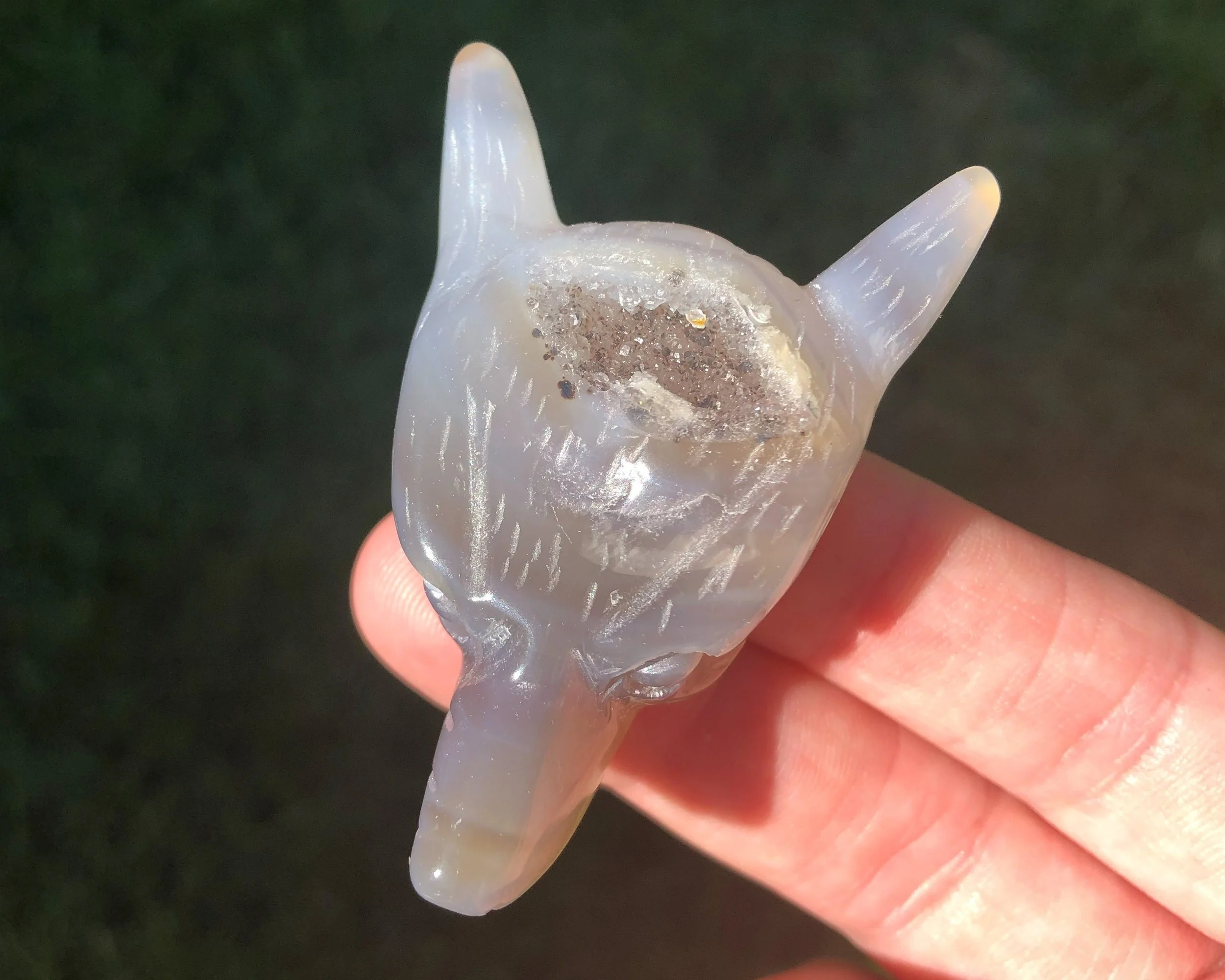 Image 1 of 9 Image 2 of 9 Image 3 of 9 Image 4 of 9 Image 5 of 9 Image 6 of 9 Image 7 of 9 Image 8 of 9 Image 9 of 9 Agate Wolf Head Carving with Druzy Quartz Pocket #2 Gray Crystal Wolf Coyote Fox Face, Banded Crystal, Spirit Animal, Totem Gift for Her Him $27.00 This is a lovely natural gray Agate wolf head with a druzy Quartz pocket. It is lovely, sparkly and the carving is well detailed. This piece is NOT drilled there is no hole in it. Measures 2.1 x 1.5 x .6 inches Weighs 34 grams Thanks for looking! :) Kouva Dream Catchers <3 Add To Cart Added! This is a lovely natural gray Agate wolf head with a druzy Quartz pocket. It is lovely, sparkly and the carving is well detailed. This piece is NOT drilled there is no hole in it. Measures 2.1 x 1.5 x .6 inches Weighs 34 grams Thanks for looking! :) Kouva Dream Catchers <3 Reviews Reviewer Name Review Date Star Rating Description Posted on Etsy Product Show More