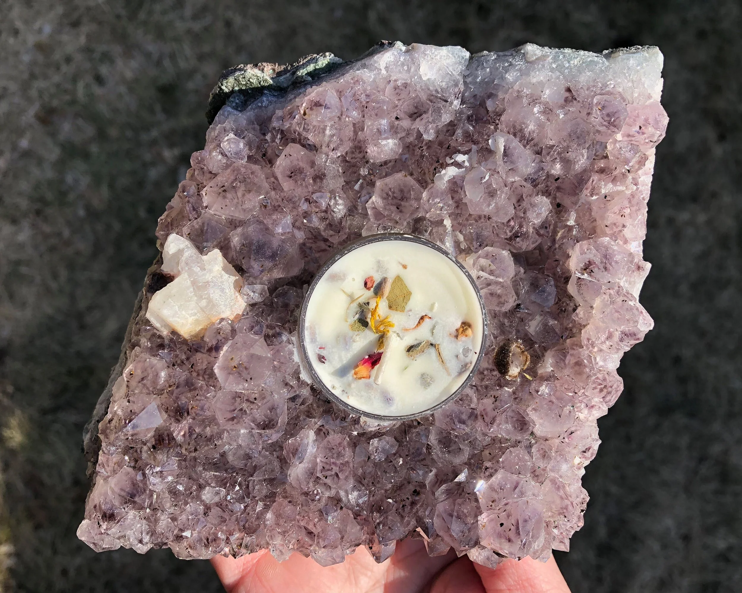 Amethyst Cluster Candle Holder #3 with Eucalyptus Clove Tea Light, with Calcite, Witchy Living Room Decor, Gift for Mom, February Birthstone