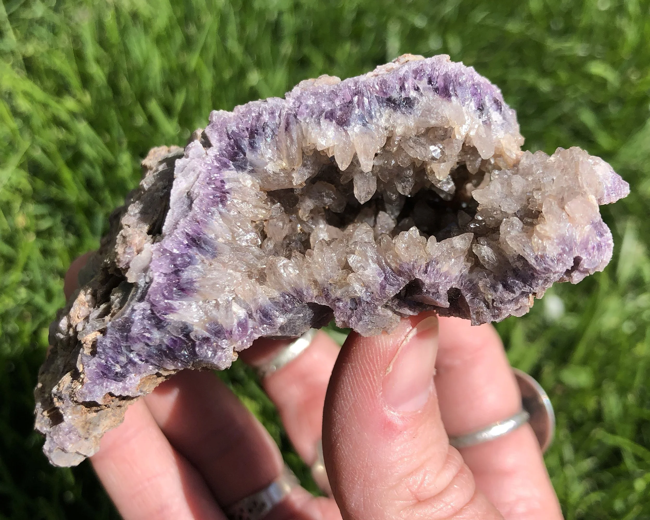 This is a gorgeous Amethyst geode piece with light Smoky Quartz crystals layered over deep purple. The coloring is awesome and on the outside of it geode is all pseudomorphs, or casts of crystals that once were there but have dissolved away.