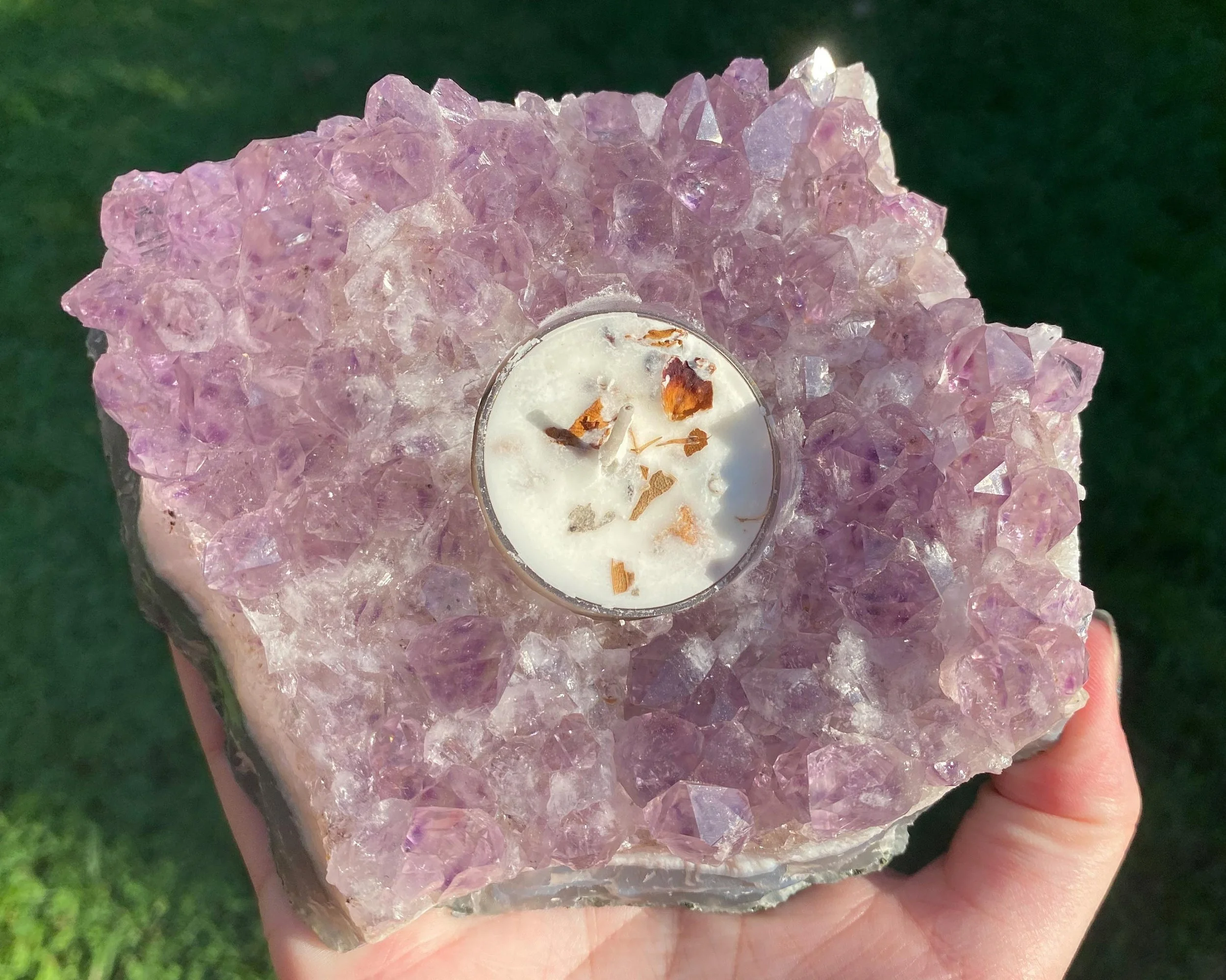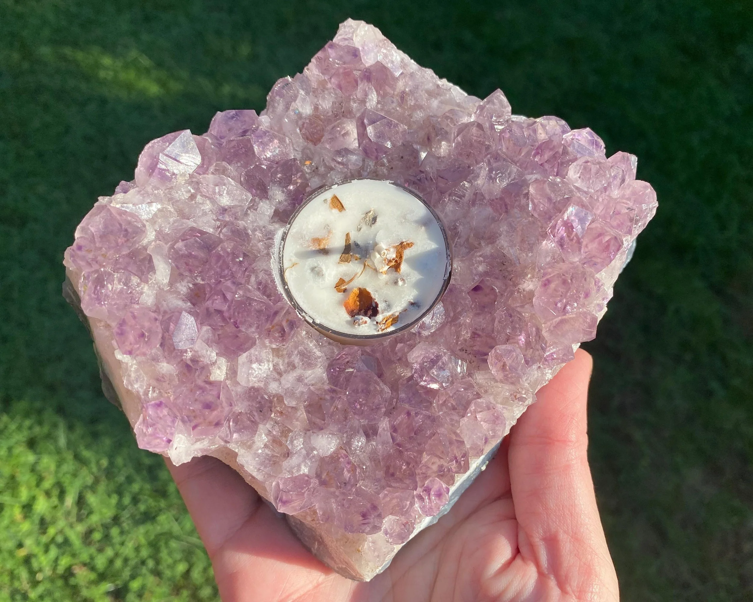 Amethyst Crystal Cluster Candle Holder #a3 Vegan Handmade Eucalyptus Clove Tea Light, Goethite Inclusions, Gemstone Home Accent Witchy Gift