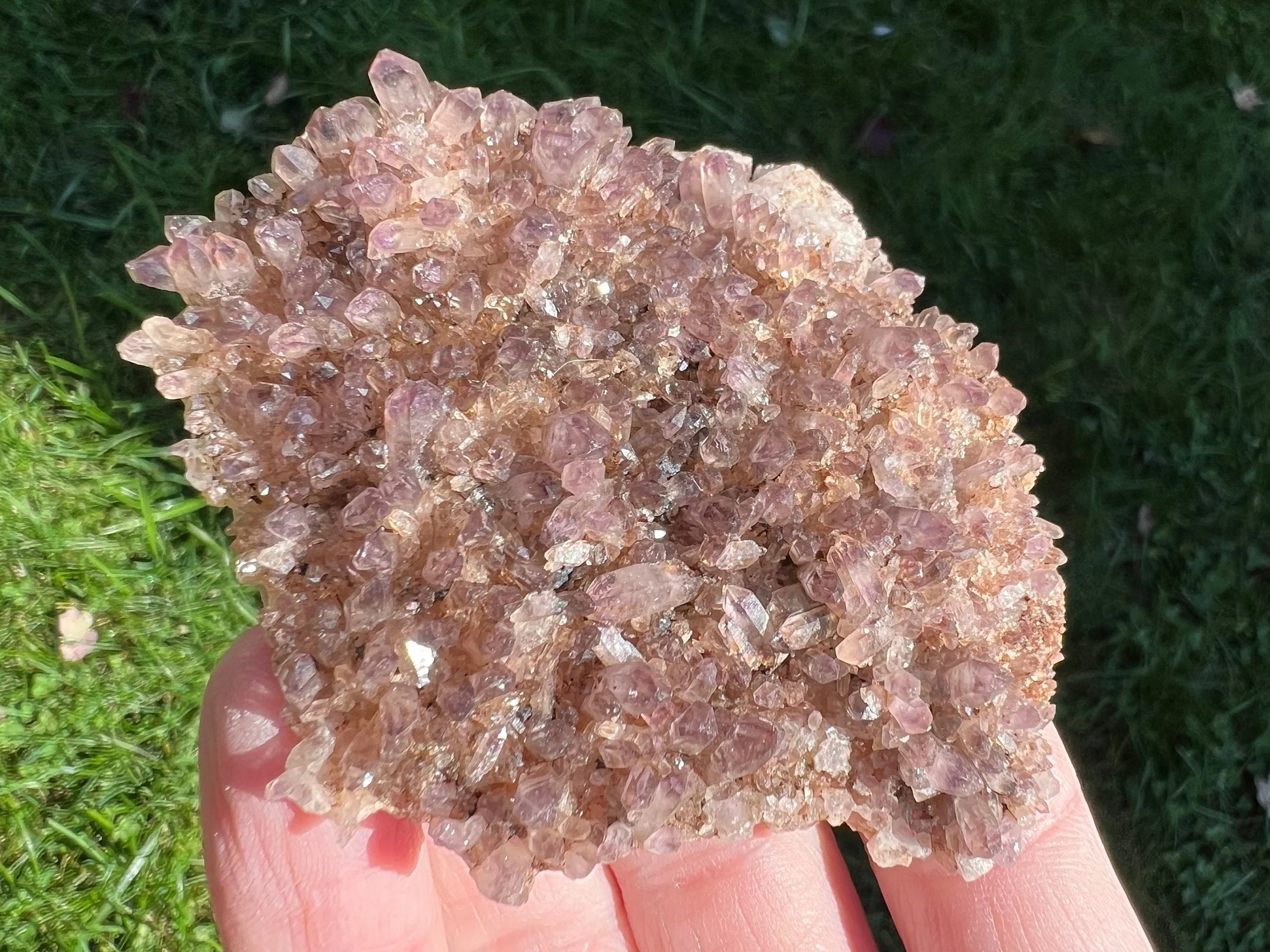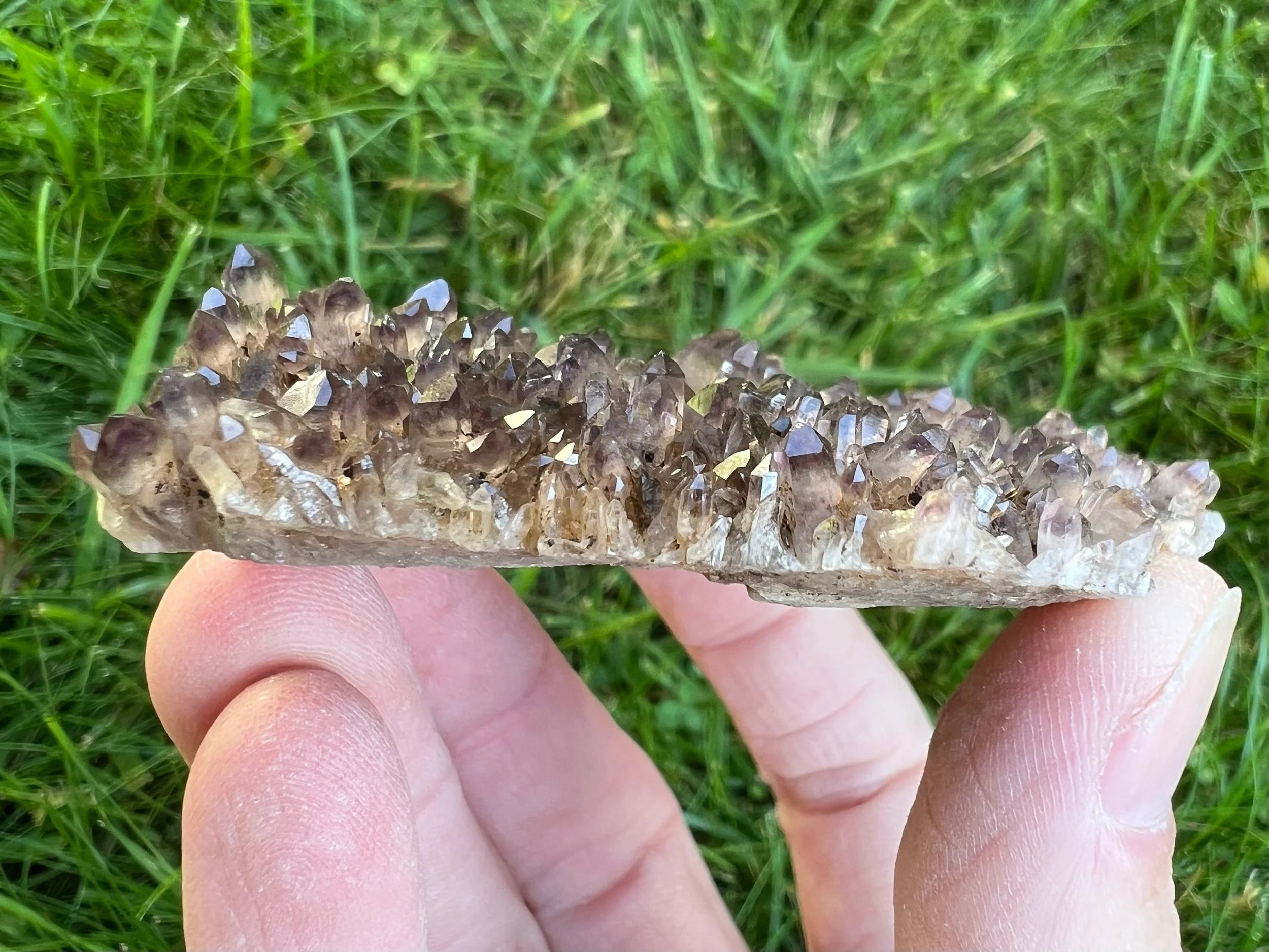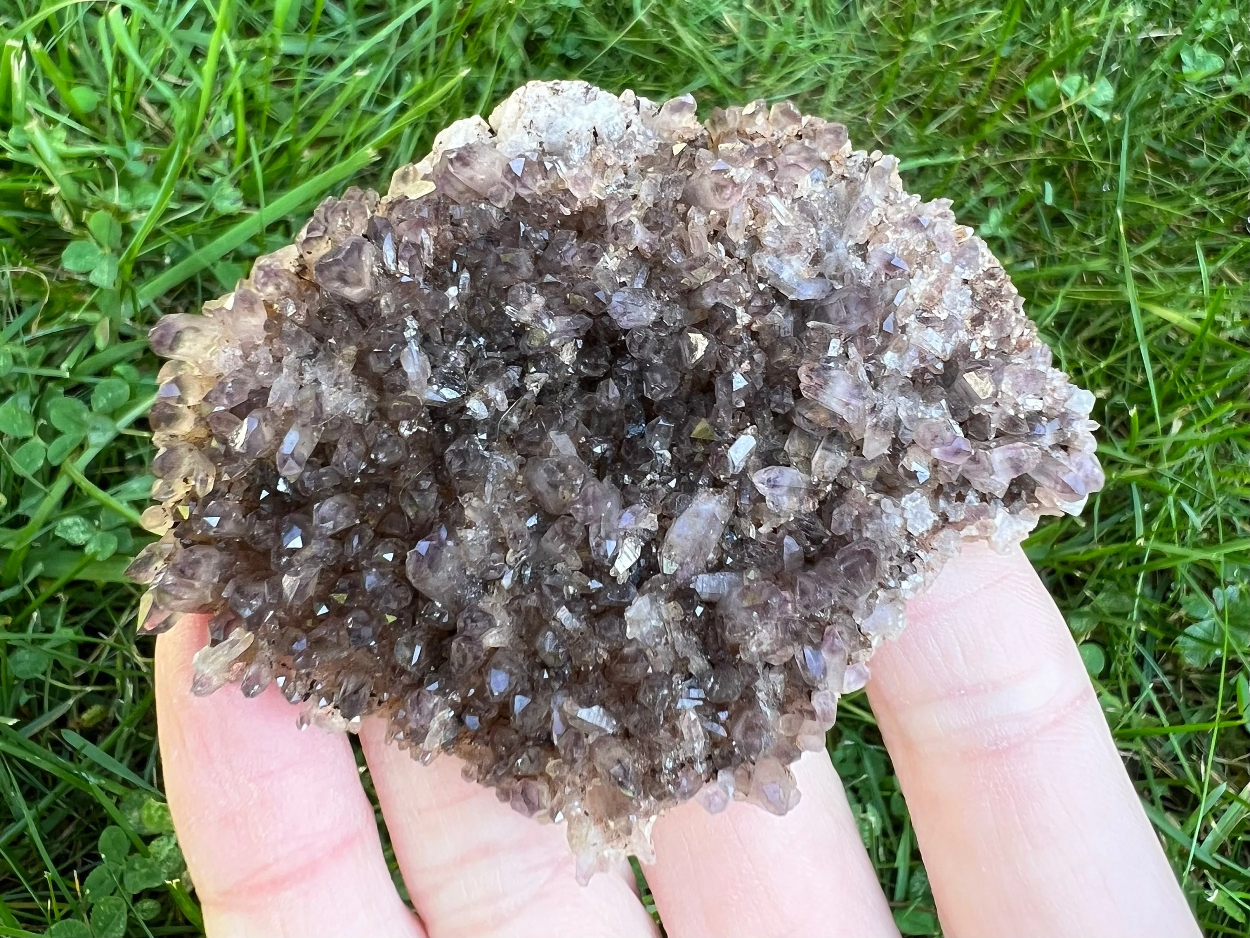 This is a beautiful natural Amethyst cluster hand dug from the Kingston Range of the Mojave Desert, in San Bernardino, California. The crystals are sparkling points with beautiful zoning of dark to light within each crystal. Most of the bottom is covered in tiny glittering Quartz druzy. This is a really pretty piece with lovely color and aesthetic. It would make a wonderful gift to yourself or a loved one <3