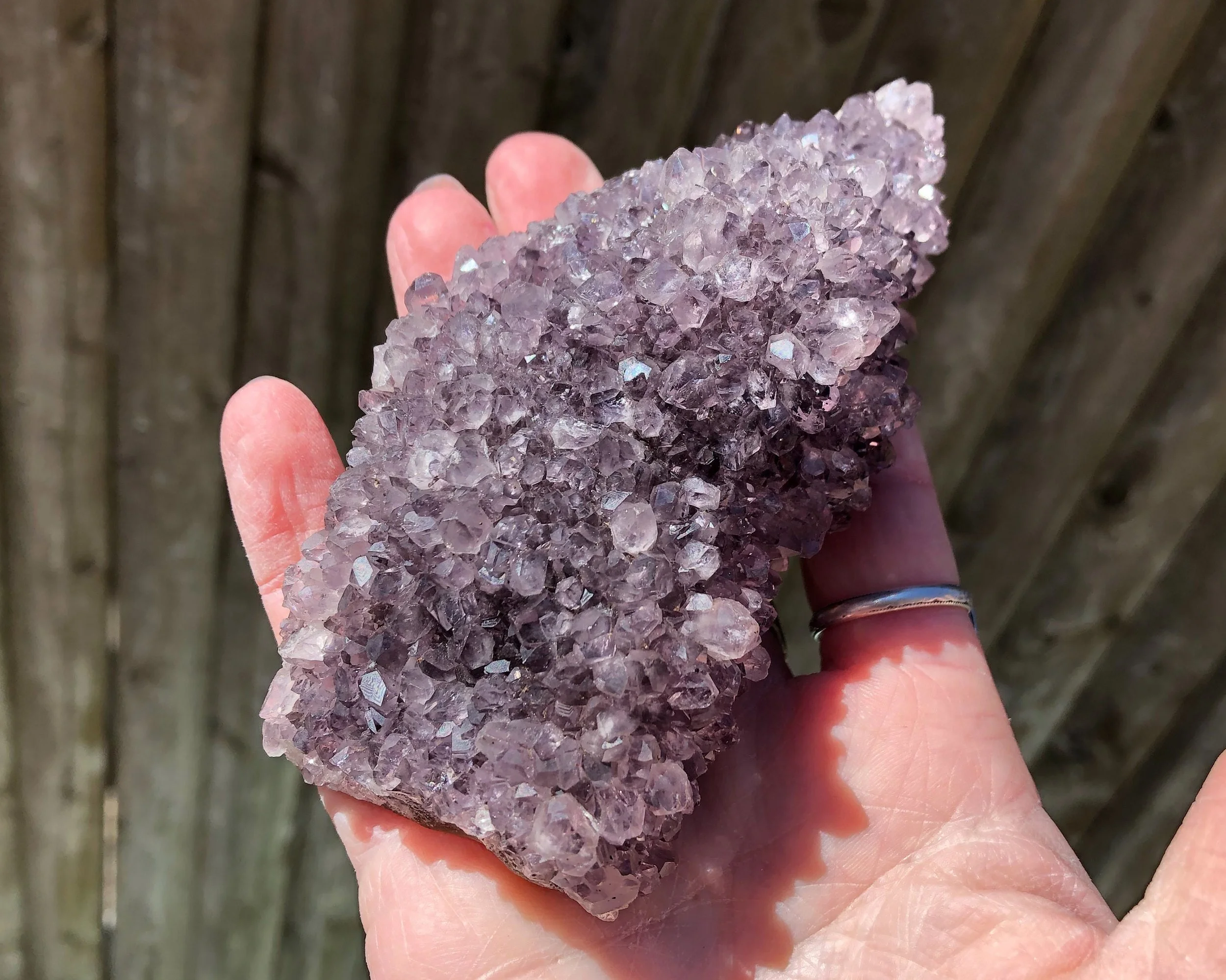 This is a beautiful cluster of dark purple Amethyst rosettes with rounded, flowery shapes. It has a mix of dark and lighter / clearer crystals giving it a kind of frosted look. It has crystals much of the way around it, on top of agate. Very sparkly and beautiful! <3