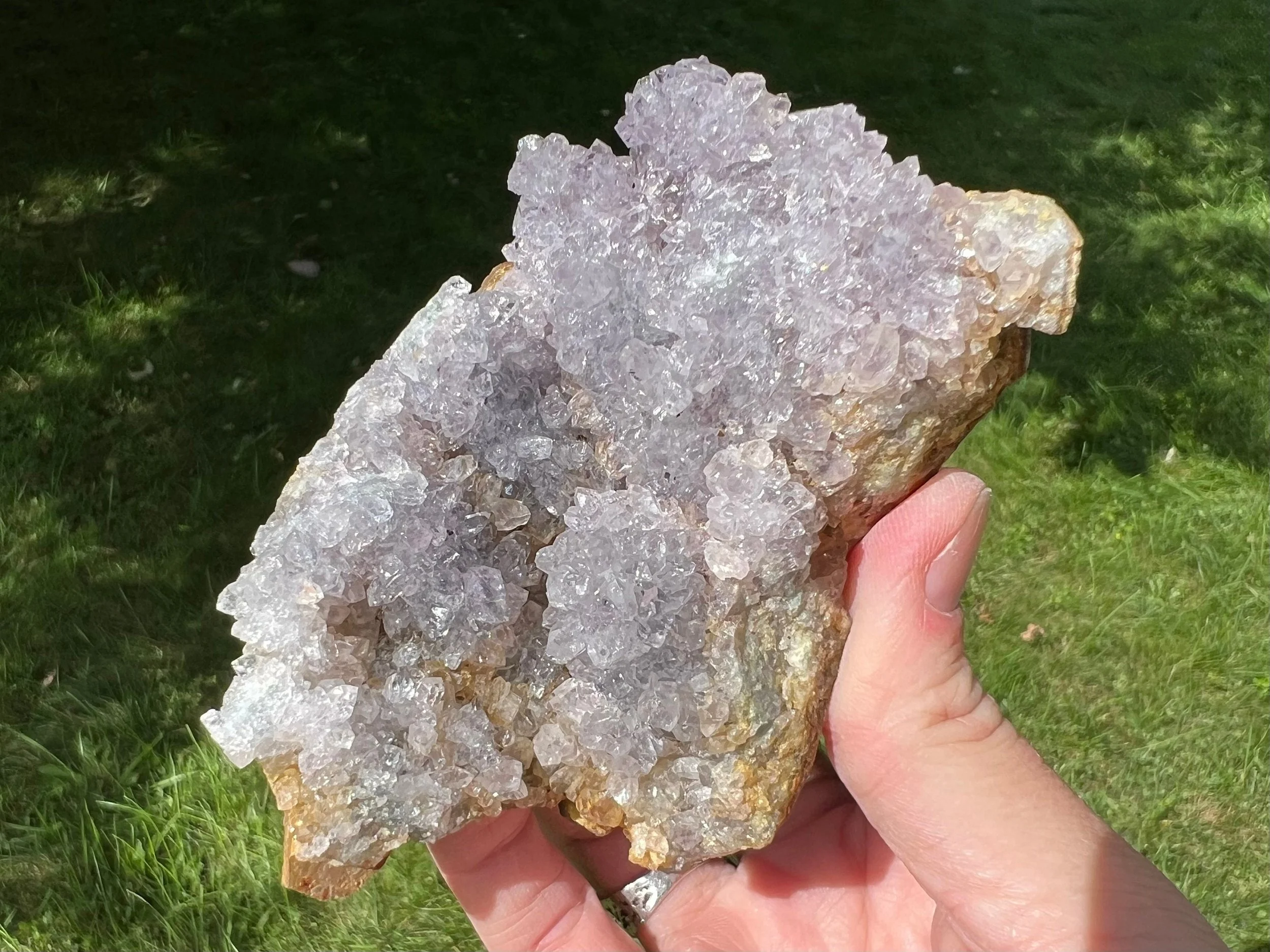 This is a beautiful cluster of sparkling Amethyst Stalactites! The flowery stalactites are unique and rare and very aesthetic! Nice light bluish purple color. <3