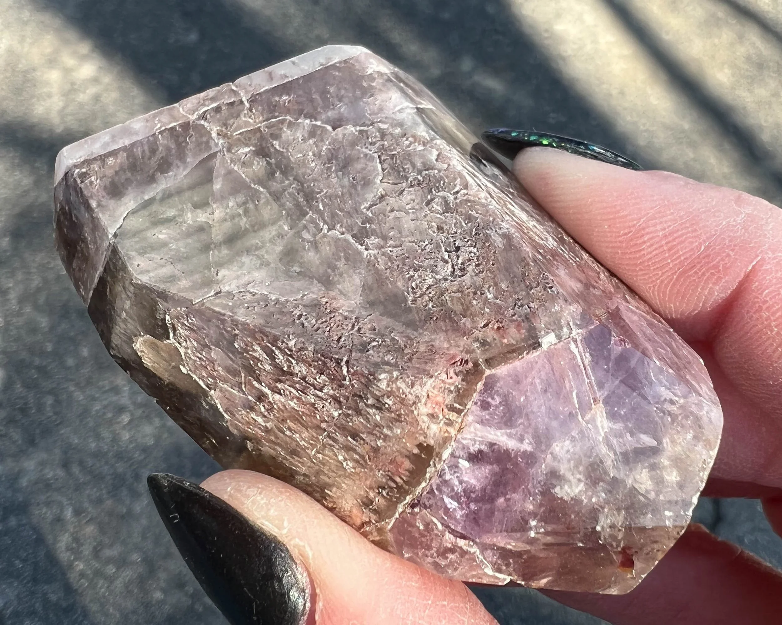 This is a gorgeous Amethyst crystal with inclusions from Brazil. On one side we start with Amethyst, with a nice bright purple with crisp definition of a phantom. Above that we have beautiful soft pink inclusions, probably Hematite- possibly Amphibole Hematite as they appear very fibrous. They are like small fluffy feathers that fan out. There is Rutile which is hard to capture but can be seen if backlit. As we move further, the stone becomes more of a golden honey color - Smoky Citrine. You can see it best in the backlit photo showing very yellow tones in the crystal.