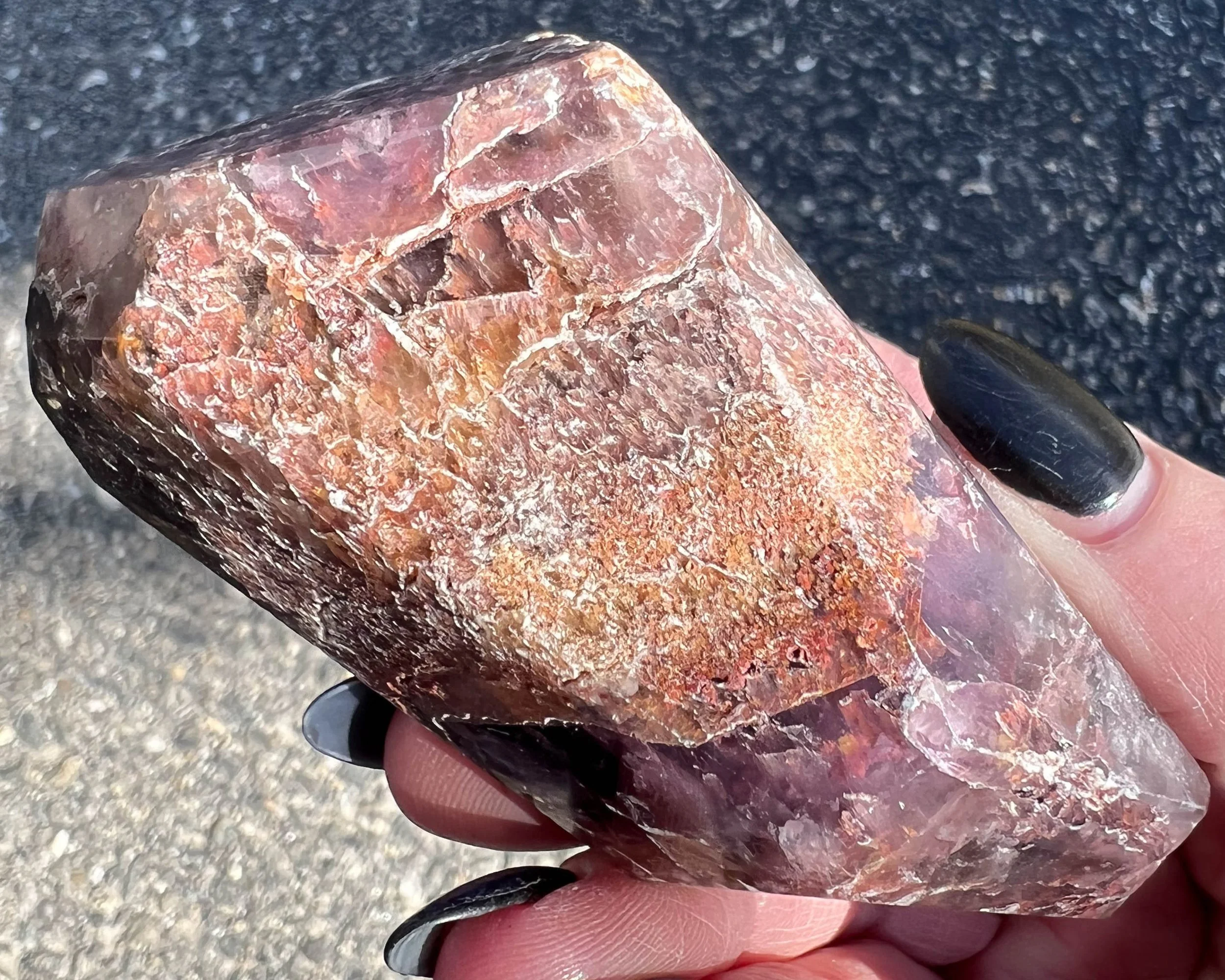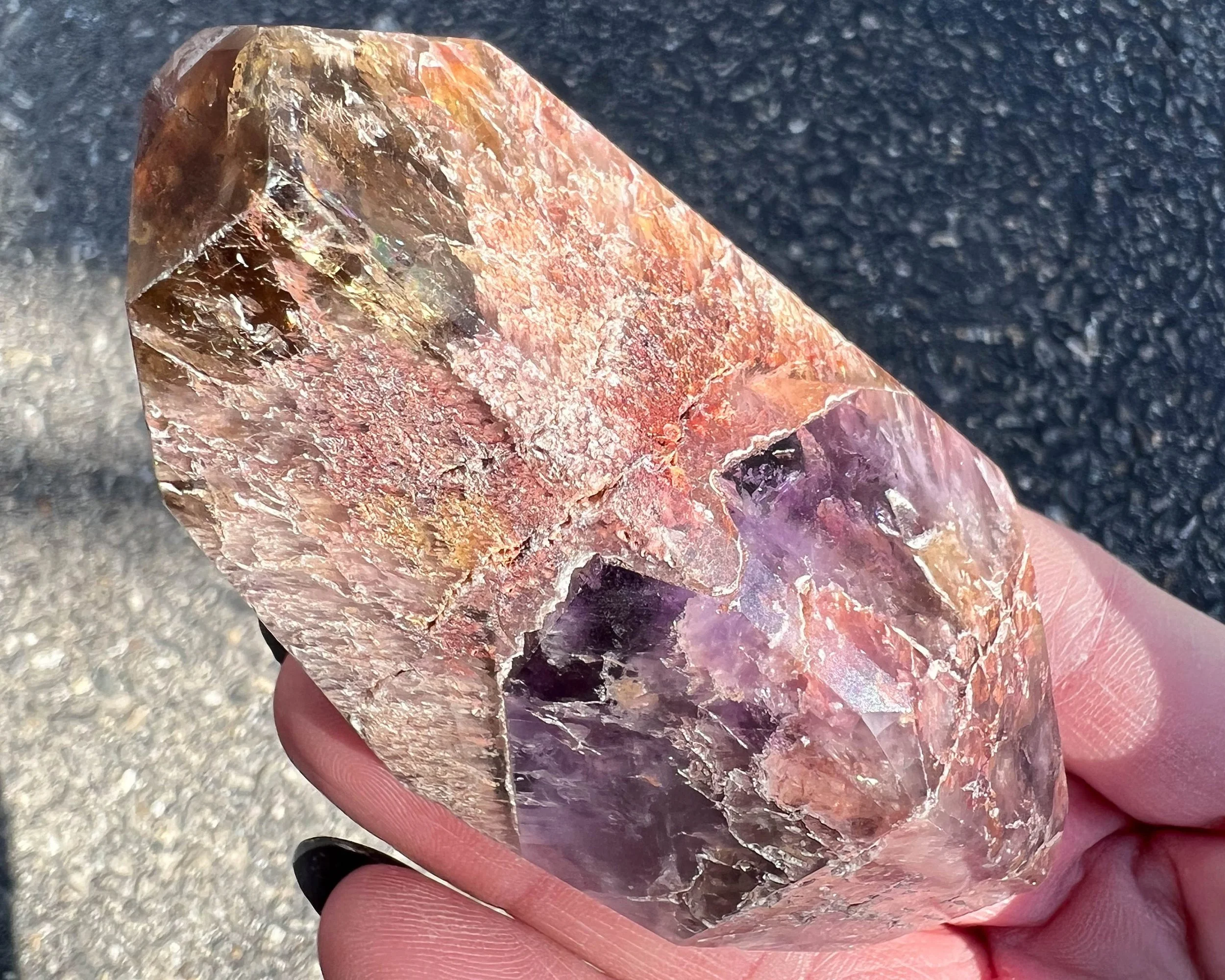 This is a gorgeous Amethyst crystal with inclusions from Brazil. On one side we start with Amethyst, with a nice bright purple with crisp definition of a phantom. Above that we have beautiful soft pink inclusions, probably Hematite- possibly Amphibole Hematite as they appear very fibrous. They are like small fluffy feathers that fan out. There is Rutile which is hard to capture but can be seen if backlit. As we move further, the stone becomes more of a golden honey color - Smoky Citrine. You can see it best in the backlit photo showing very yellow tones in the crystal.