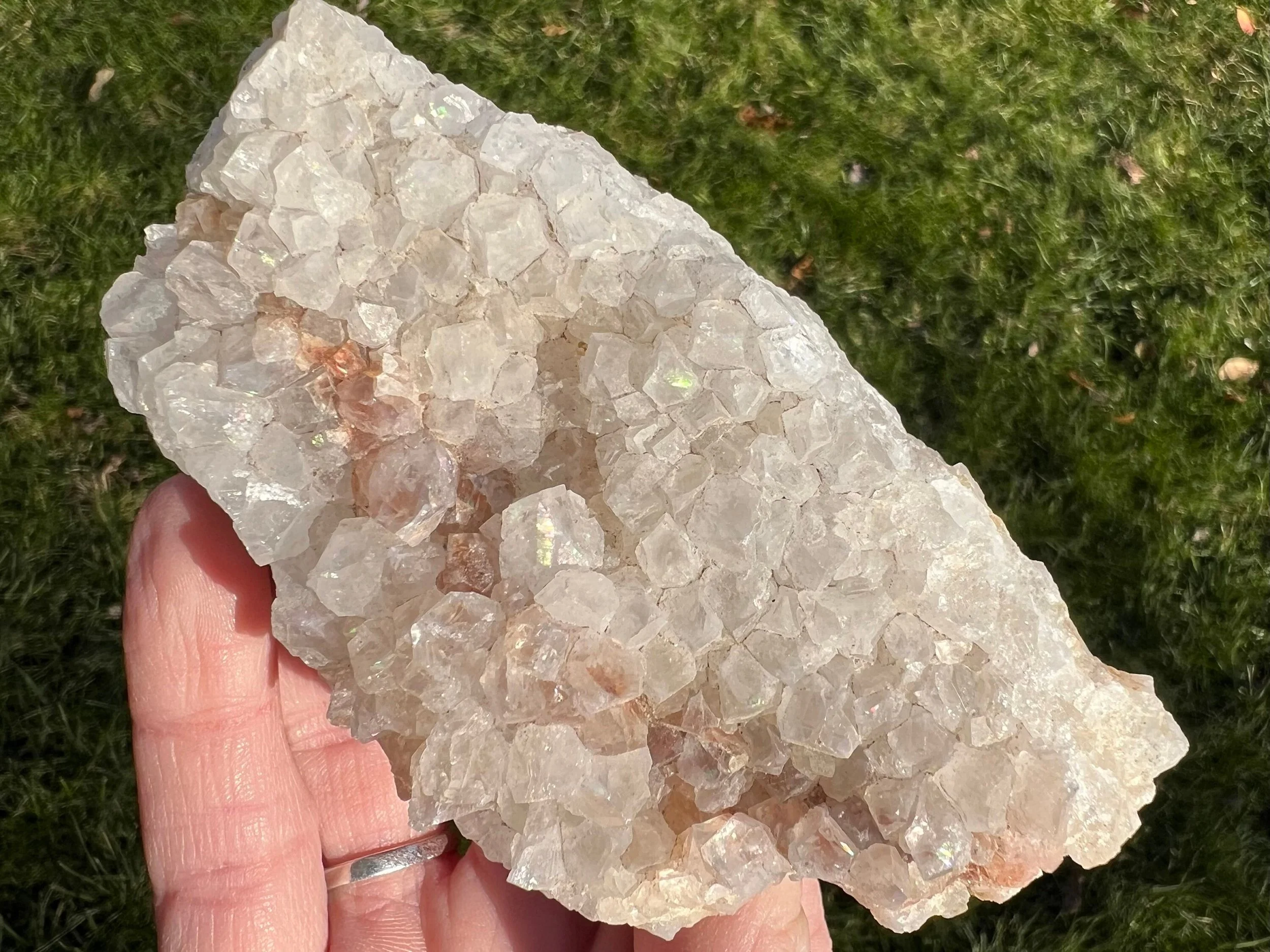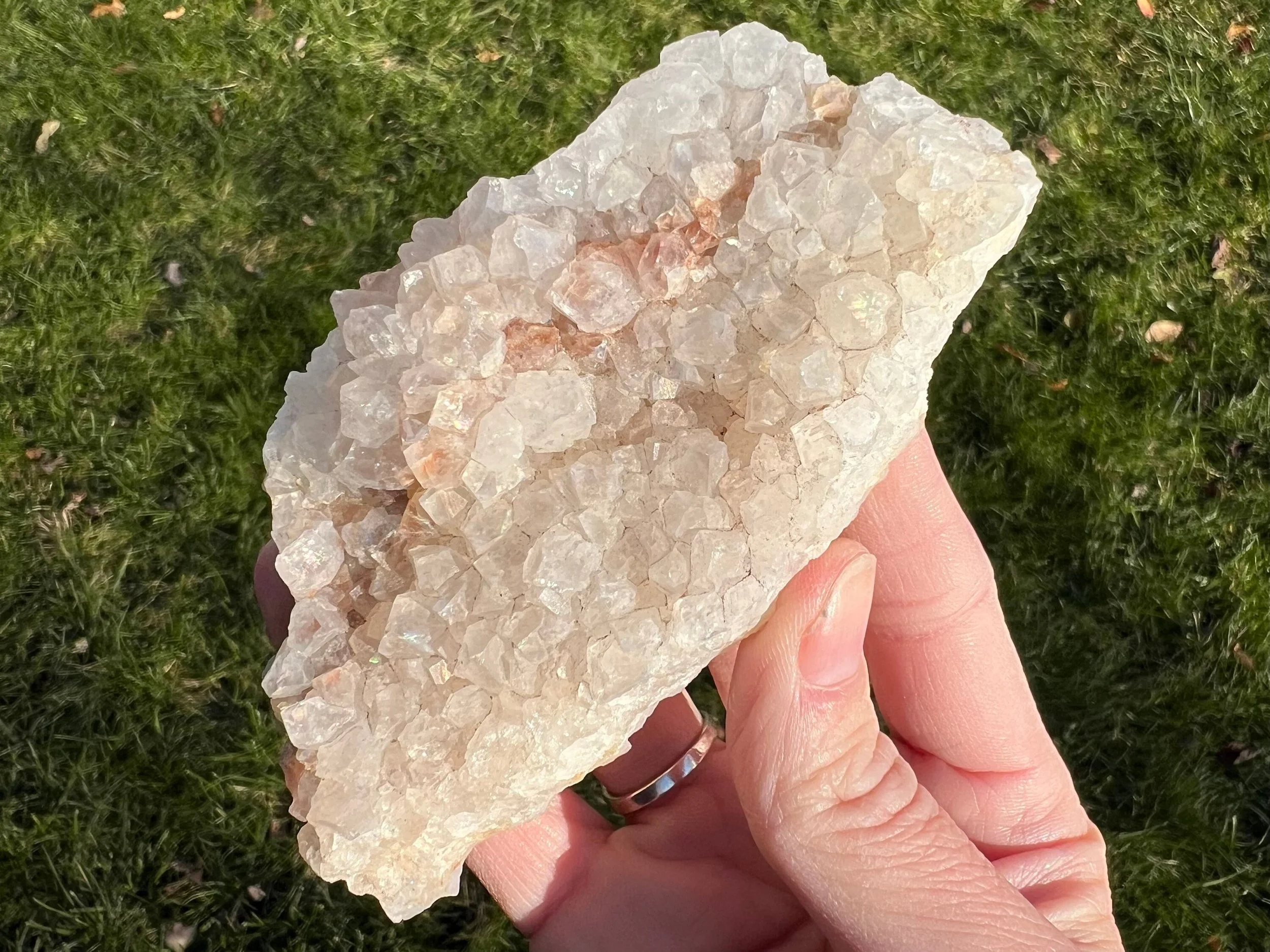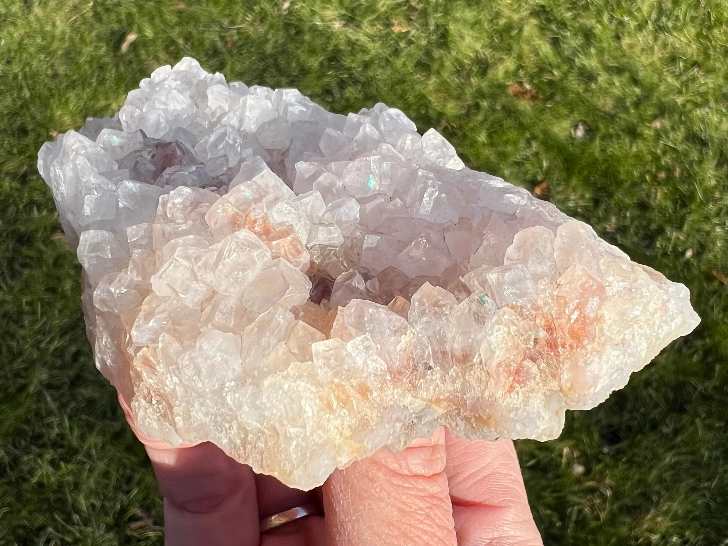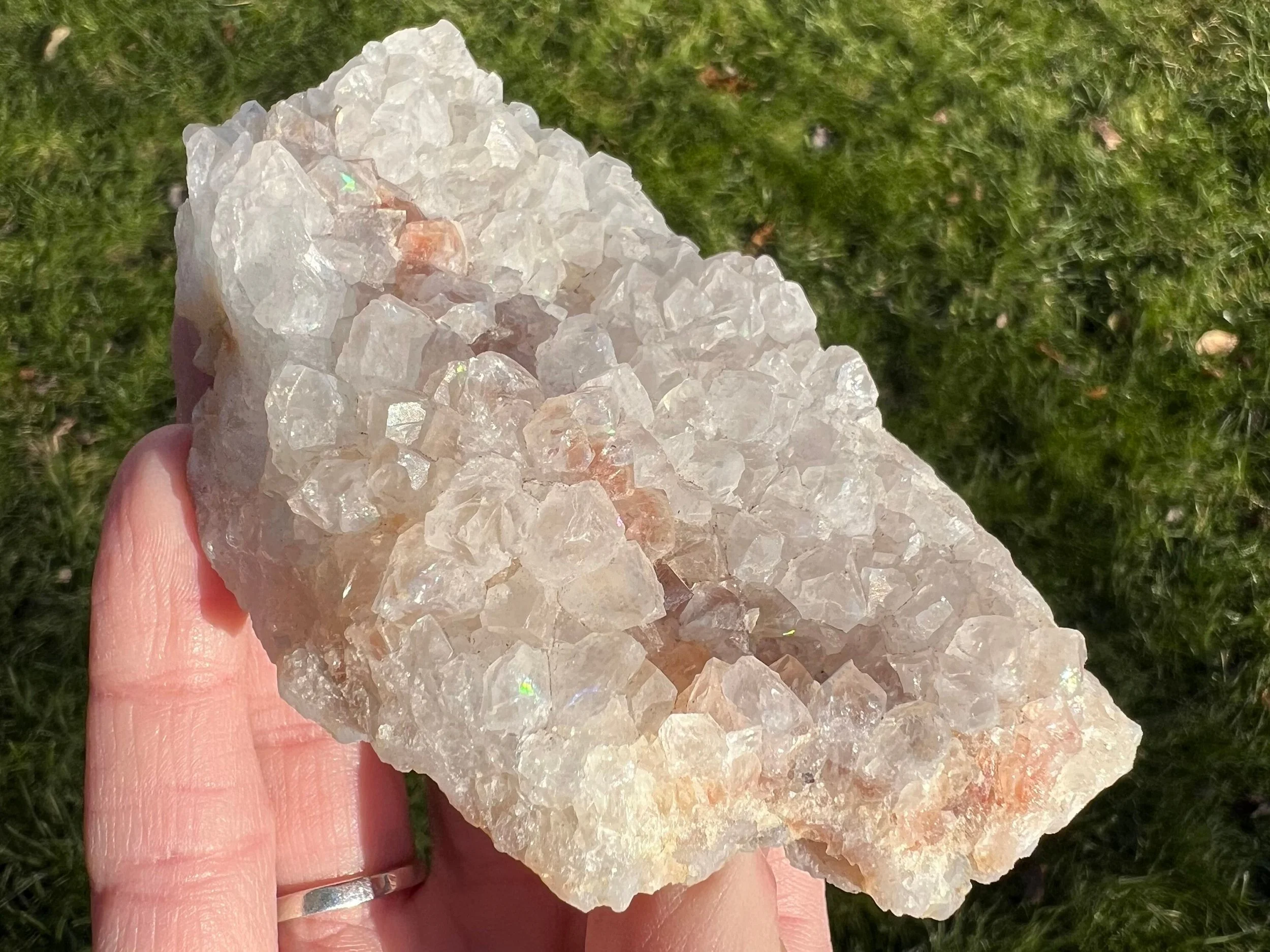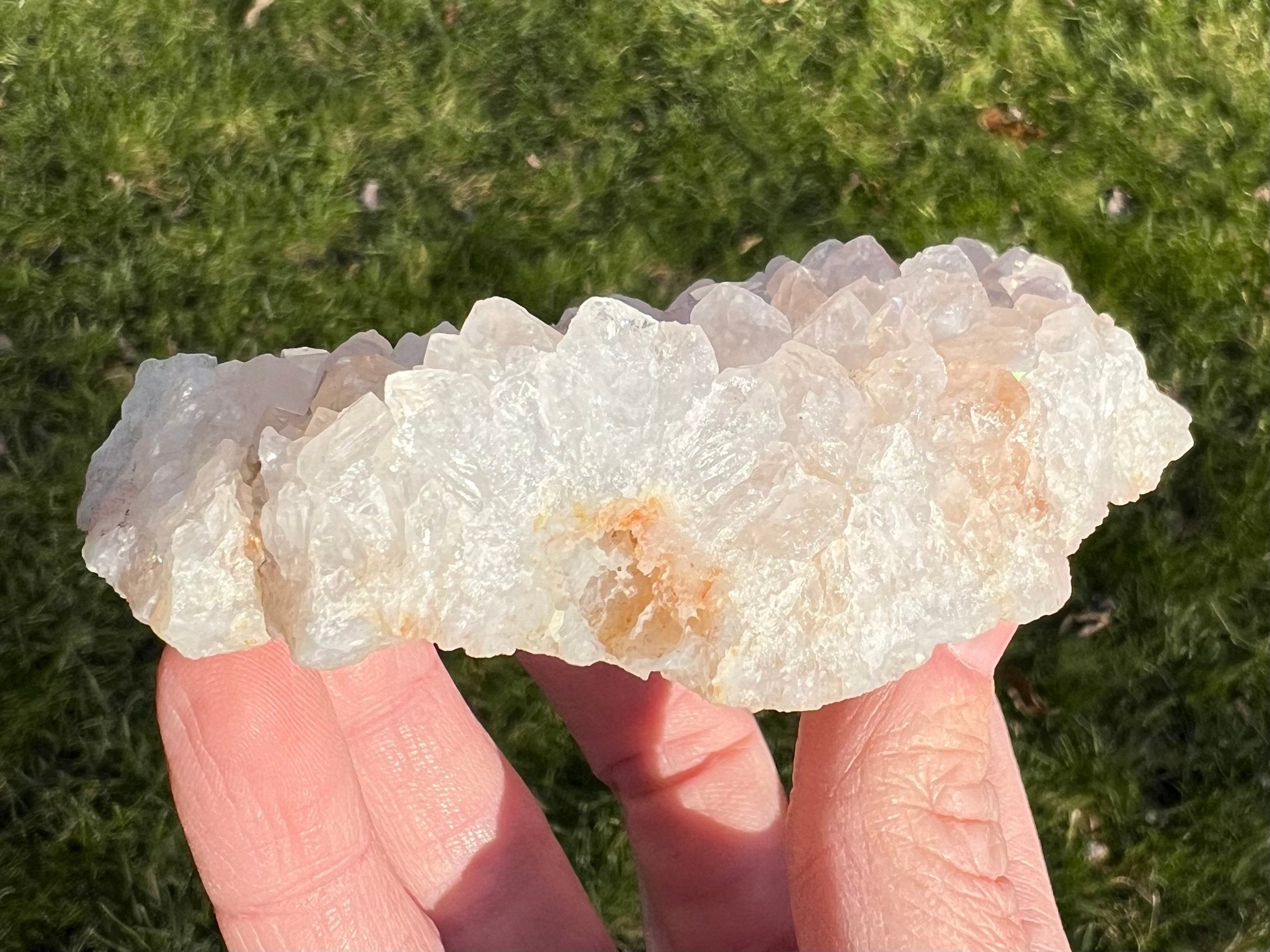 Anandalite is also known as Rainbow Quartz, Aurora Quartz, and Iris Quartz. It is completely natural crystal Quartz, usually forming in clusters of short, thick white points and often in stalactite or rosette formations, that has a natural iridescence to it, of natural rainbow flash that shows up on the faces of the Quartz crystals, thought to be caused by Rhodium. This type of Quartz occurs in India. It is similar to Angel Aura Quartz, though it is 100% natural, untreated and often a little more subtle in color. Its way better in person for sure!