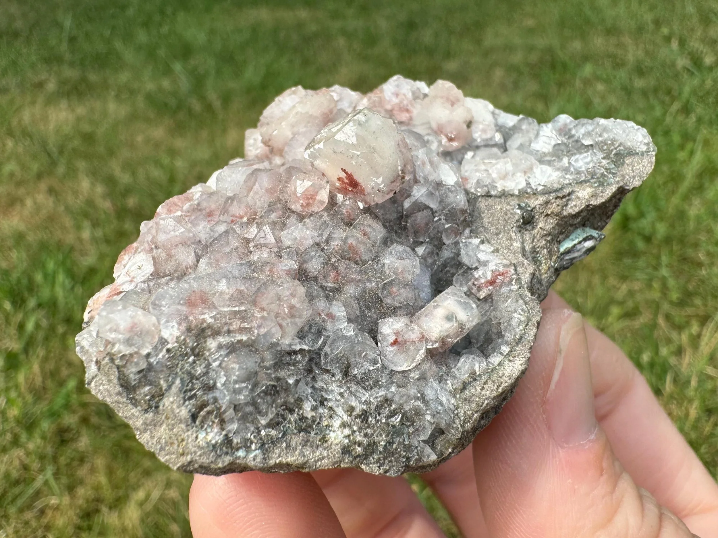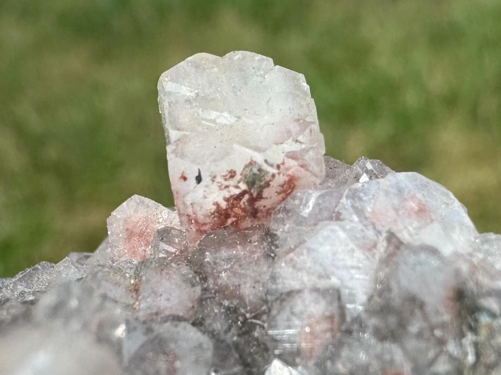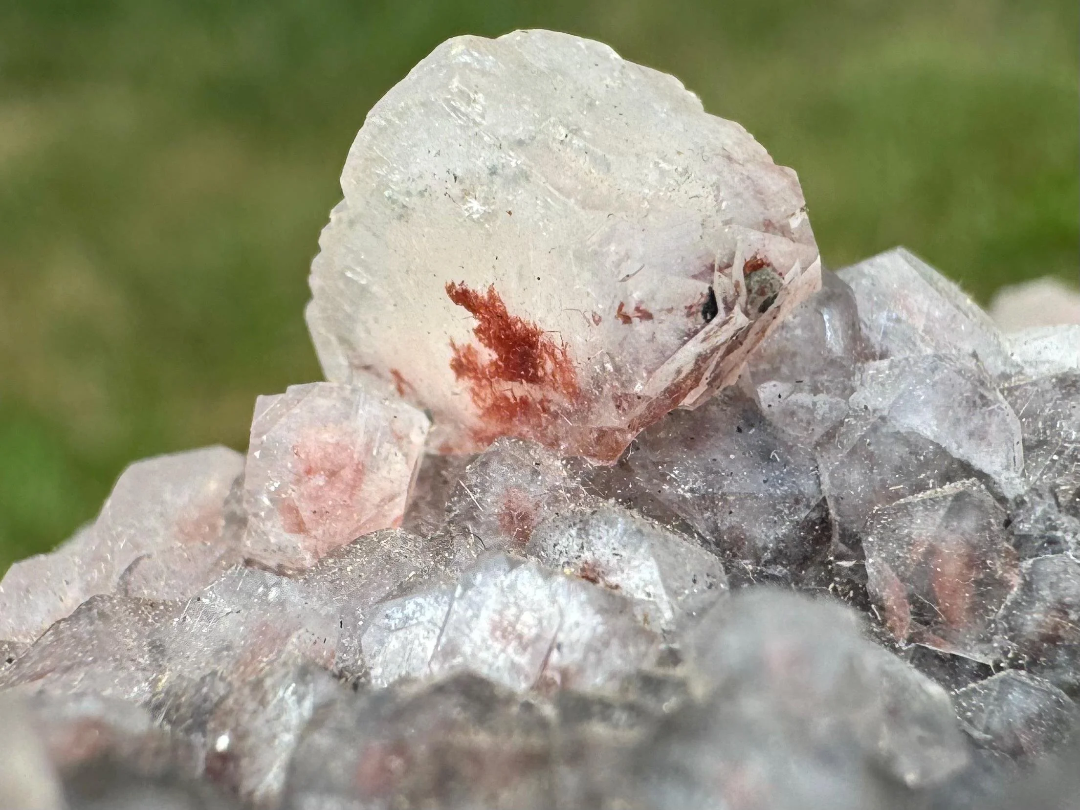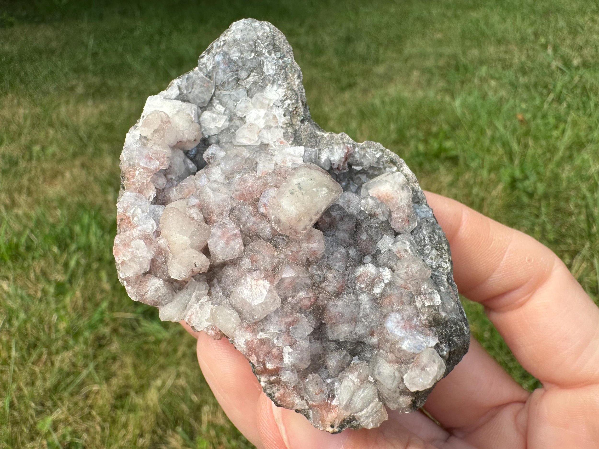 This is a cluster of Apophyllite cubes with red Hematite, plus light peach Stilbite crystals in a little geode. This is a mineral specimen from India. the red inside the clear Apophyllite looks really pretty, the crystals are mostly nice and lustrous with pink to dark red hematite coloring, with different amounts of the inclusion among the crystals. Some are more white than red. A nice little piece for home display, a gift for any rock lover, or a cute piece for an altar or crystal collection.
