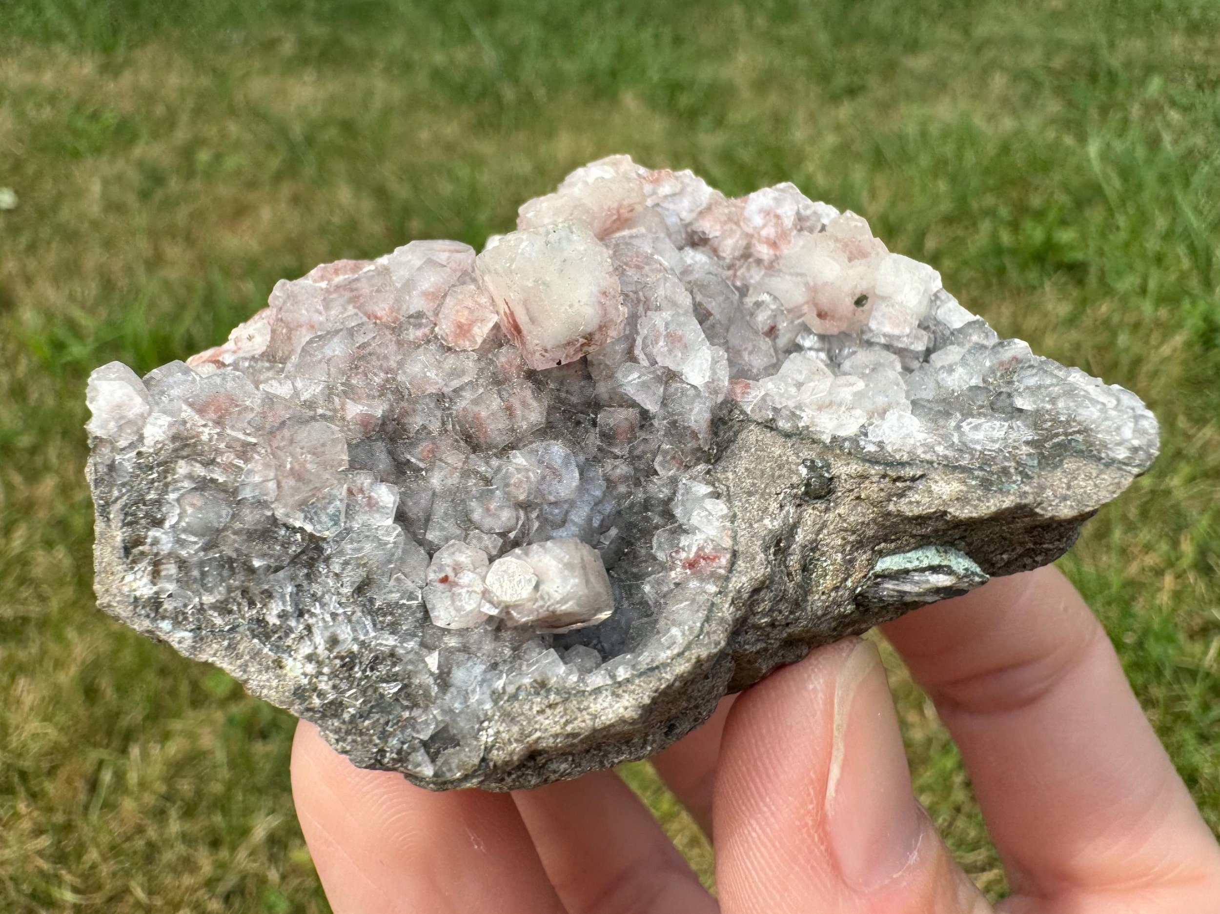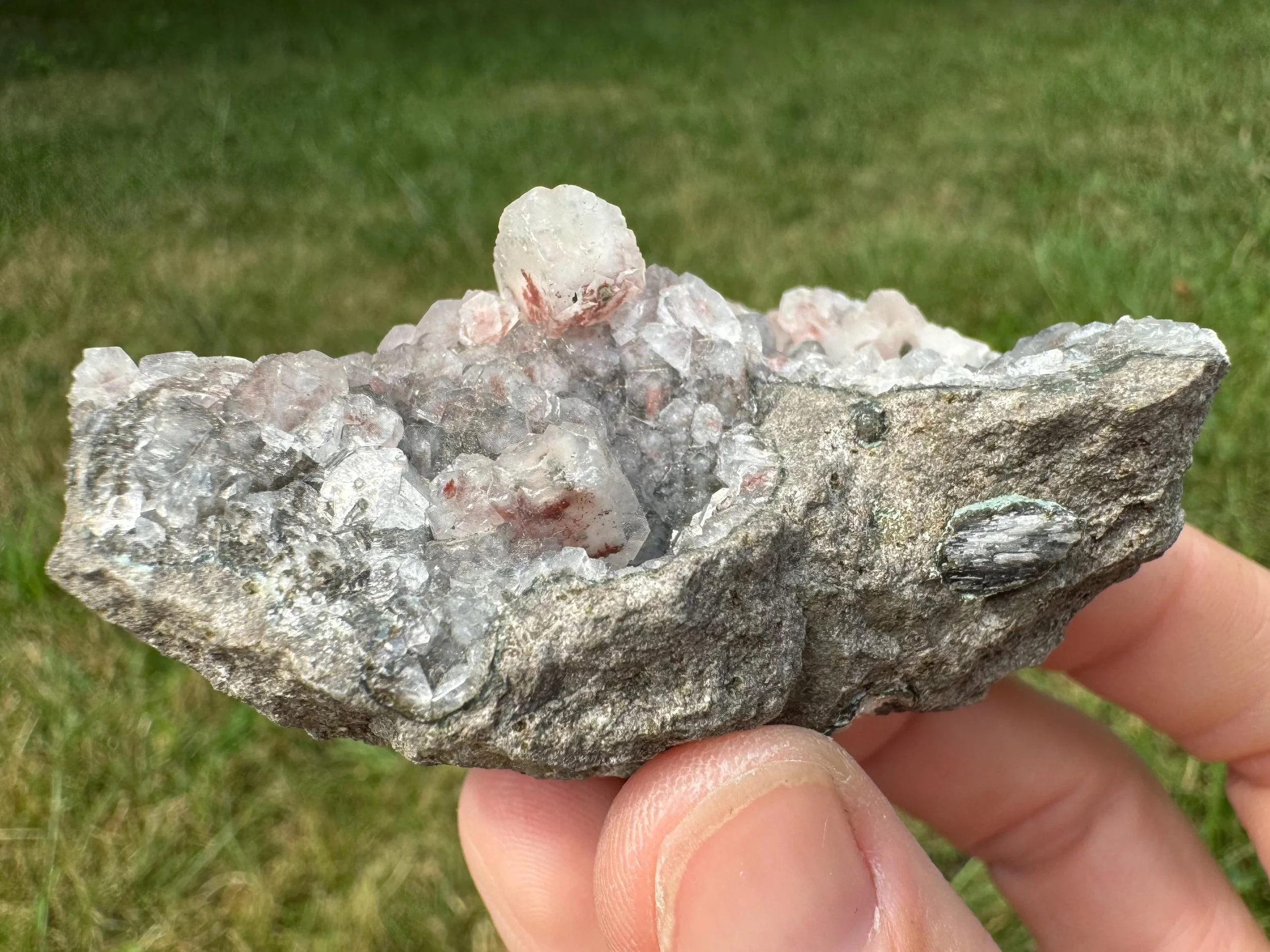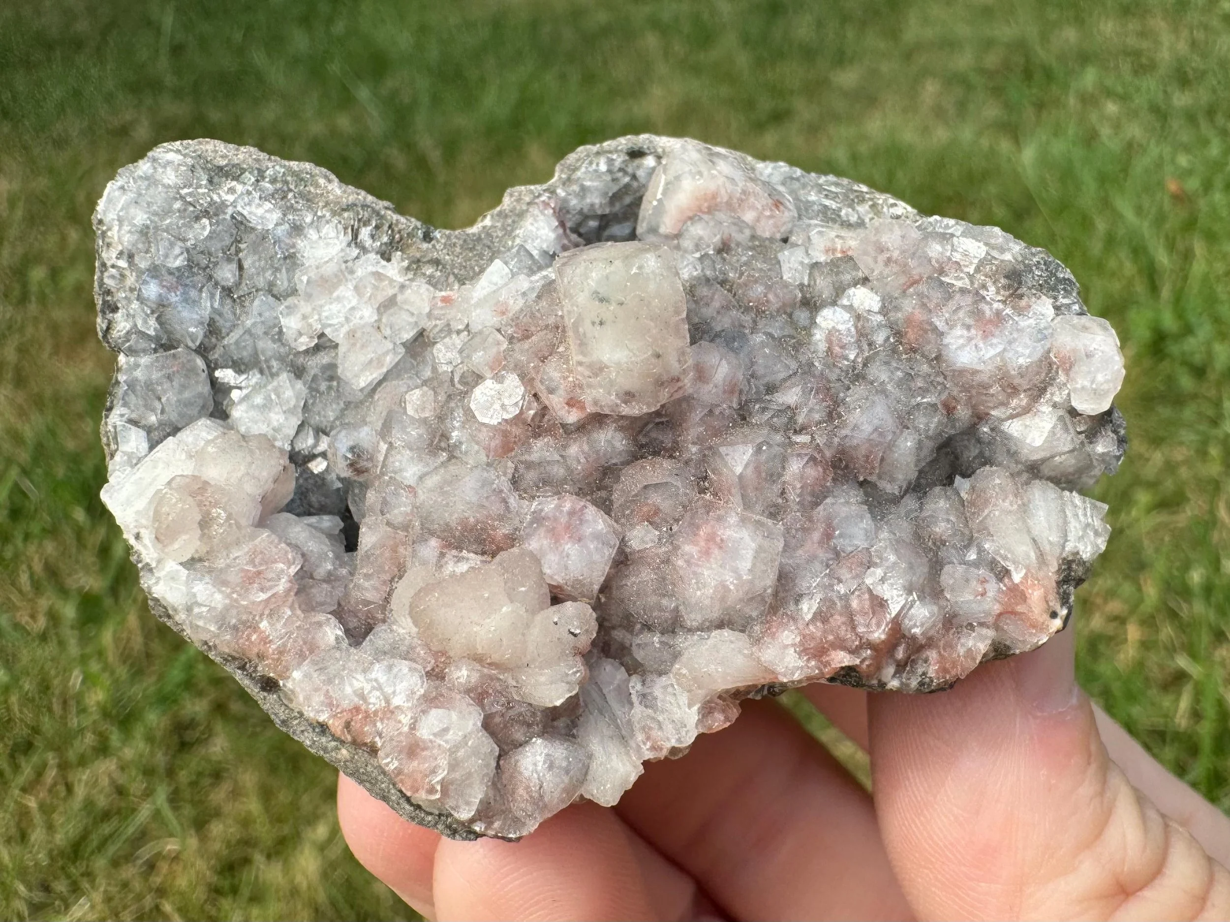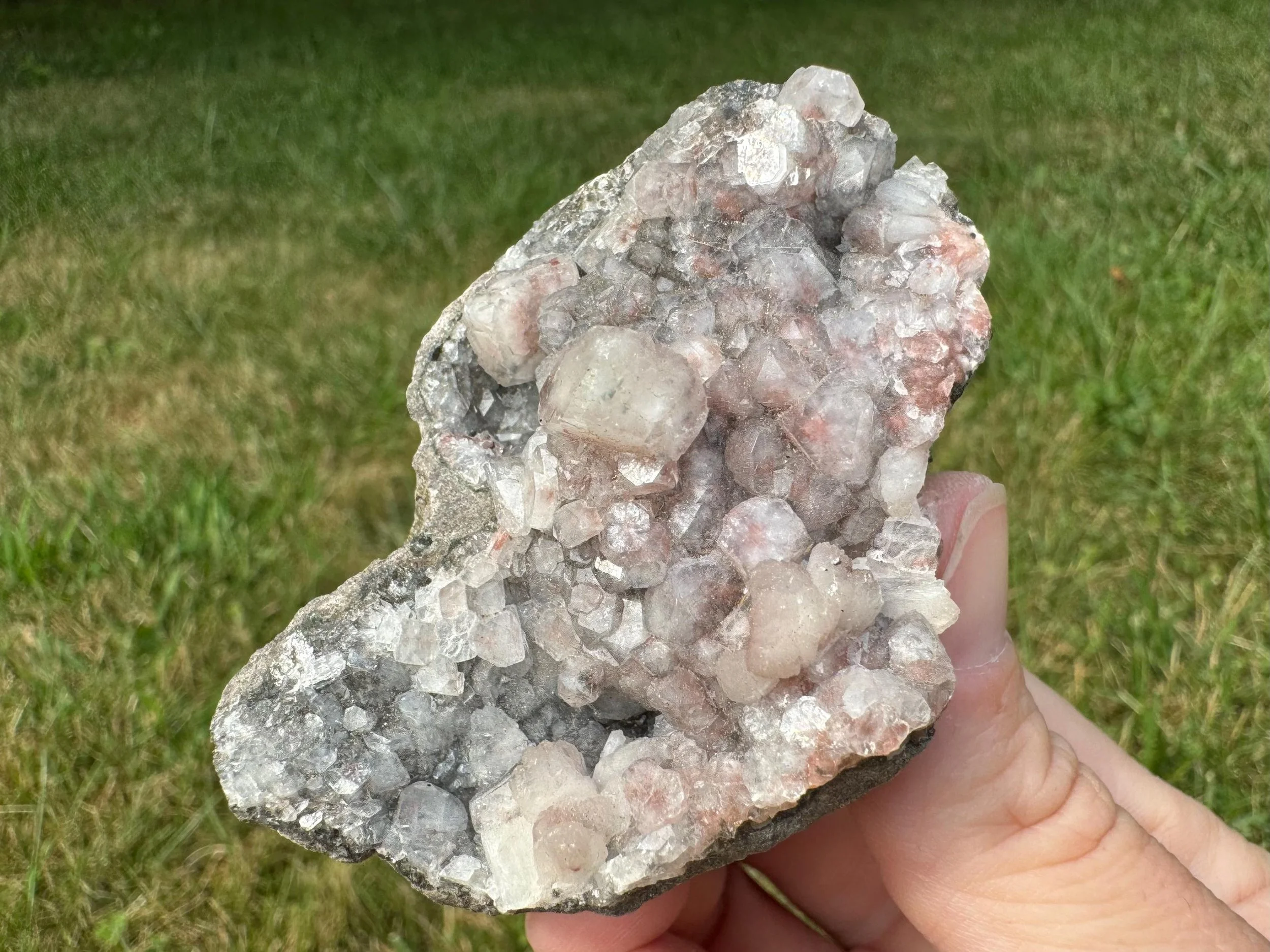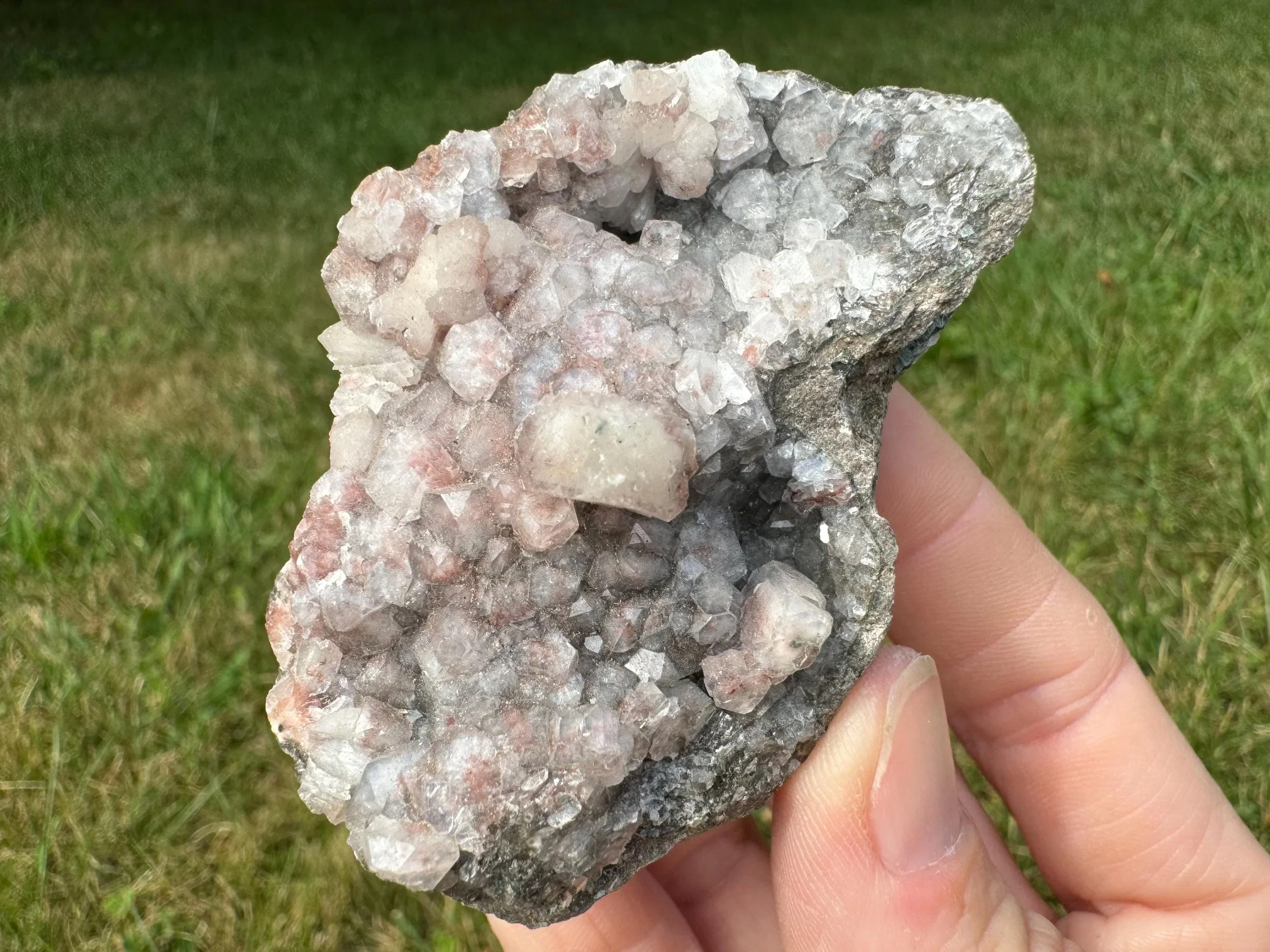 This is a cluster of Apophyllite cubes with red Hematite, plus light peach Stilbite crystals in a little geode. This is a mineral specimen from India. the red inside the clear Apophyllite looks really pretty, the crystals are mostly nice and lustrous with pink to dark red hematite coloring, with different amounts of the inclusion among the crystals. Some are more white than red. A nice little piece for home display, a gift for any rock lover, or a cute piece for an altar or crystal collection.