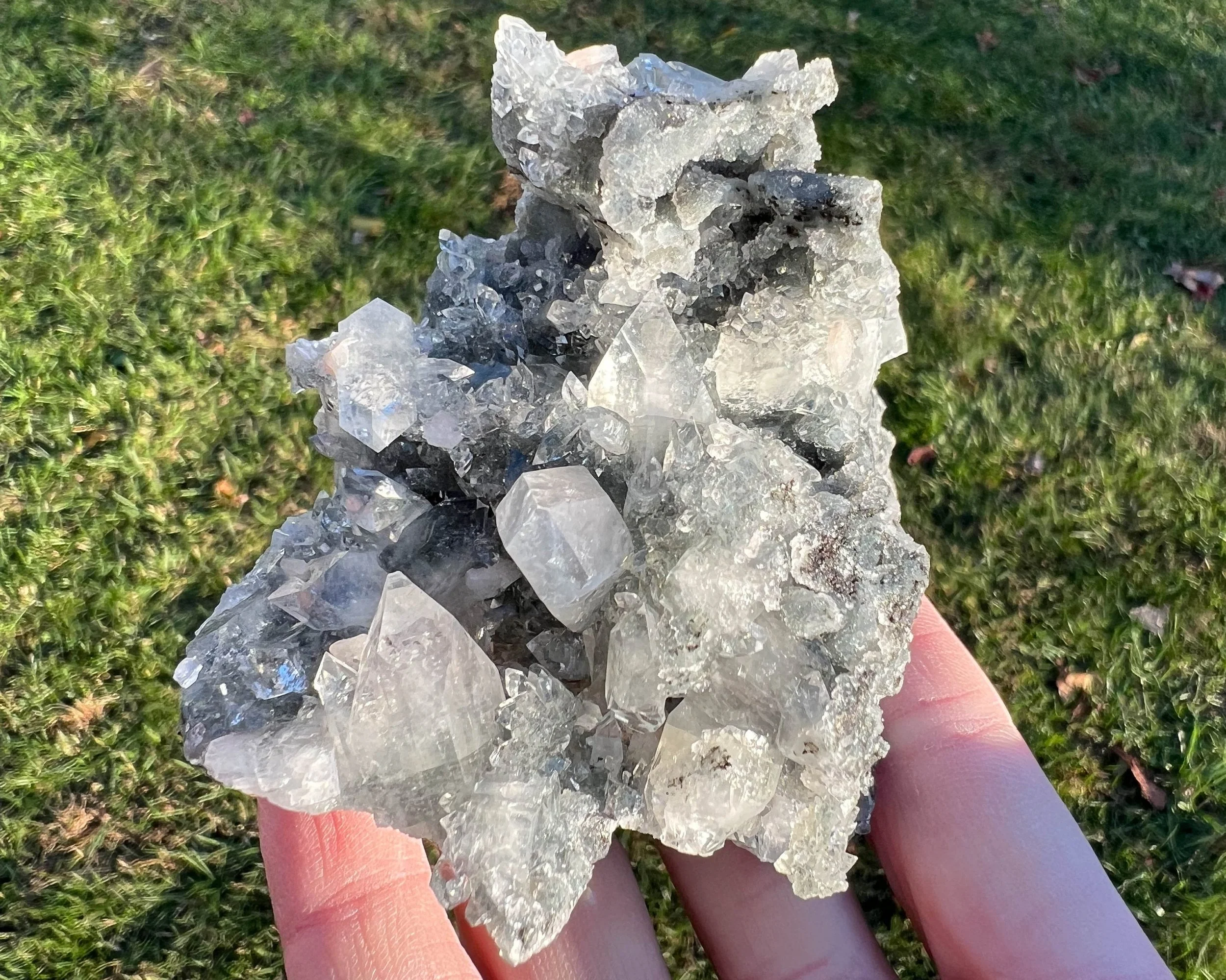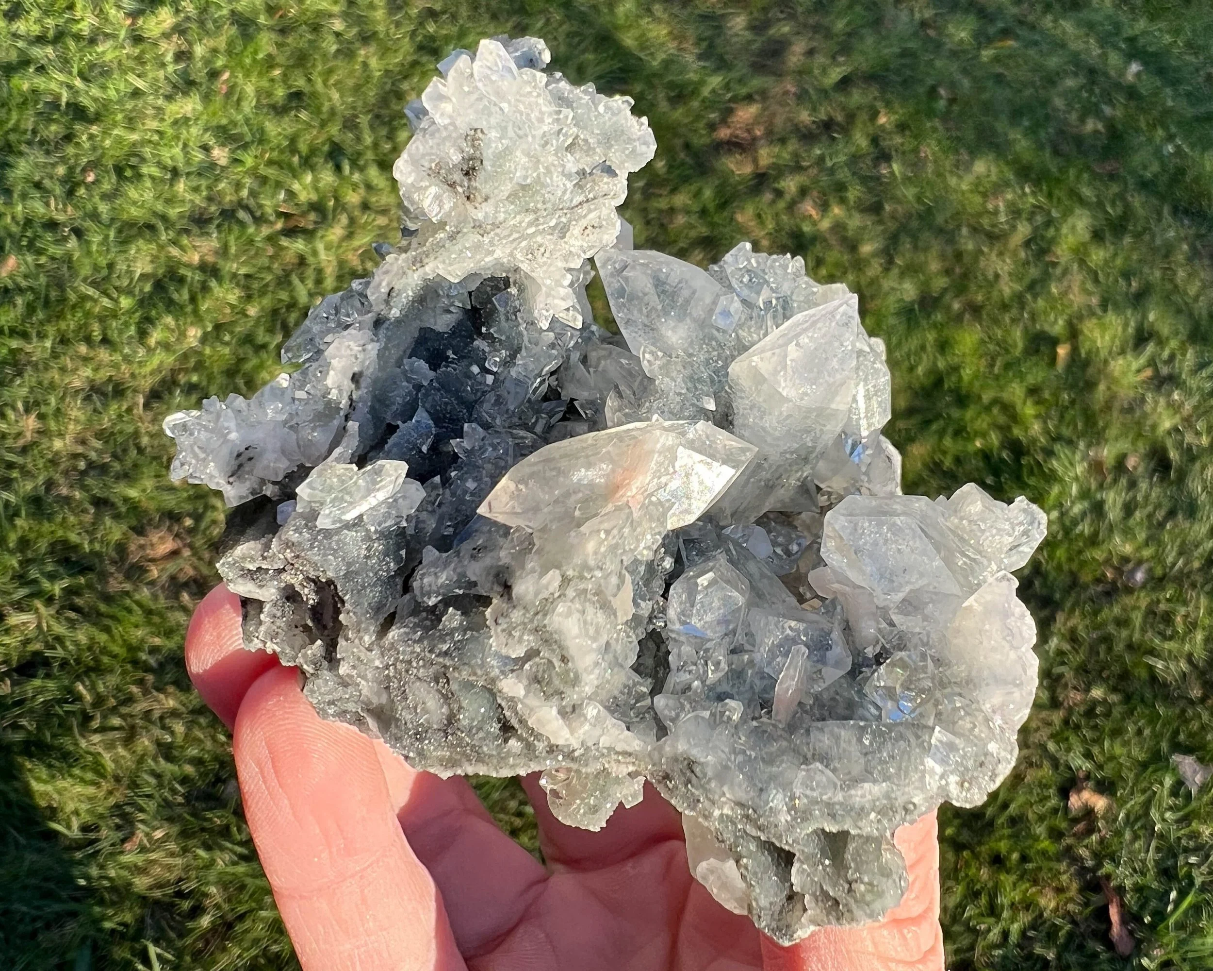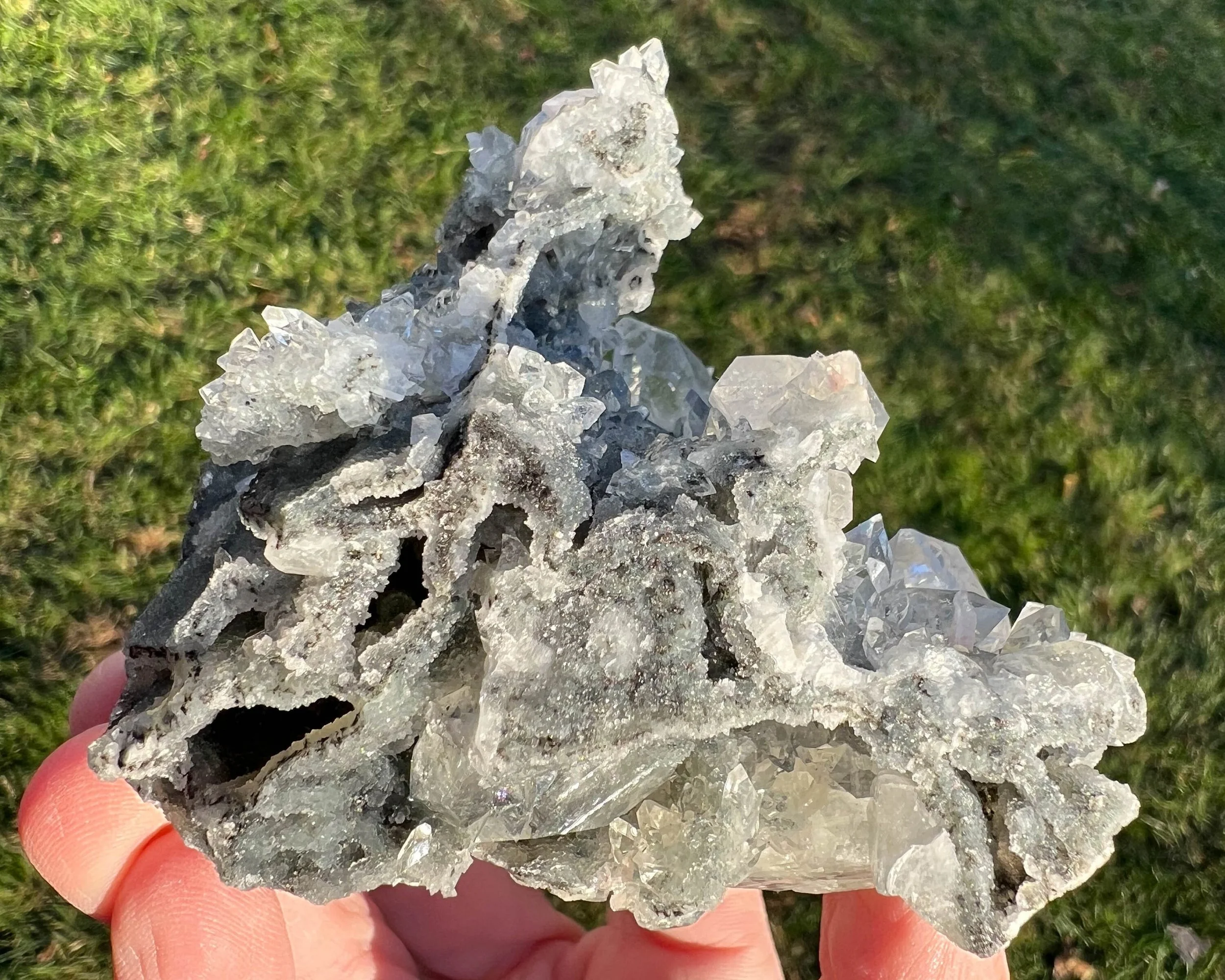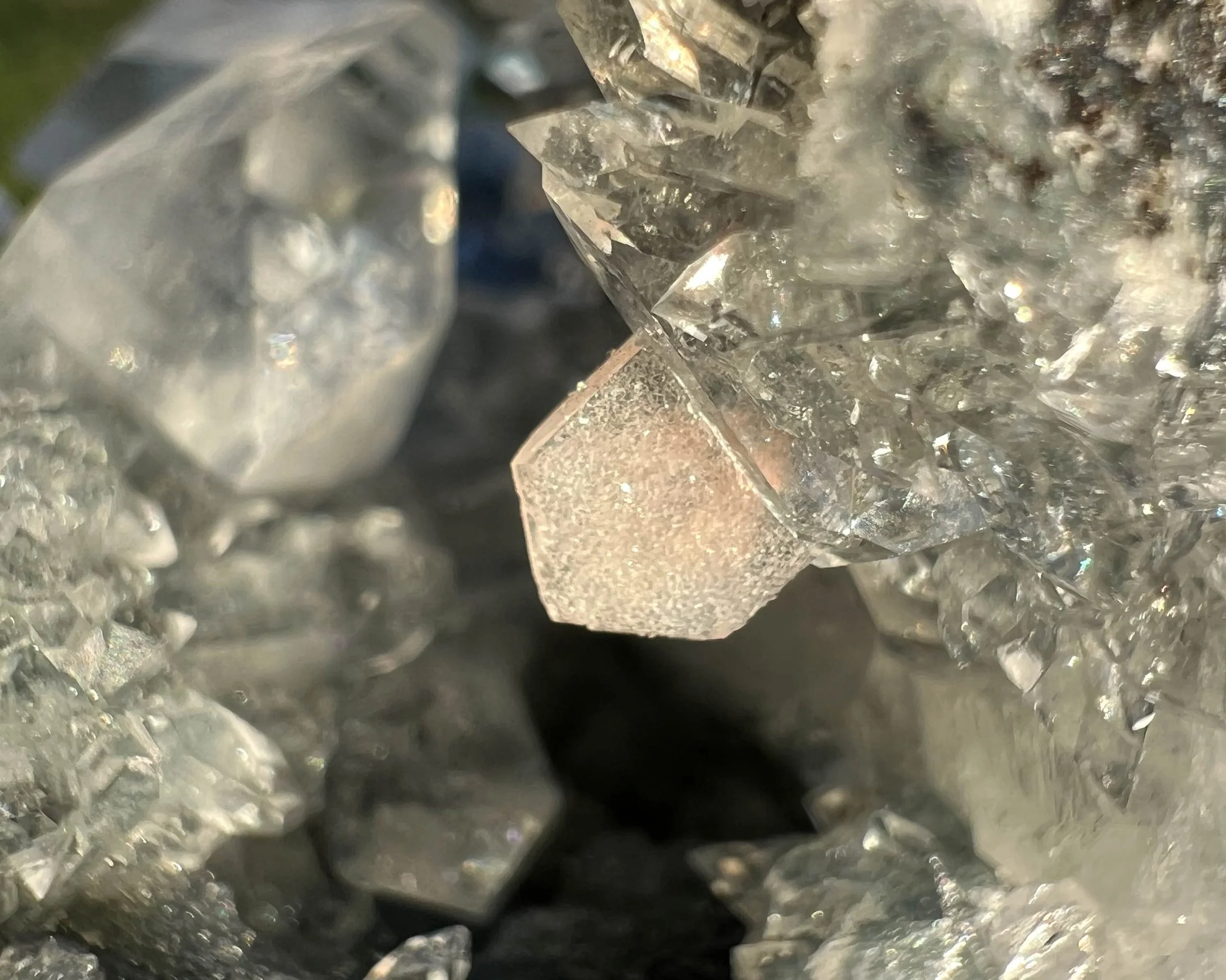 This is a crazy cluster of sparkling, glassy pointed diamond Apophyllite crystals with pretty peachy pink Stilbite crystals, on Black Chalcedony stalactites coated in Druzy Quartz. The Apophyllite has rainbows in it and reflects lots of light. The whole thing is very sparkly and funky from all different angles - there is no way to do it justice in a photo, it is really beautiful.